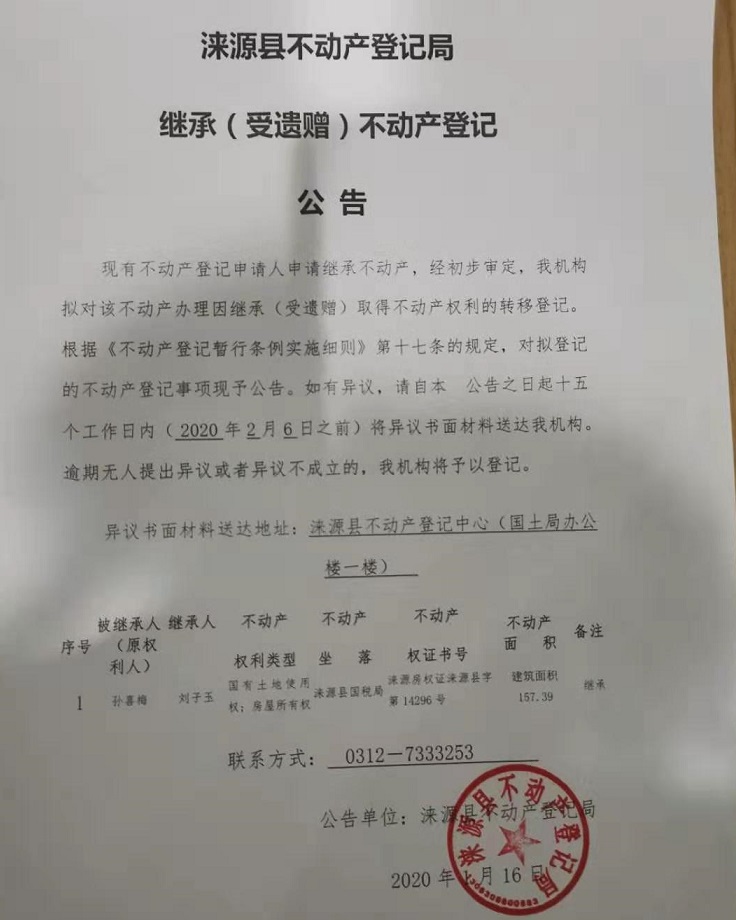 涞源县不动产登记局继承(受遗赠)不动产登记公告