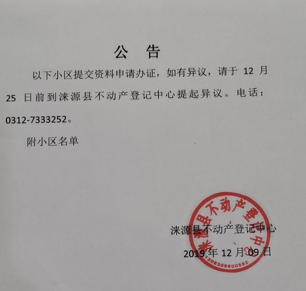 涞源县不动产登记中心公告