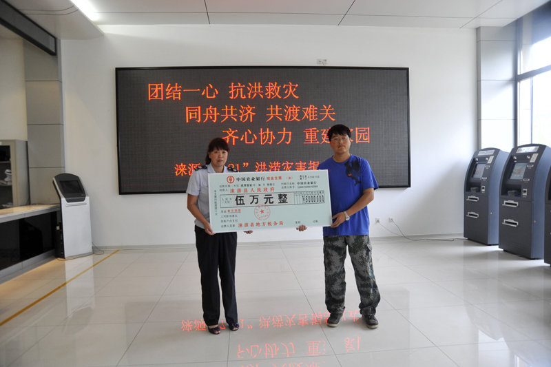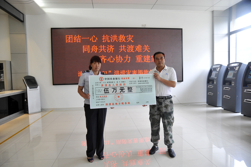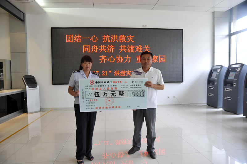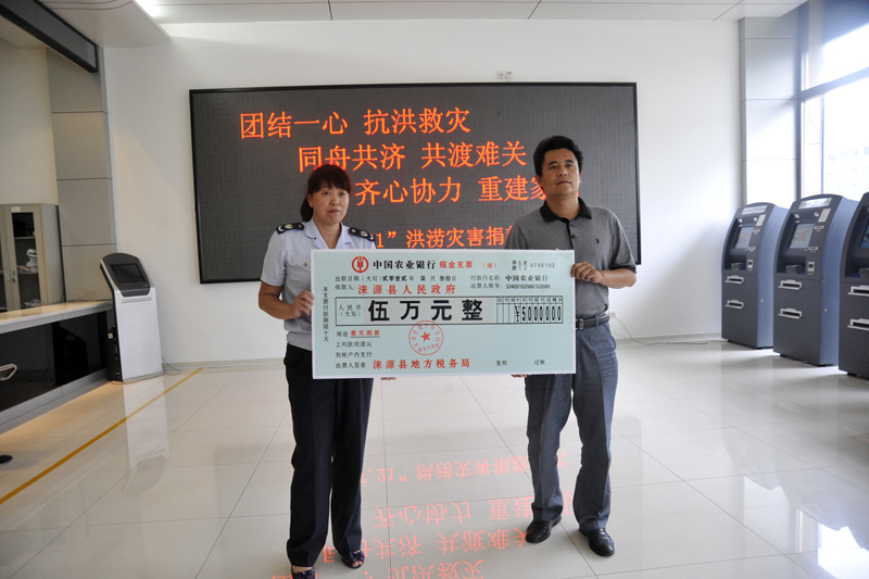 | 7月31日,涞源县地税局为受灾严重的乡镇举行“团结一心、抗洪救灾、同舟共济、共渡难关、齐心协力、共建家园涞源‘7.21’洪涝灾害捐款仪式” | ||||