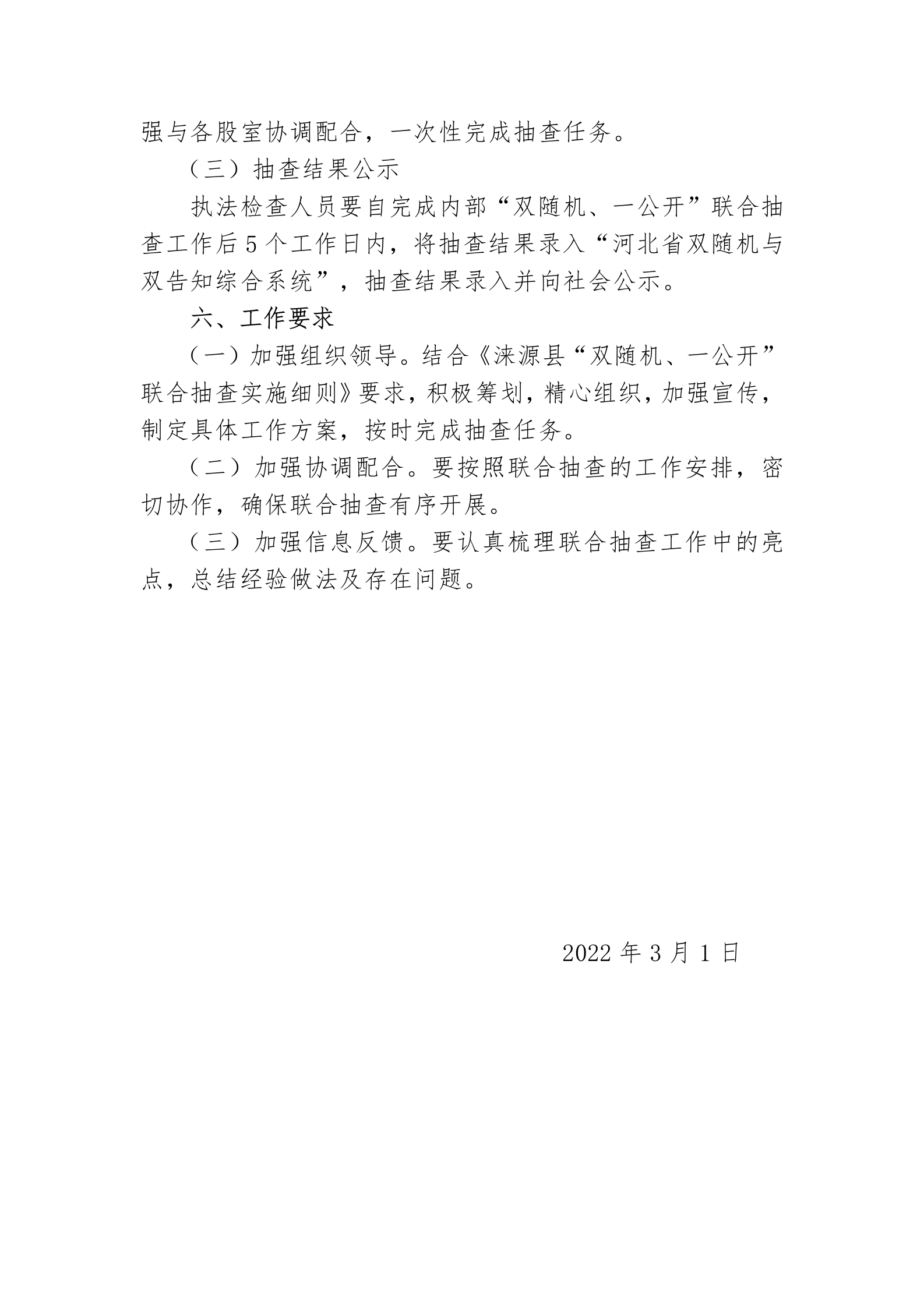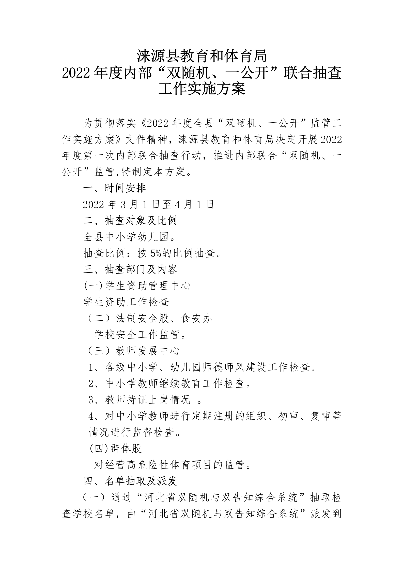 涞源县教育和体育局关于印发《2022年度内部“双随机、一公开”联合抽查工作实施方案》的通知