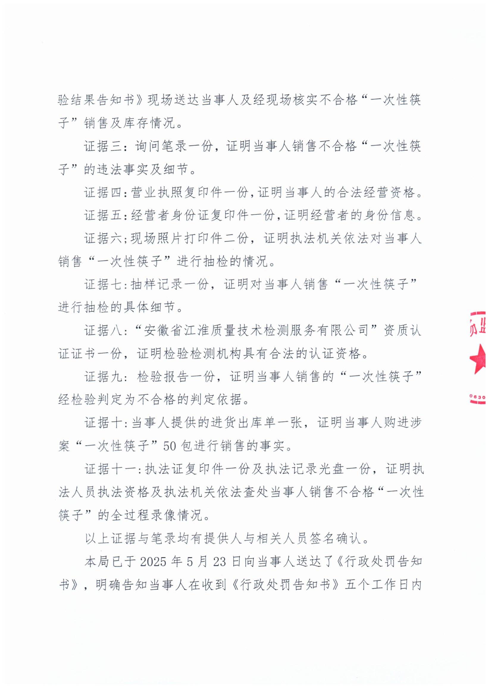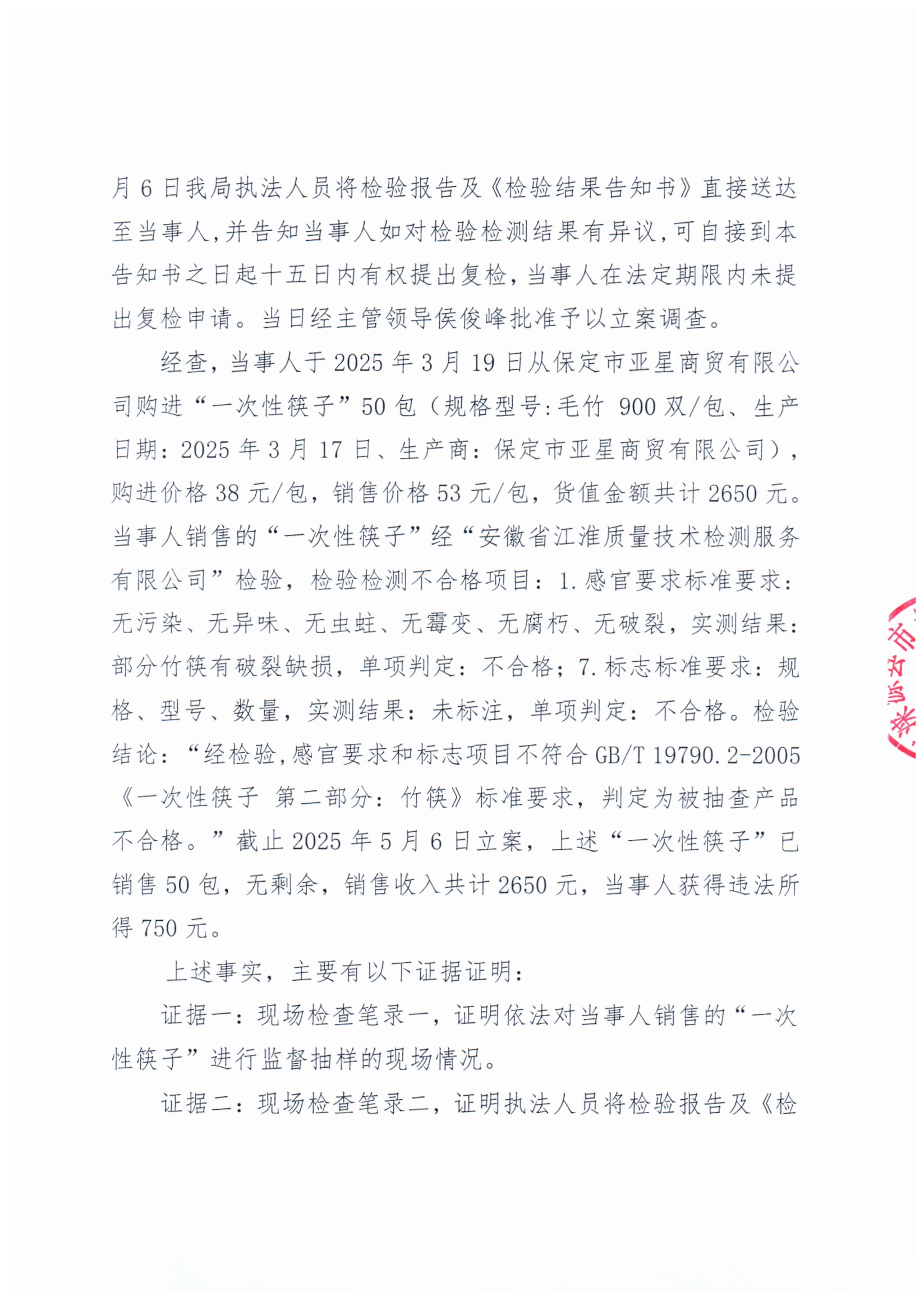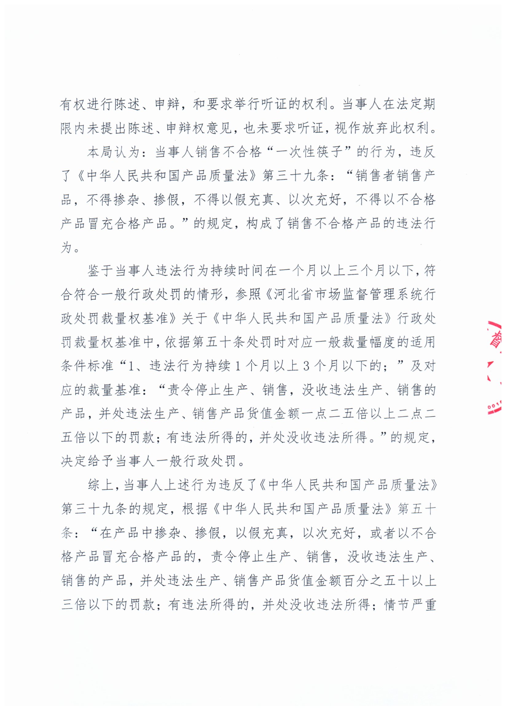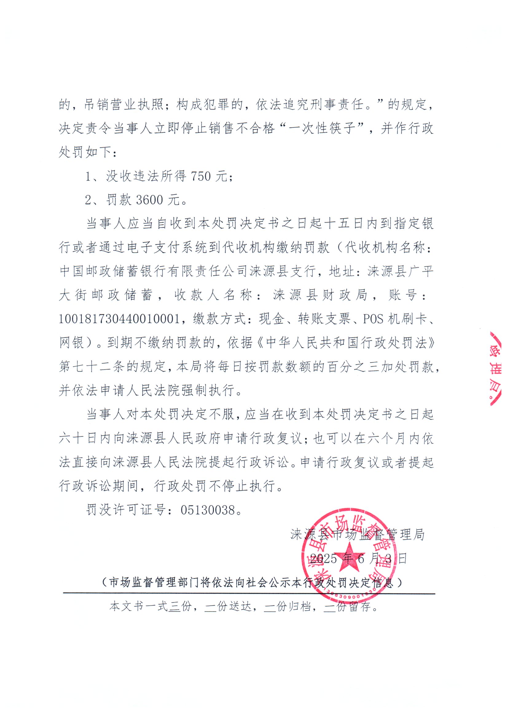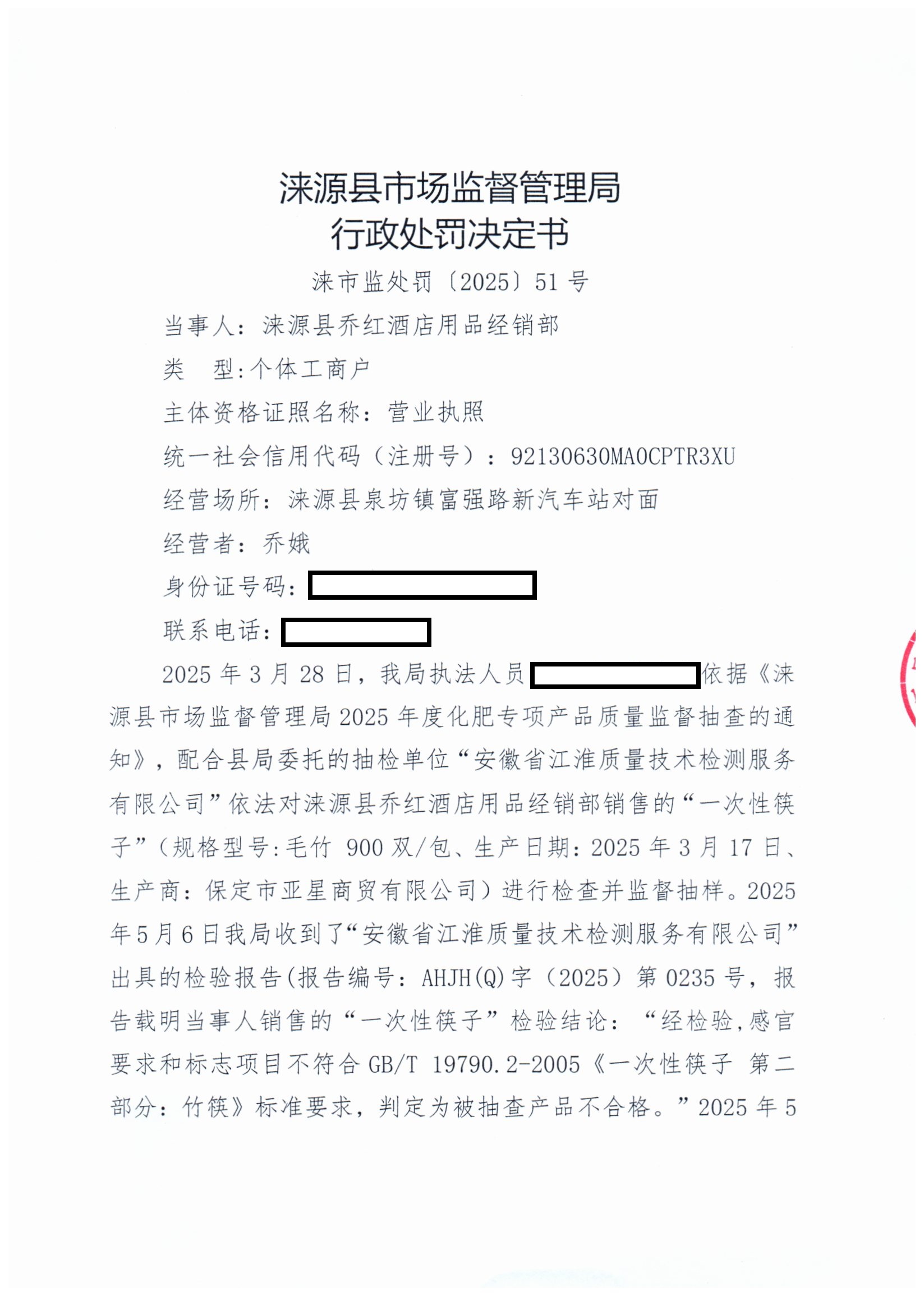 涞市监处罚〔2025〕51号 涞源县乔红酒店用品经销部销售不合格“一次性筷子”案