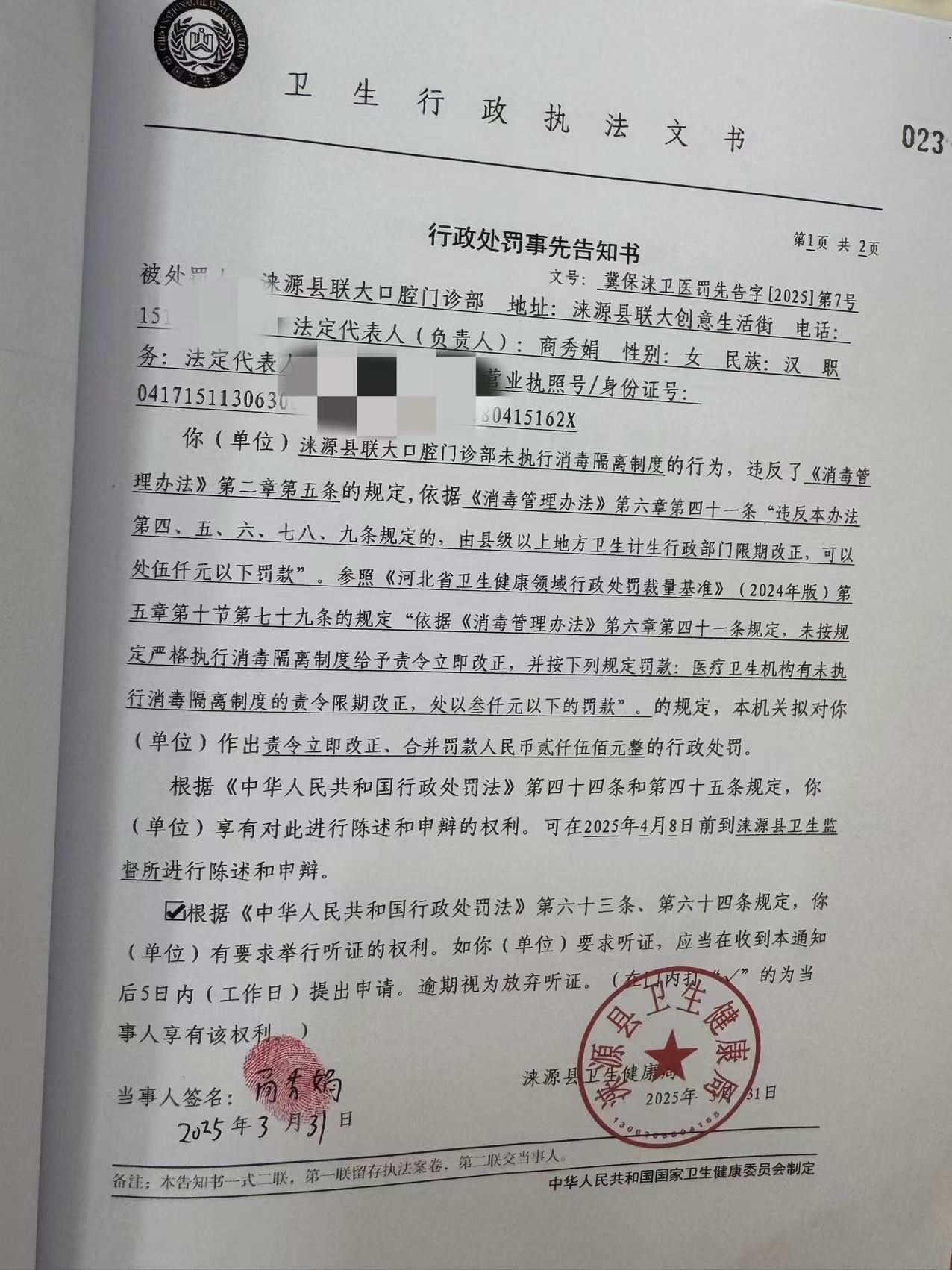 冀保涞卫医罚决字【2025】第7号涞源县联大口腔门诊违反《消毒管理办法》案