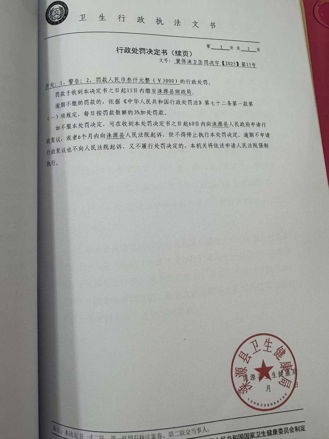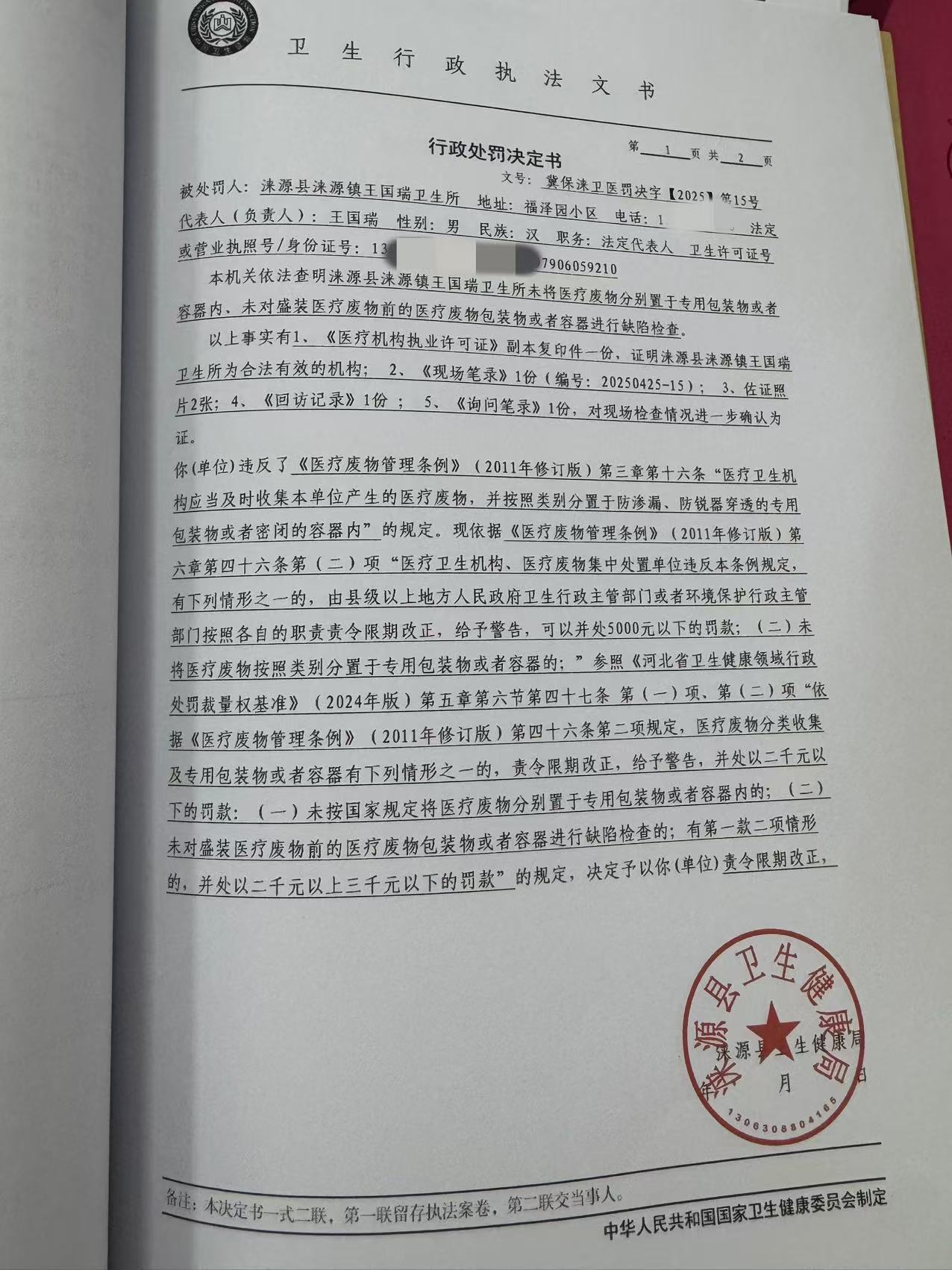 冀保涞卫医罚决字【2025】第15号涞源县涞源镇王国瑞卫生所违反《医疗废物管理条例》案