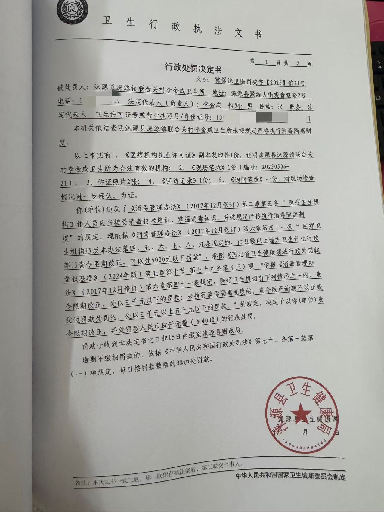 冀保涞卫医罚决字【2025】第21号涞源县联合关村李金成卫生所违反《消毒管理办法》案