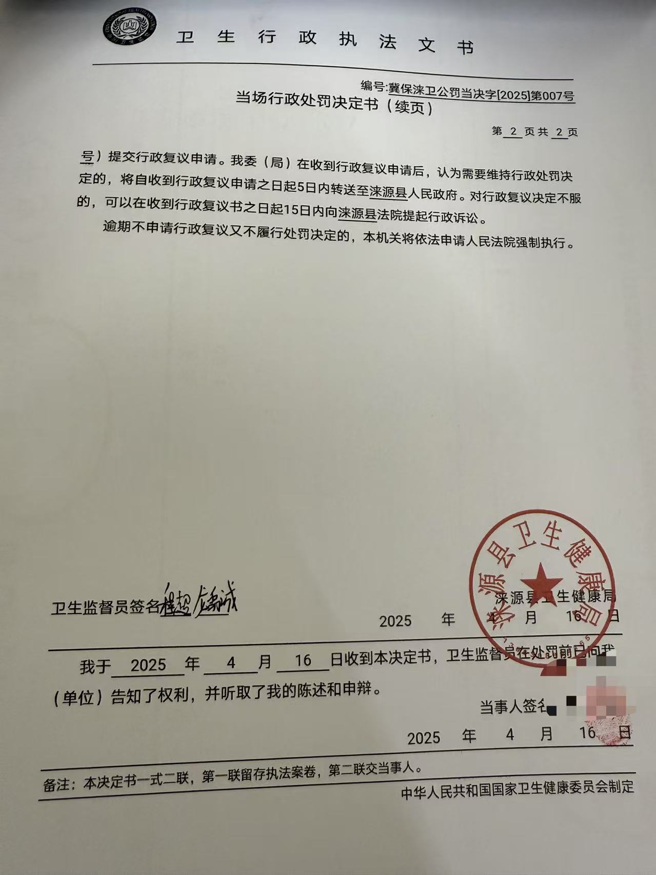 冀保涞卫公罚当决字【2025】第007号顶头尚丝理发店违反《公共场所卫生管理条例》案