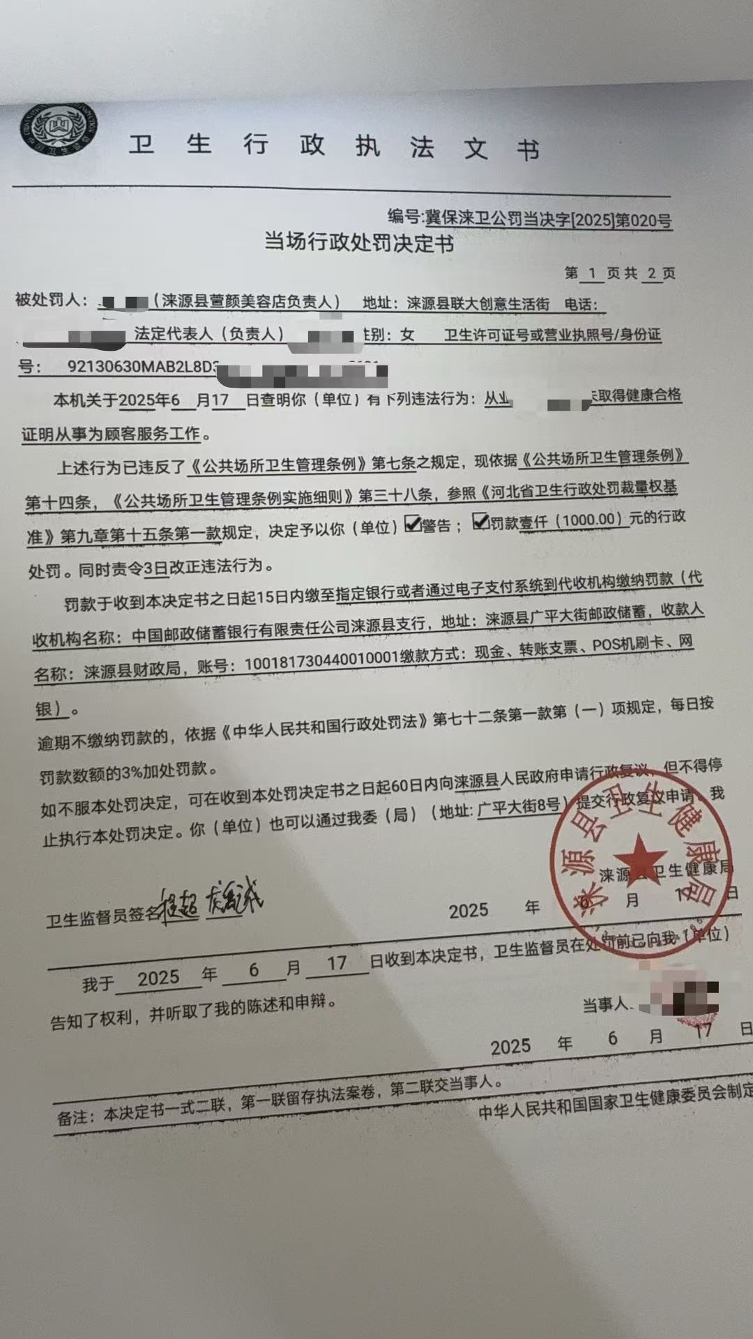 冀保涞卫公罚当决字【2025】第020号涞源县萱颜美容店违反《公共场所卫生管理条例》案