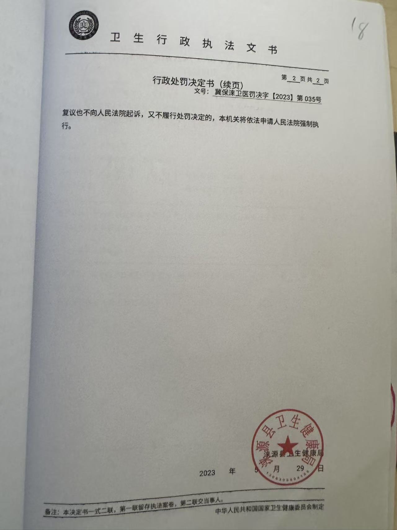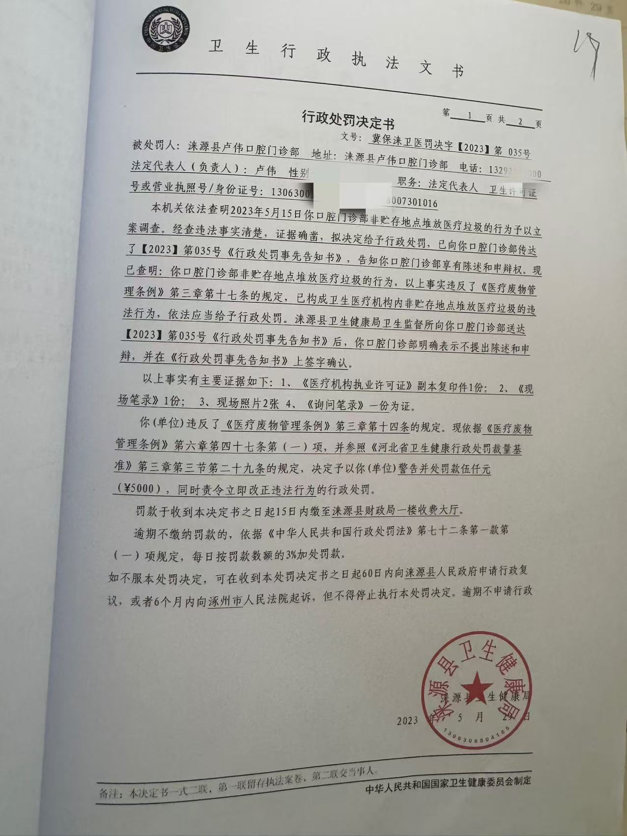 冀保涞卫医罚决字【2023】第035号涞源县卢伟口腔门诊违反《医疗废物管理条例》案