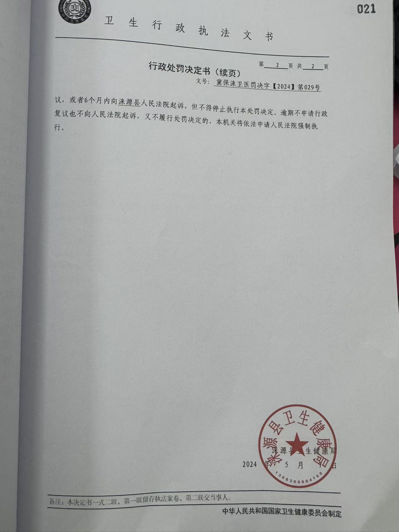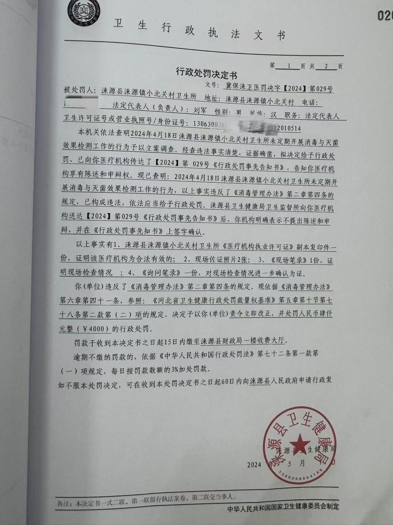 冀保涞卫医罚决字【2024】第029号涞源县涞源镇小北关卫生所违反《消毒管理办法》案