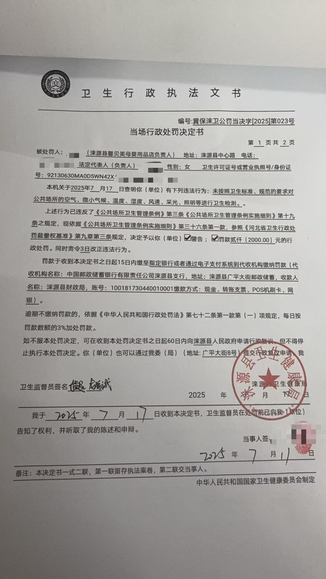 冀保涞卫公罚当决字【2025】第023号涞源县馨贝美母婴用品店违反《公共场所卫生管理条例》案
