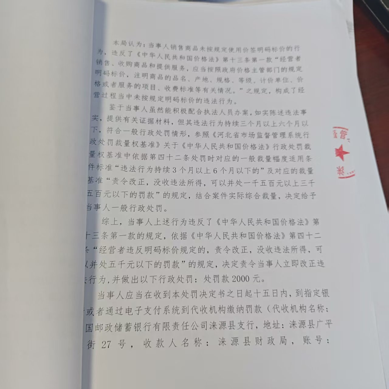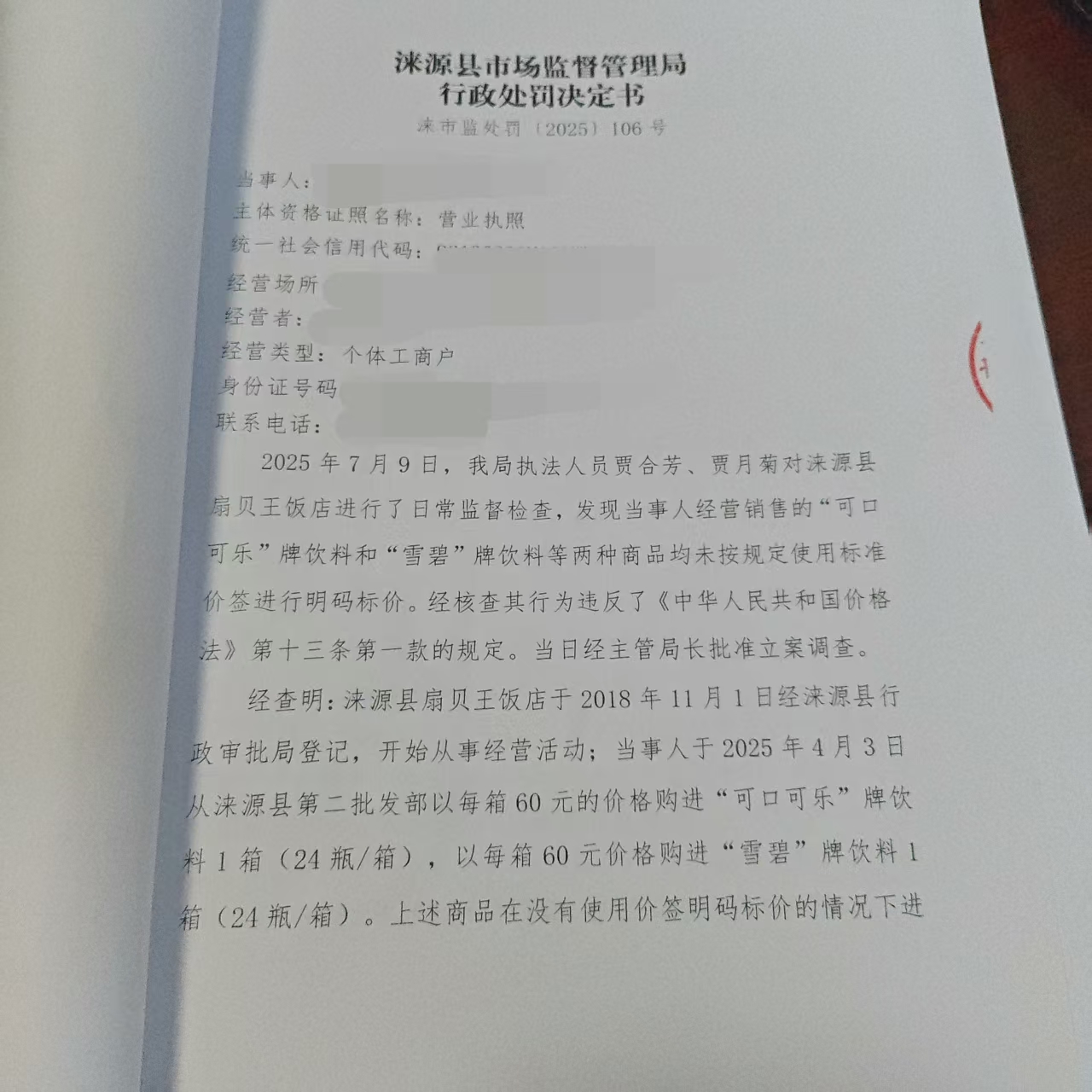 涞市监处罚〔2025〕106号涞源县扇贝王饭店未按规定执行明码标价案