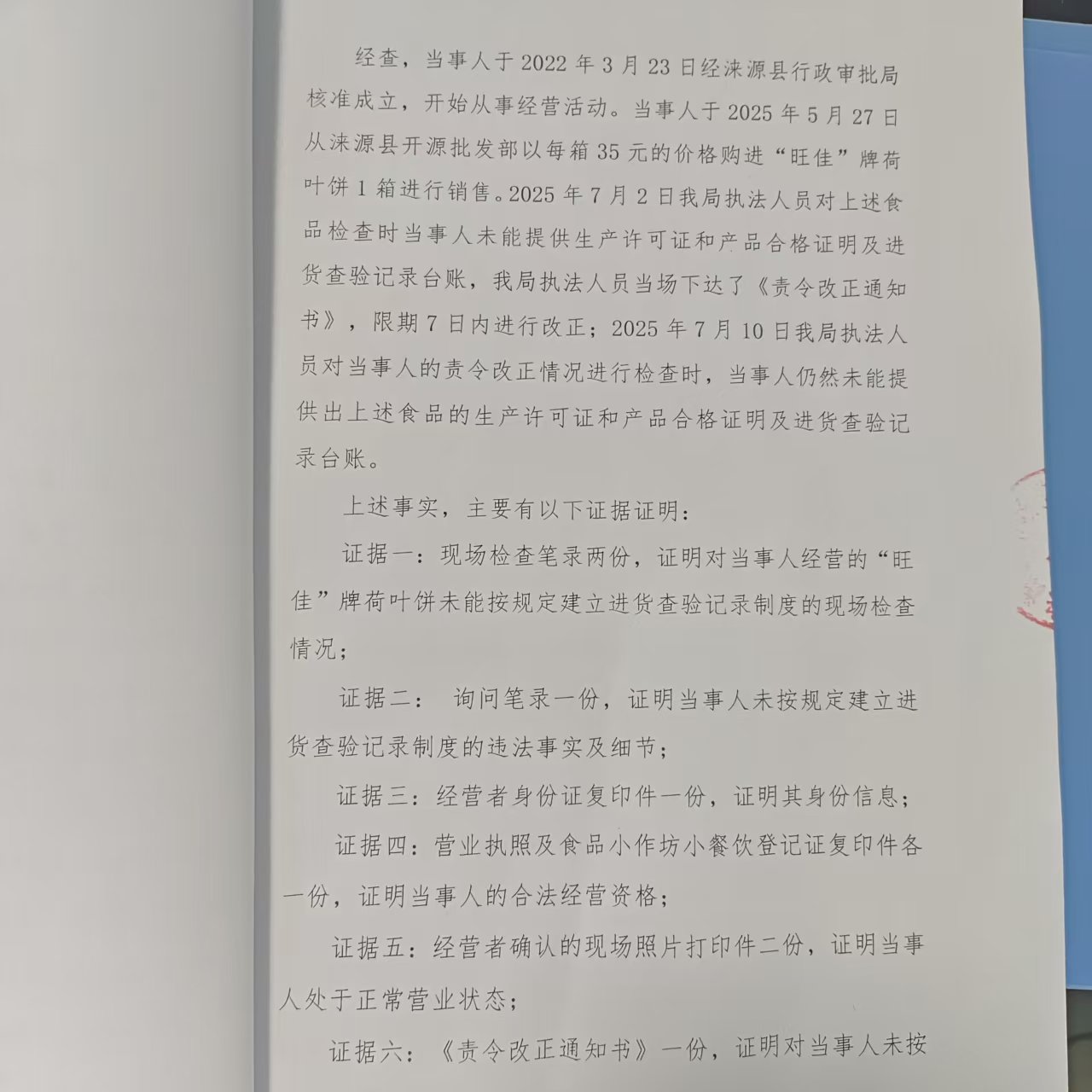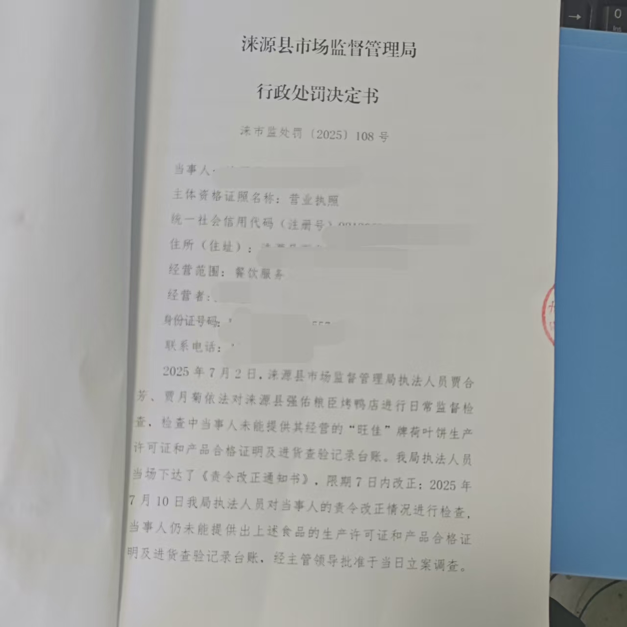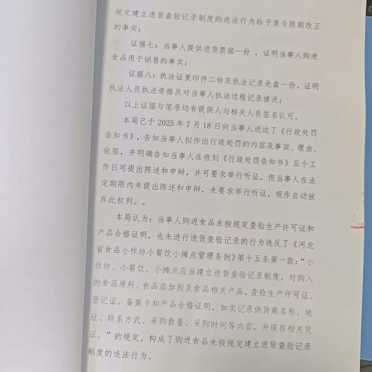 涞市监处罚〔2025〕108号涞源县强佑粮臣烤鸭店购进食品未按规定建立进货查验记录制度案