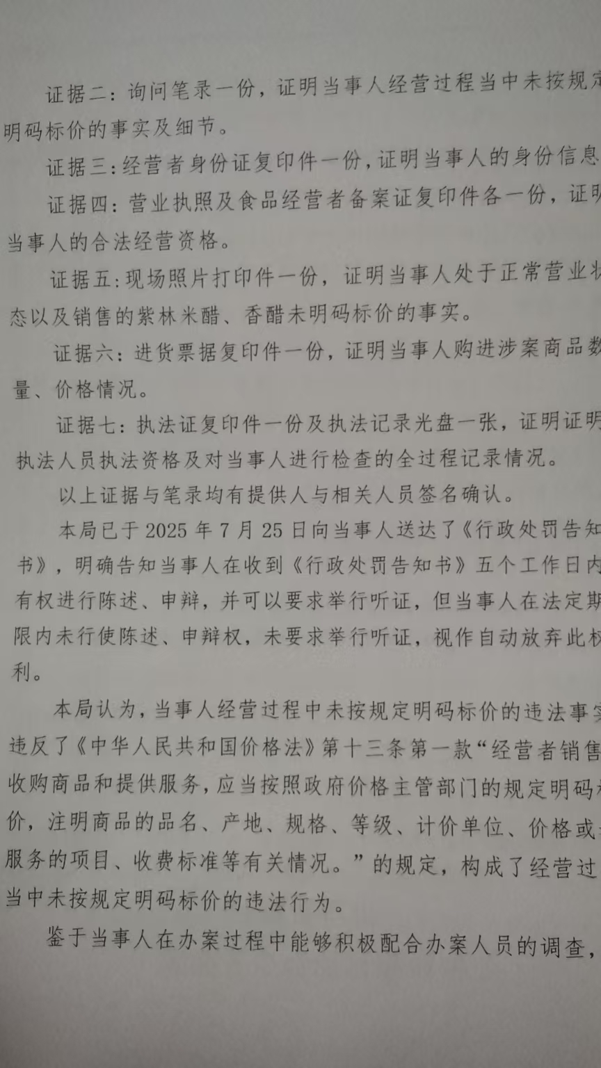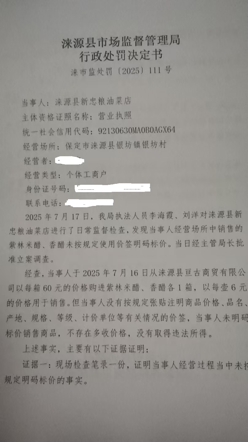 涞市监处罚〔2025〕 111号涞源县新忠粮油菜店未按规定明码标价案
