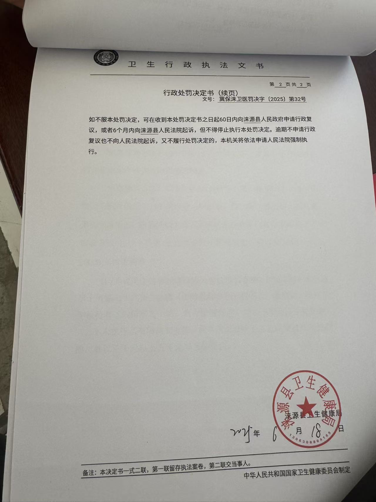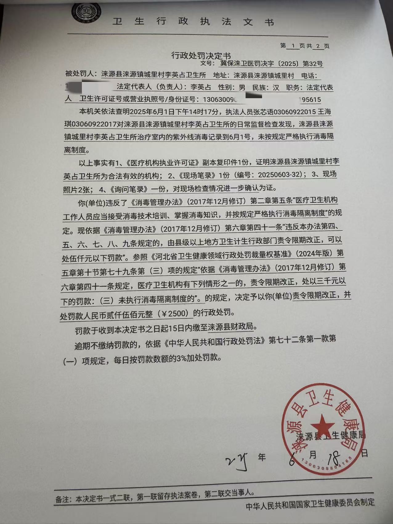 冀保涞卫医罚决字【2025】第32号涞源县涞源镇城里村李英占卫生所违反《消毒管理办法》案