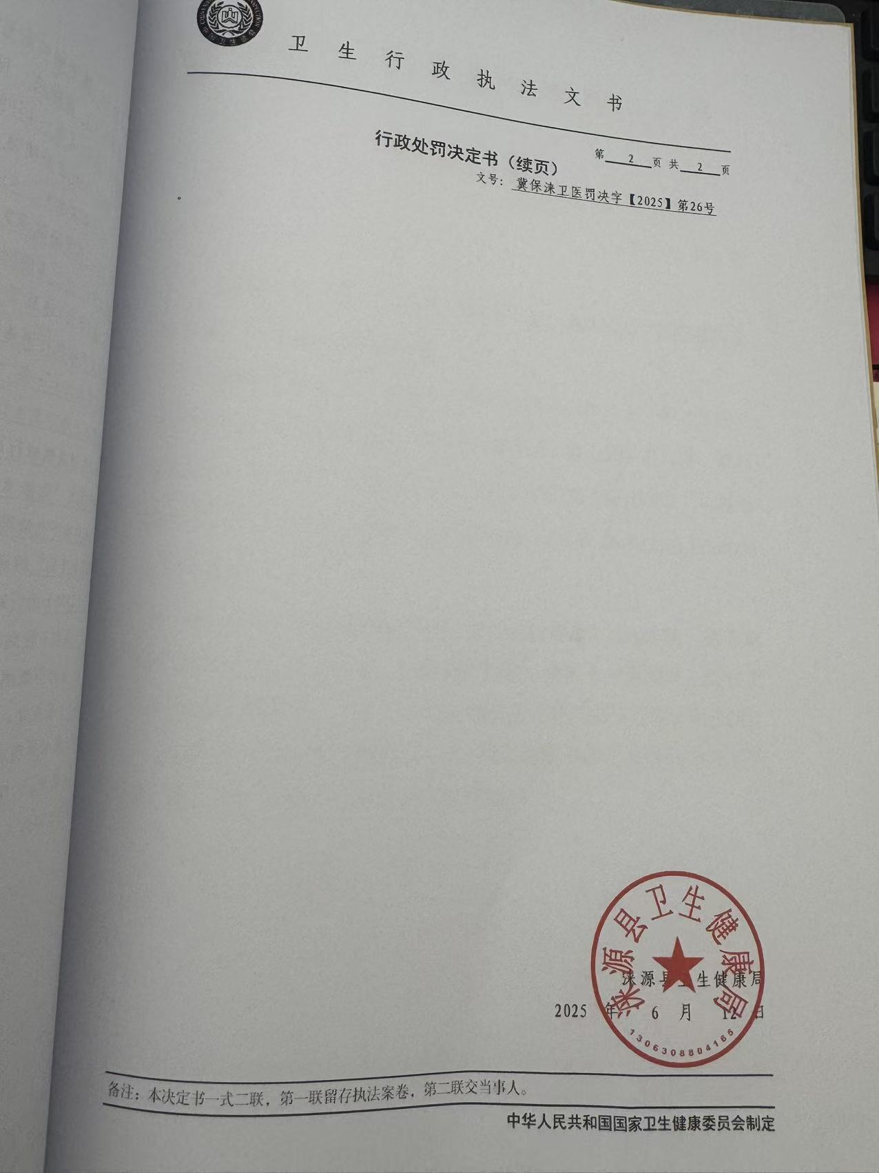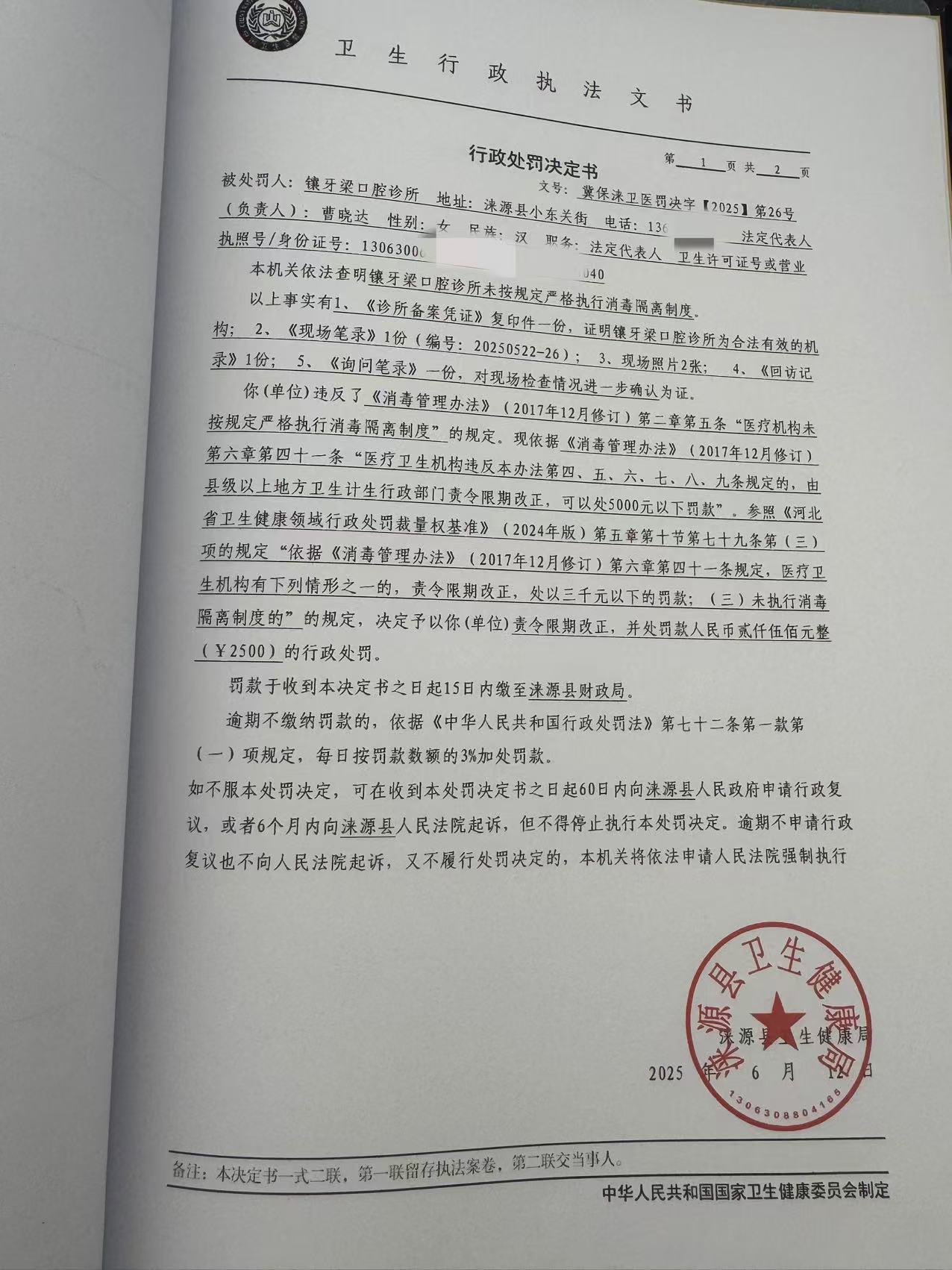 冀保涞卫医罚决字【2025】第26号涞源县镶牙梁口腔诊所违反《消毒管理办法》案