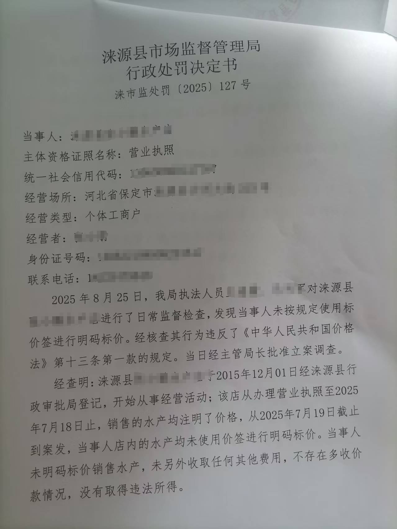涞市监处罚〔2025〕127号,涞源县张小鹏水产店未按规定明码标价案