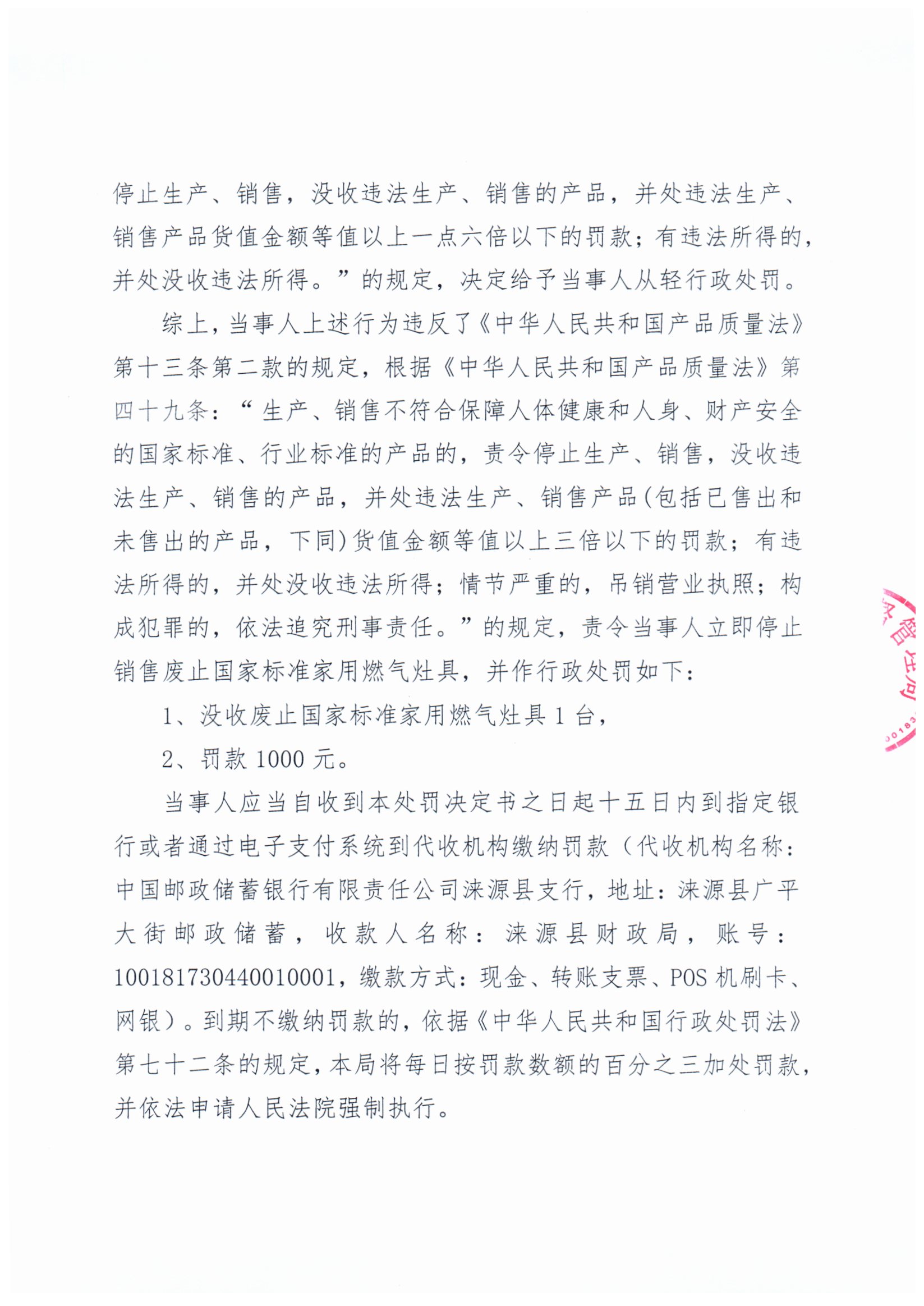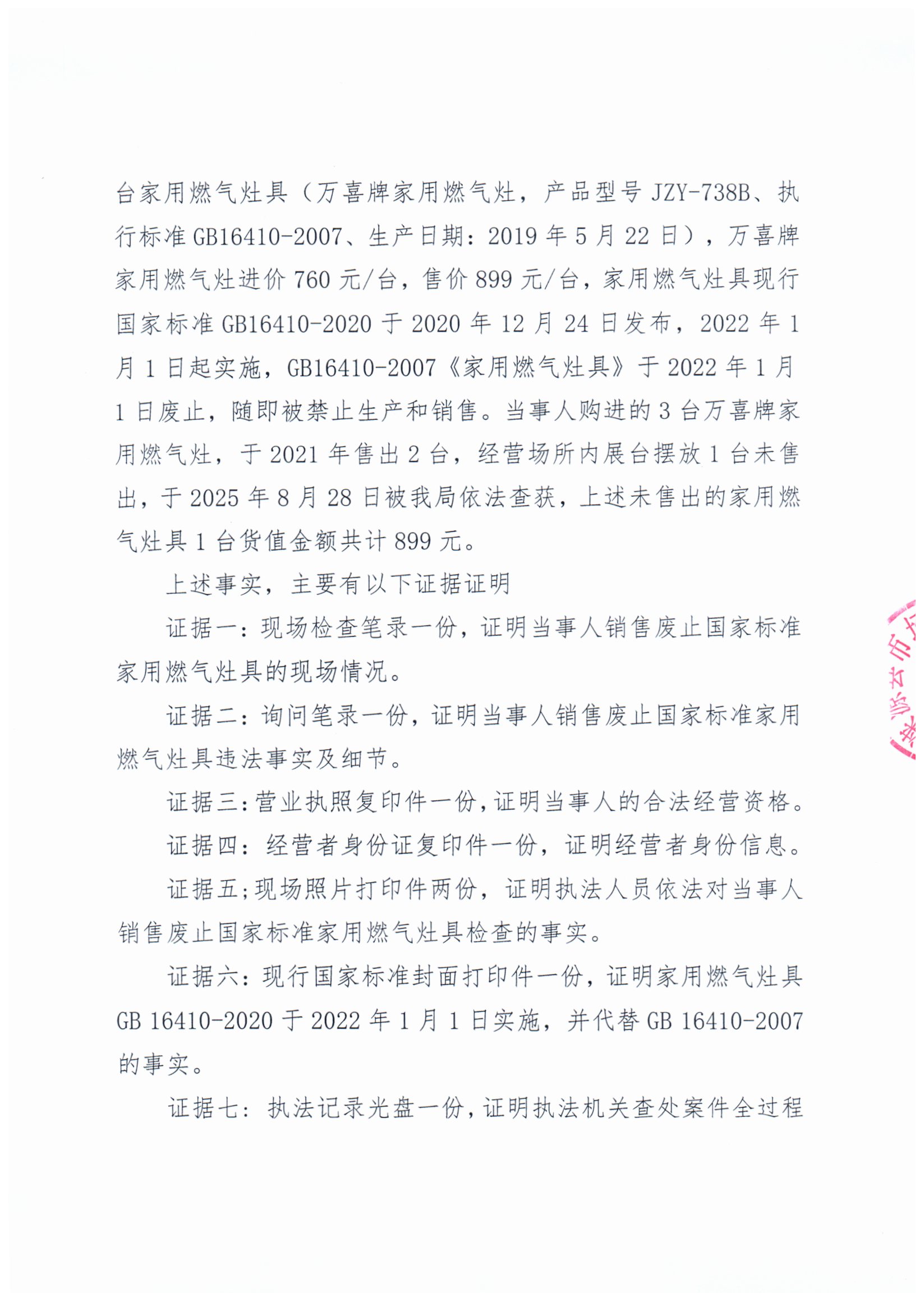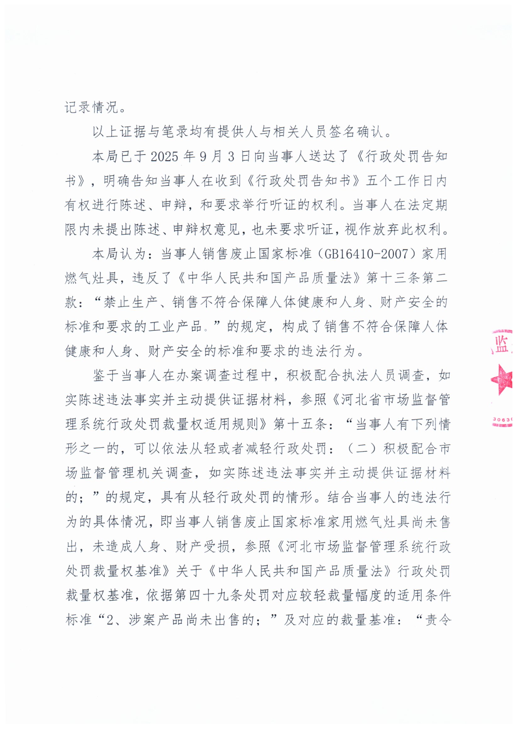 涞市监处罚〔2025〕132号 涞源县航鑫五金建材城销售废止国家标准家用燃气灶案