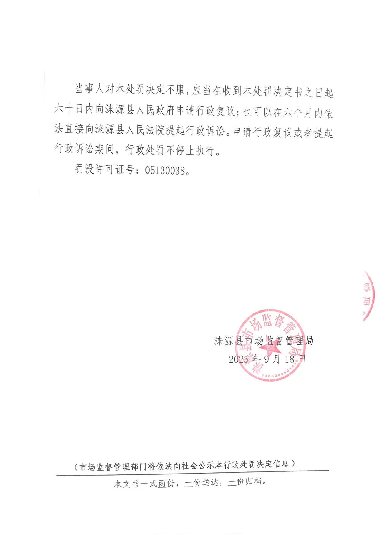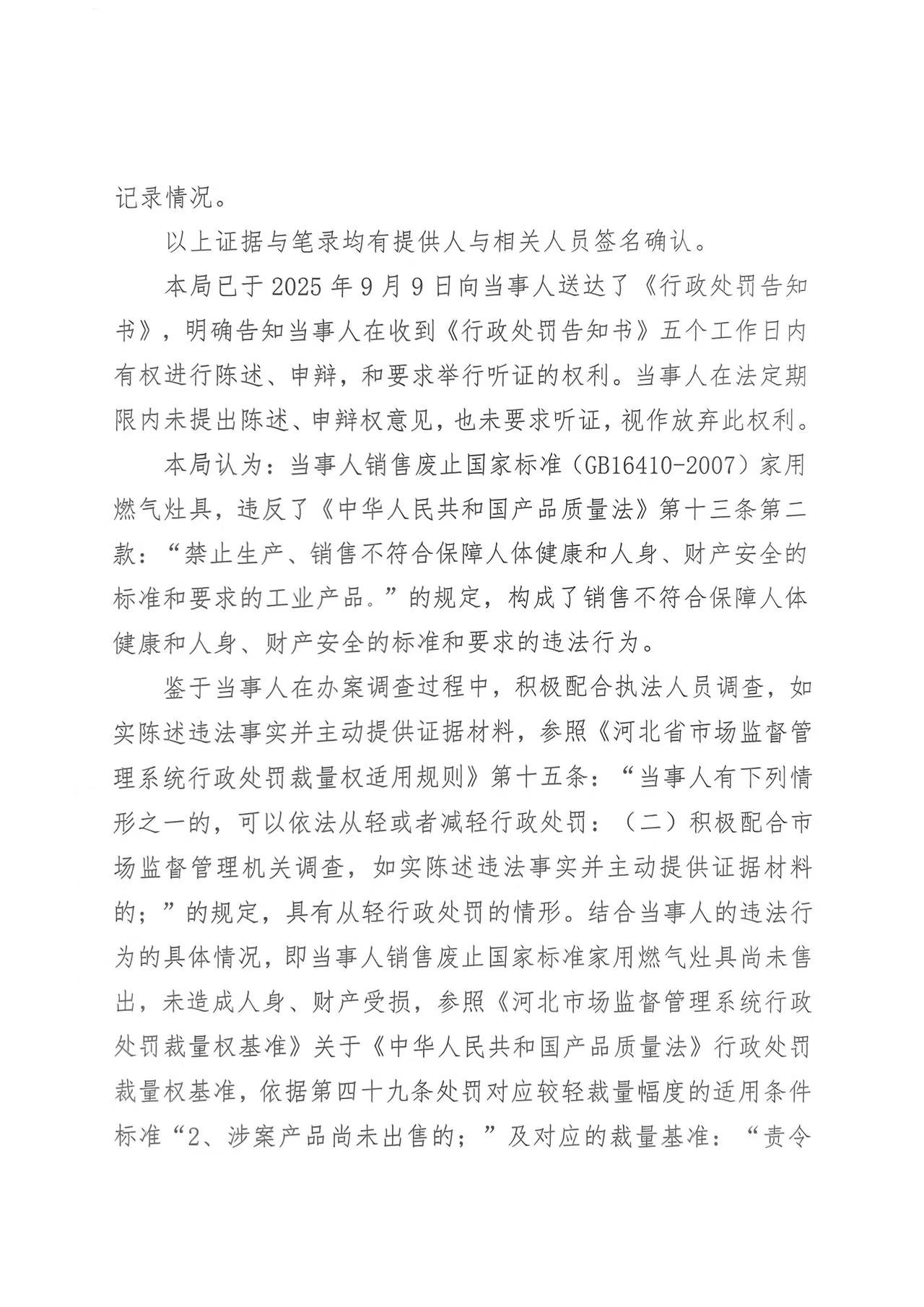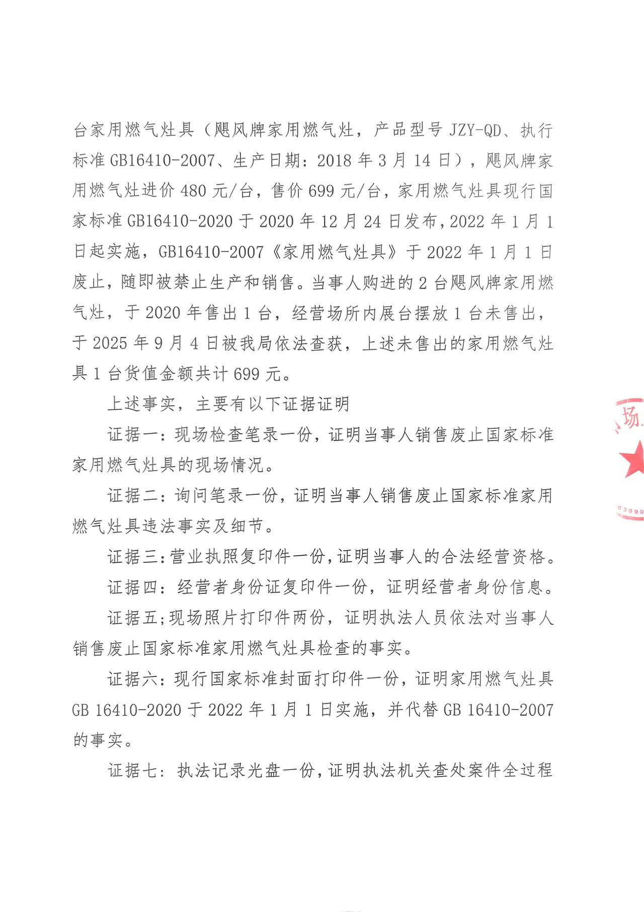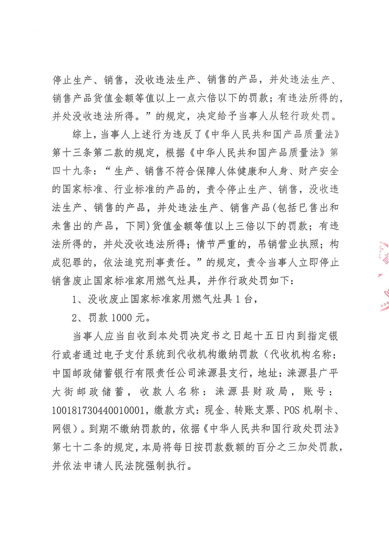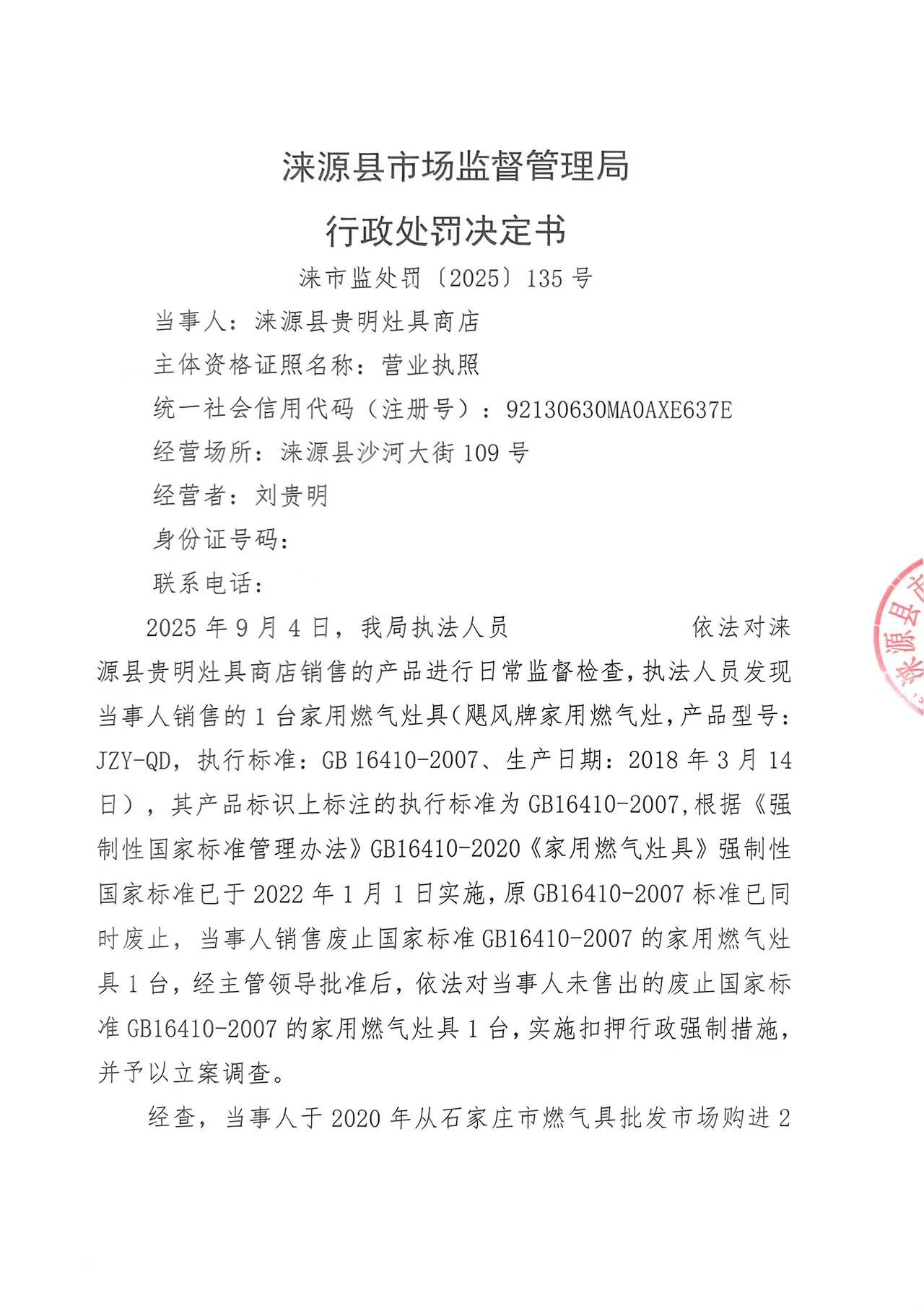 涞市监处罚 〔2025〕135号 涞源县贵明灶具店 销售废止国家标准的家用燃气灶具案