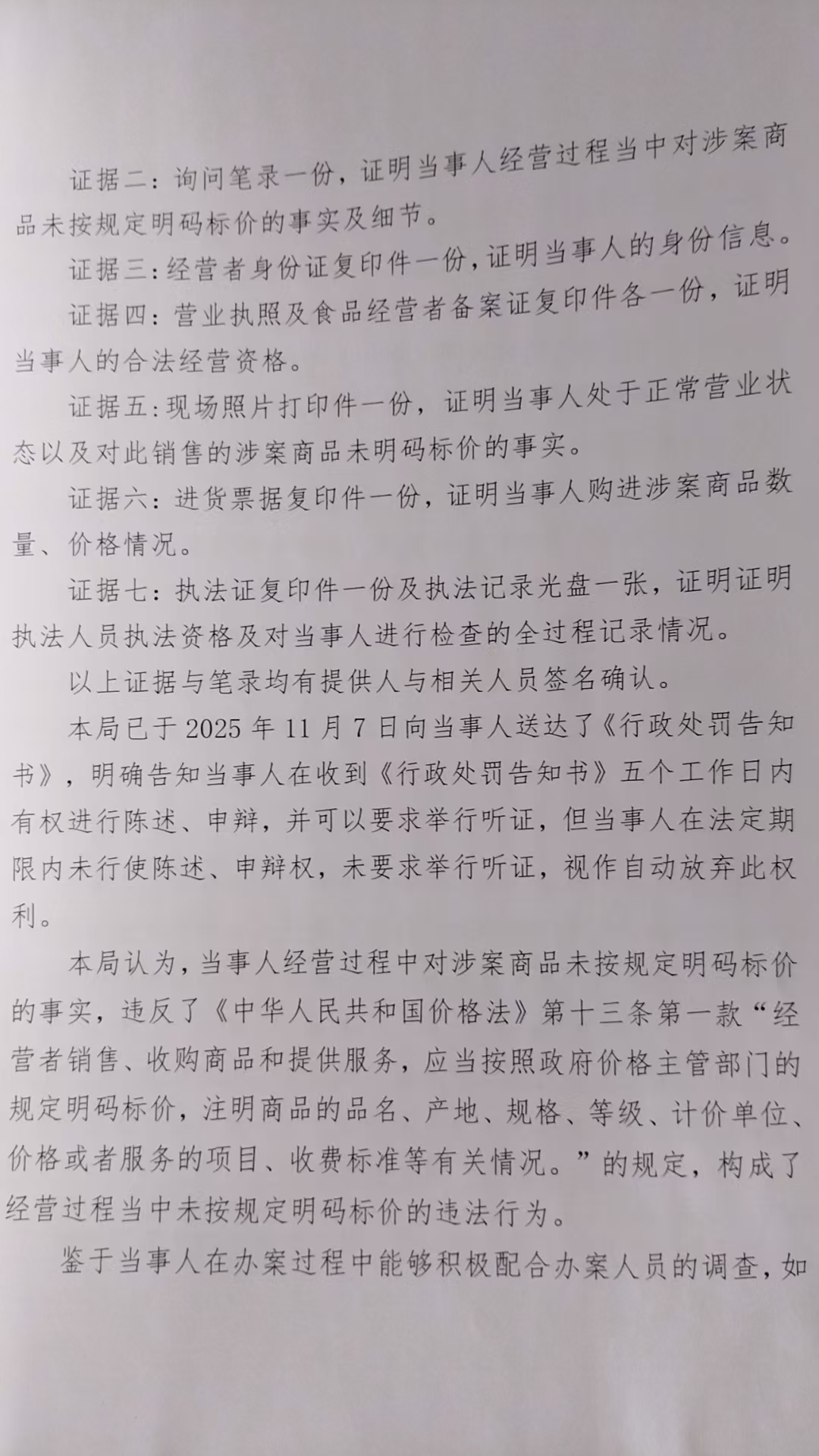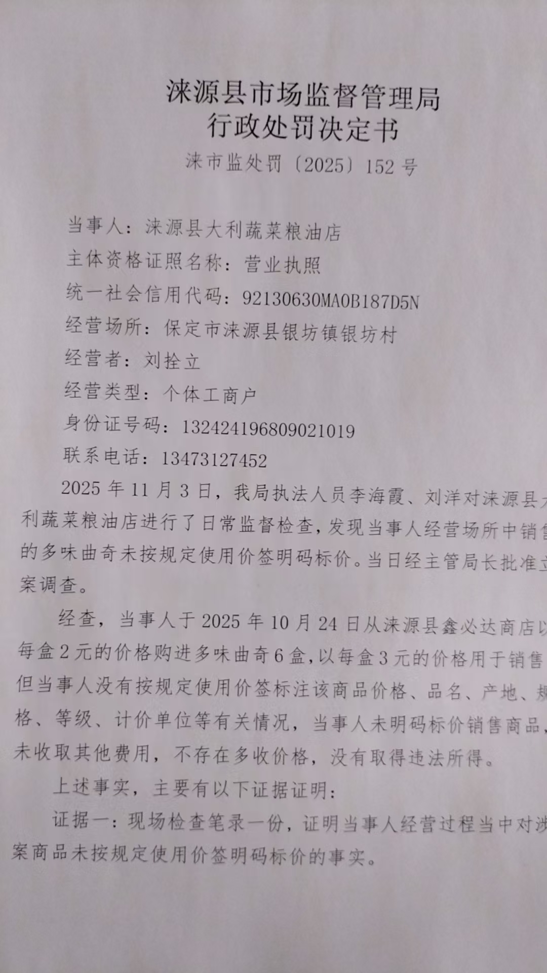 涞市监处罚〔2025〕152号涞源县大利蔬菜粮油店销售商品未按规定明码标价案