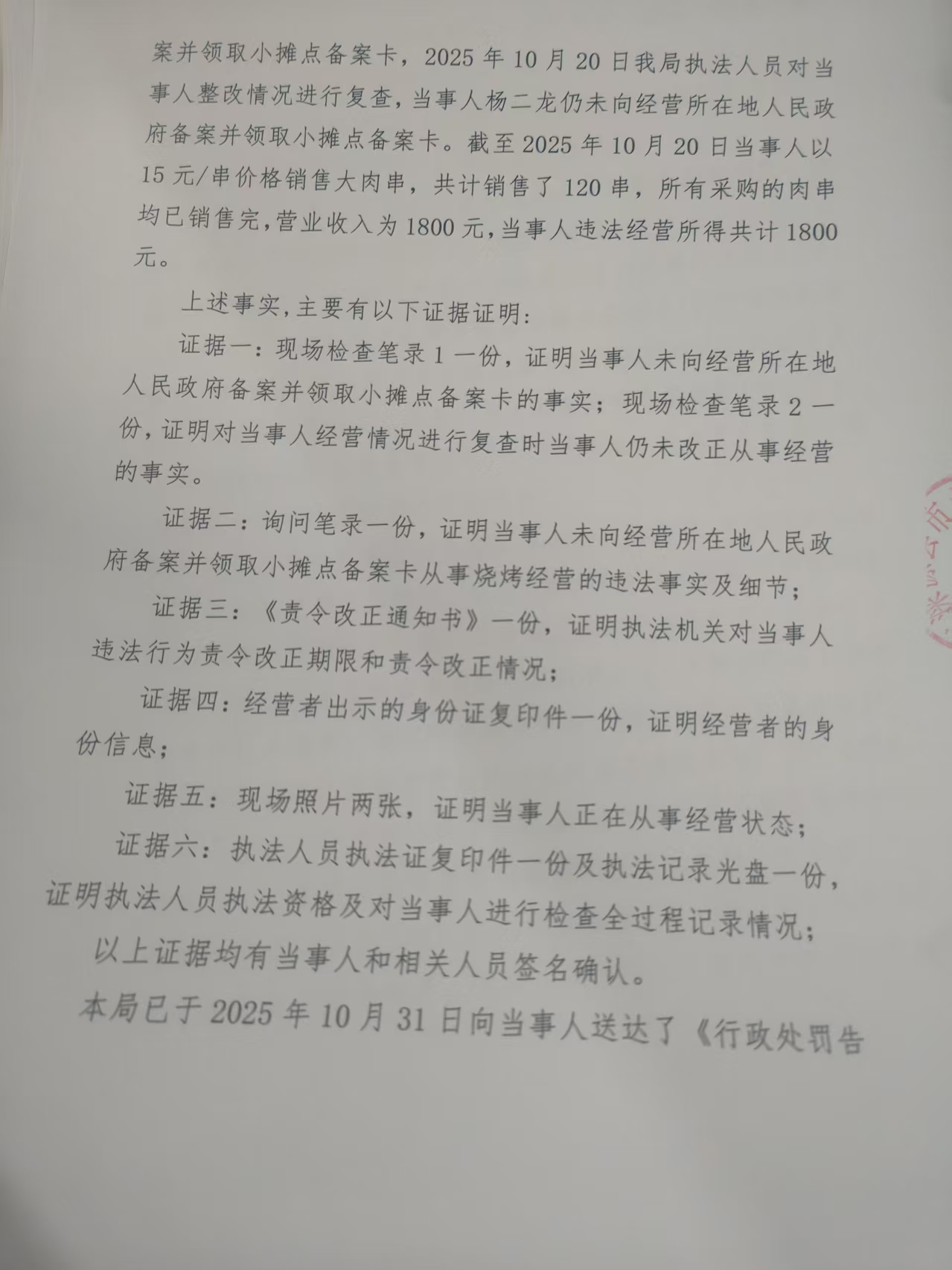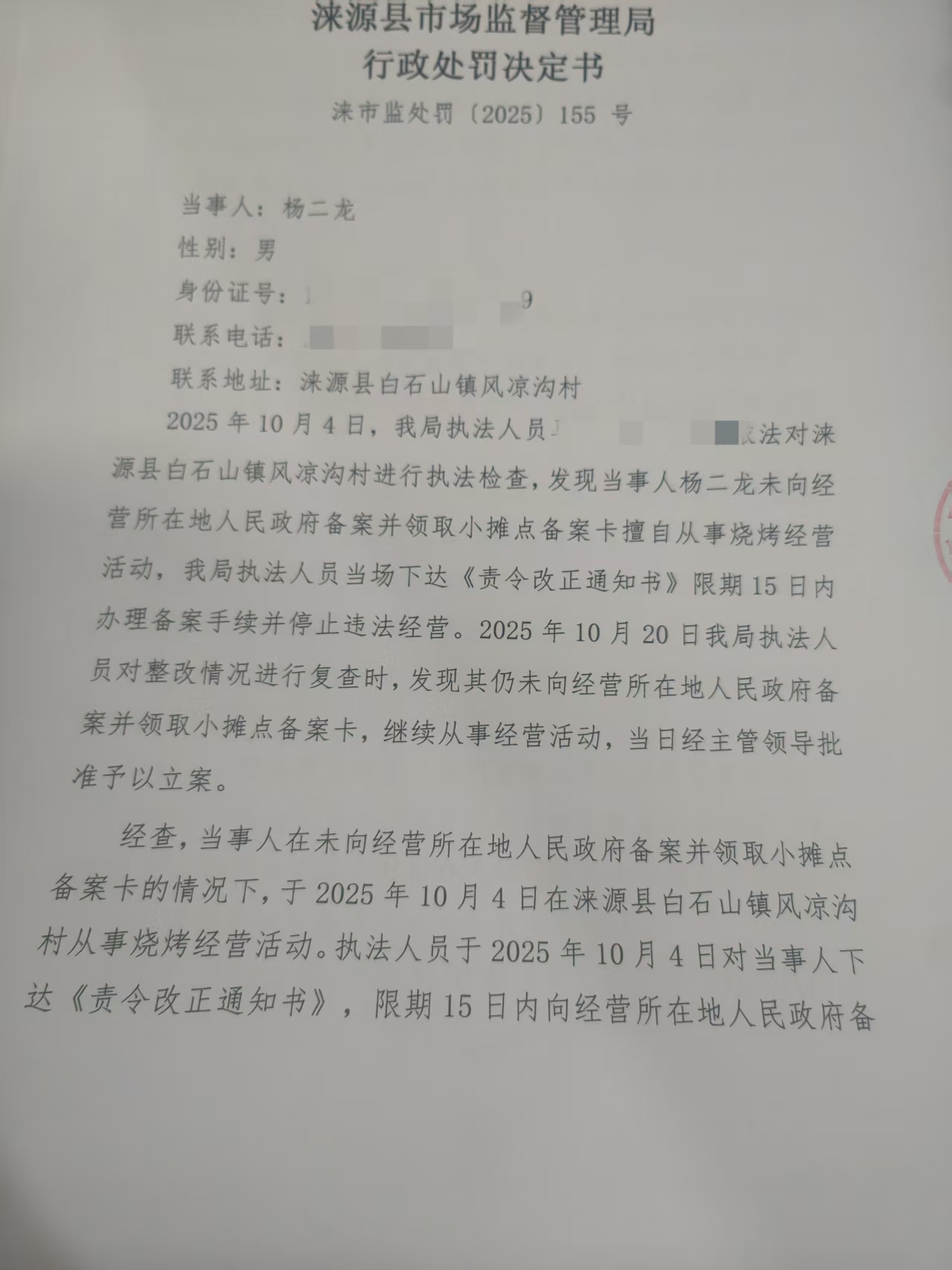 涞市监处罚〔2025〕155号 杨二龙未取得小摊点备案卡从事经营活动