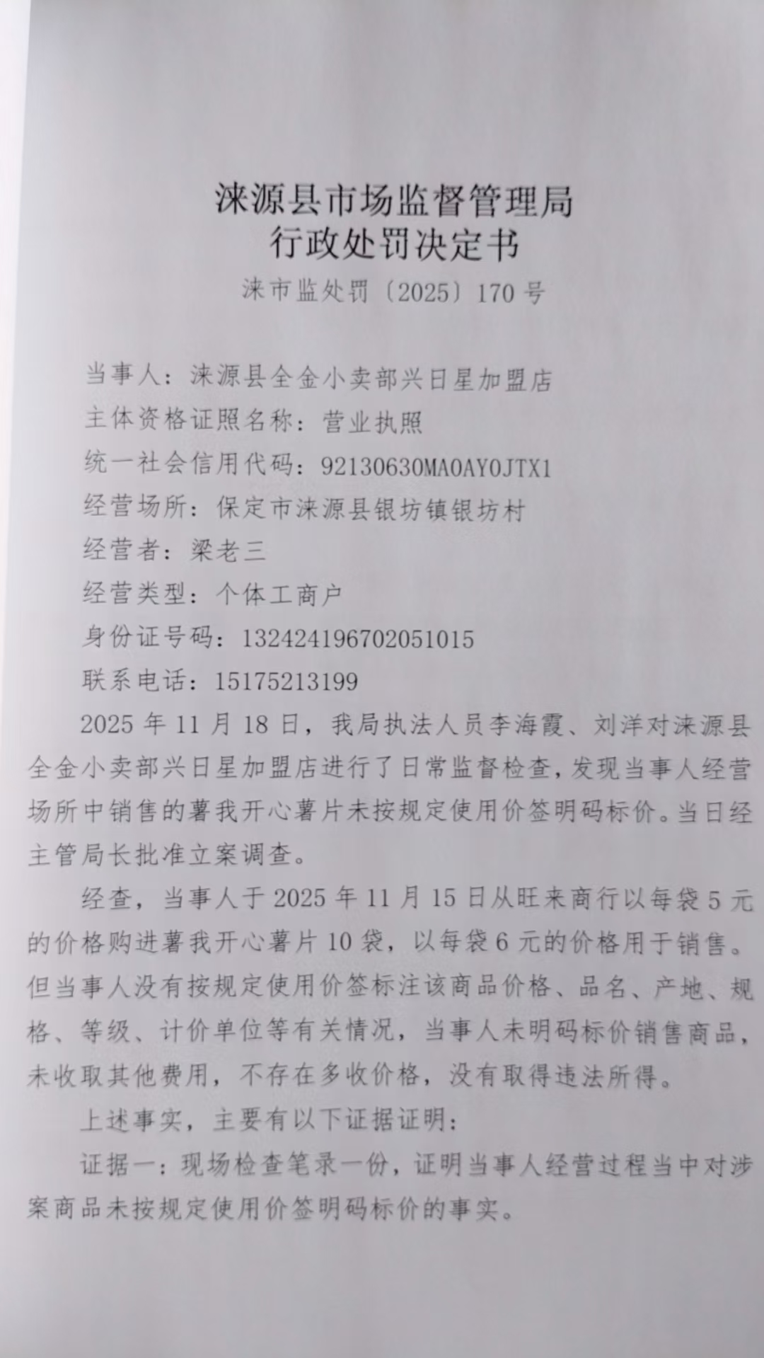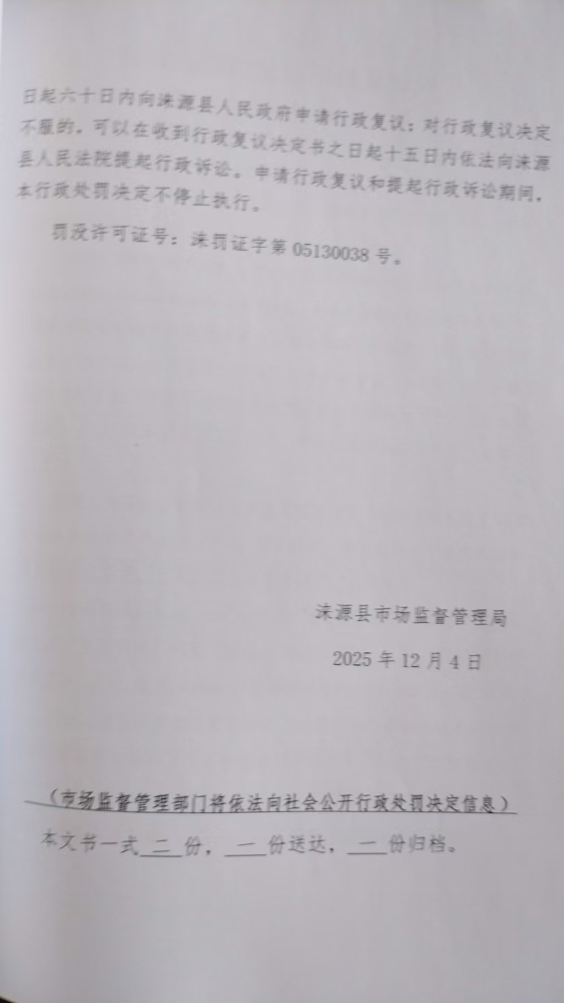 涞市监处罚〔2025〕170号涞源县全金小卖部兴日星加盟店销售商品未按规定明码标价案