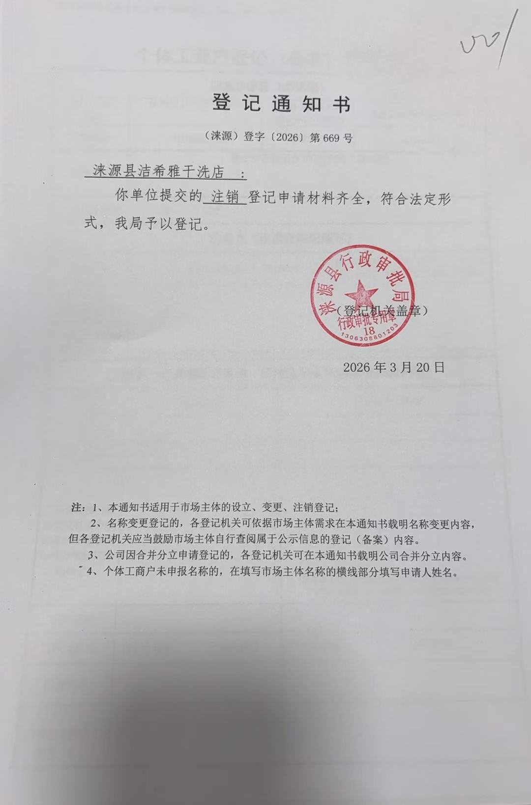 关于涞源县洁希雅干洗店许可的公开