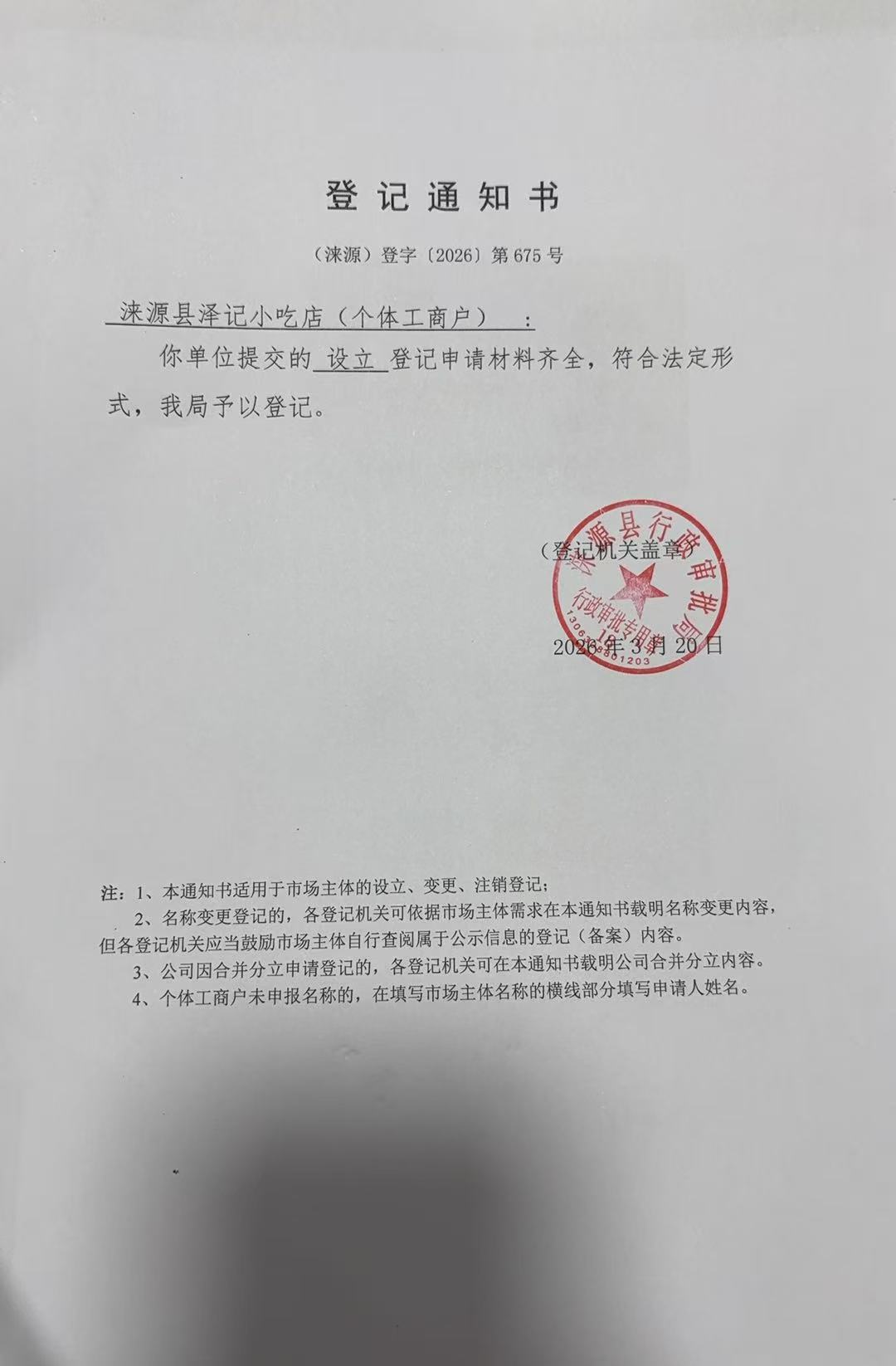 关于涞源县柏睿快餐店准予食品小餐饮登记决定的公示