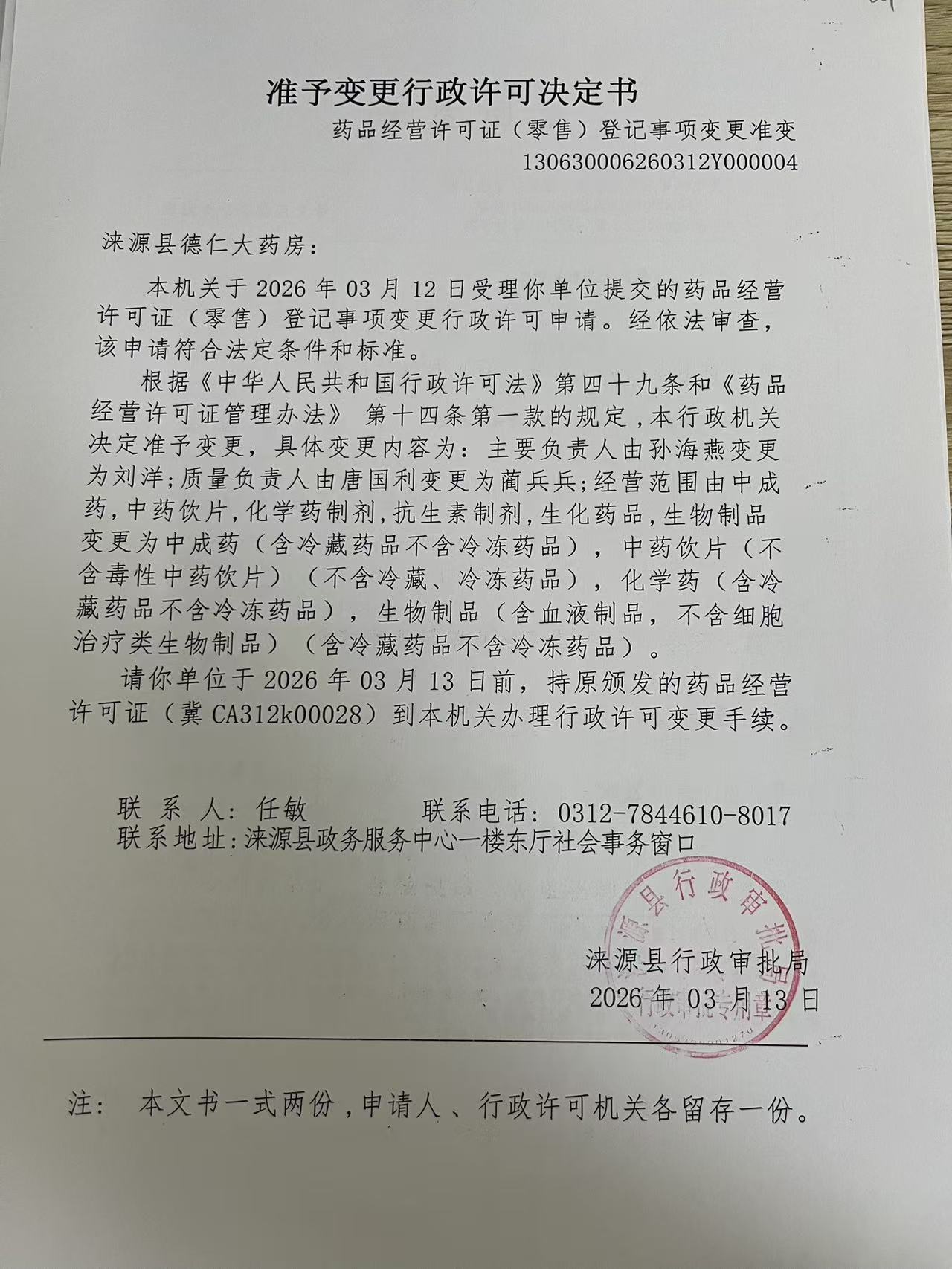 关于涞源县德仁大药房药品经营许可证(零售)登记事项变更的公示