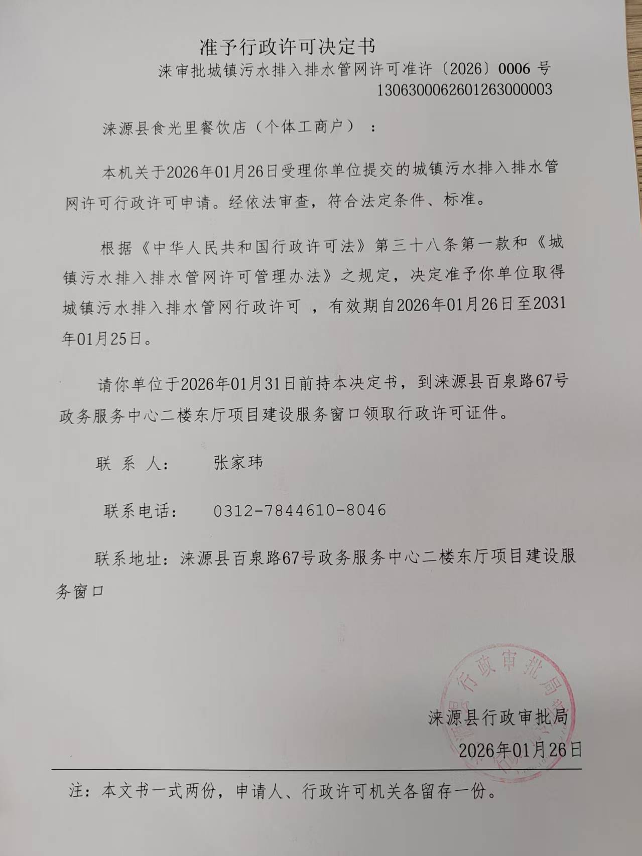 关于涞源县食光里餐饮店城镇污水排入排水管网许可的公示