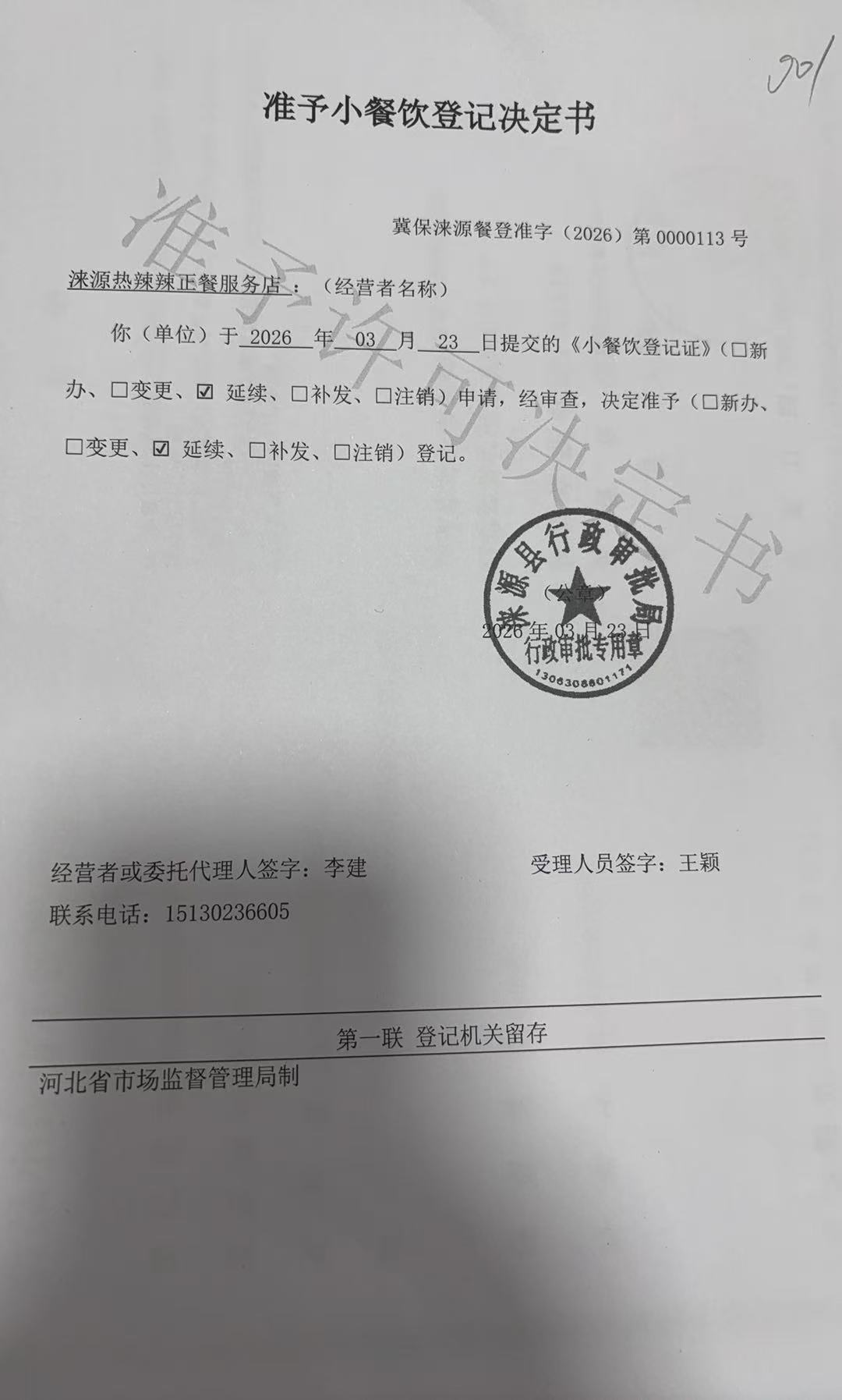 关于涞源县热辣辣正餐服务店准予食品小餐饮登记决定的公示