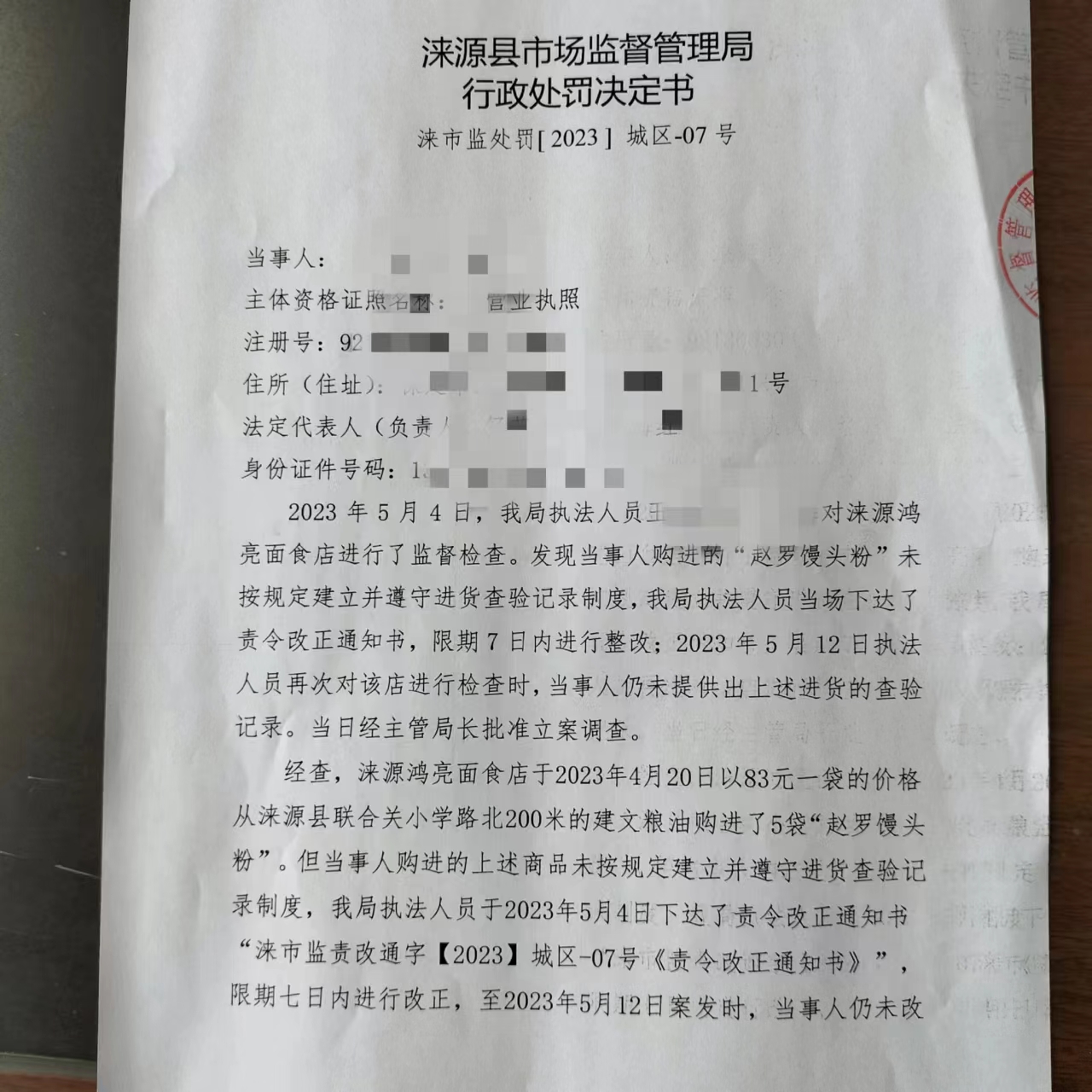 涞市监处罚[2023]城区-07号涞源县鸿亮面食店未按规定建立并遵守进货查验记录制度案