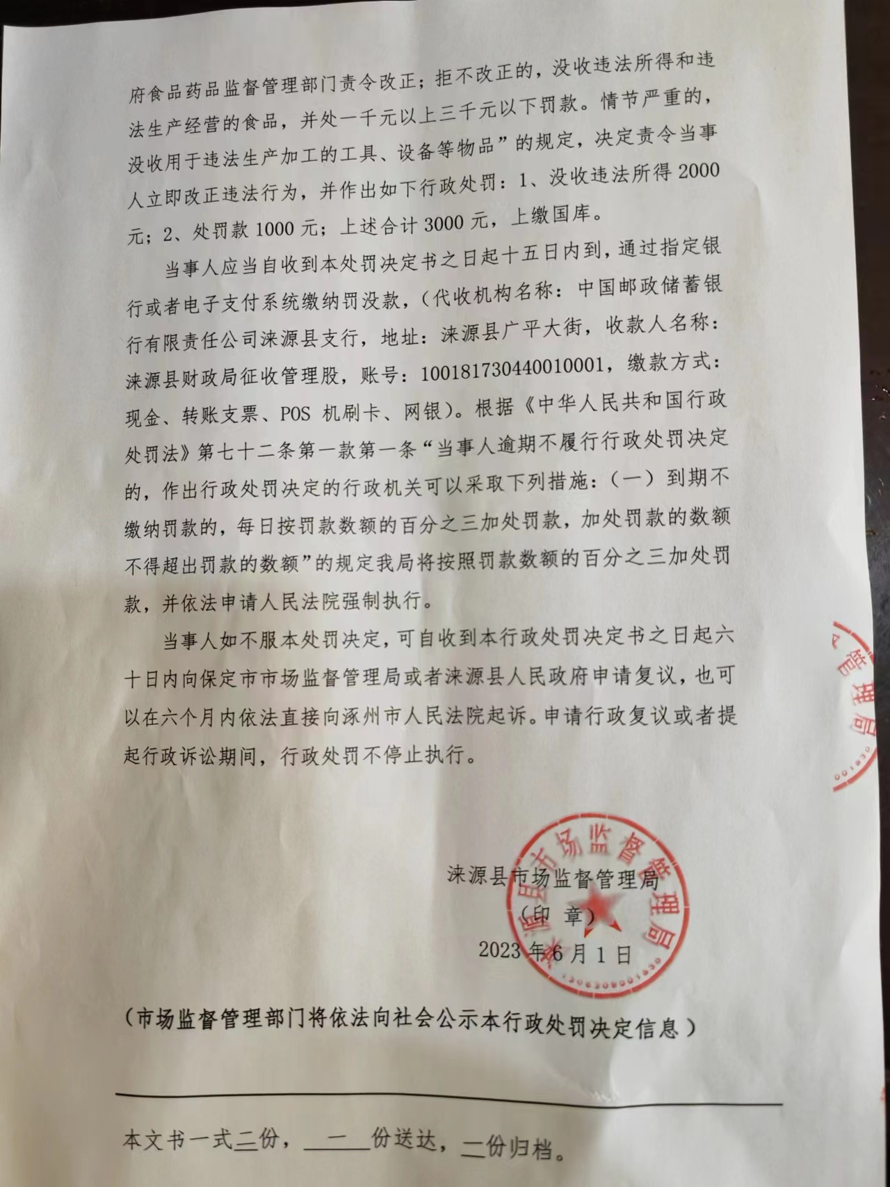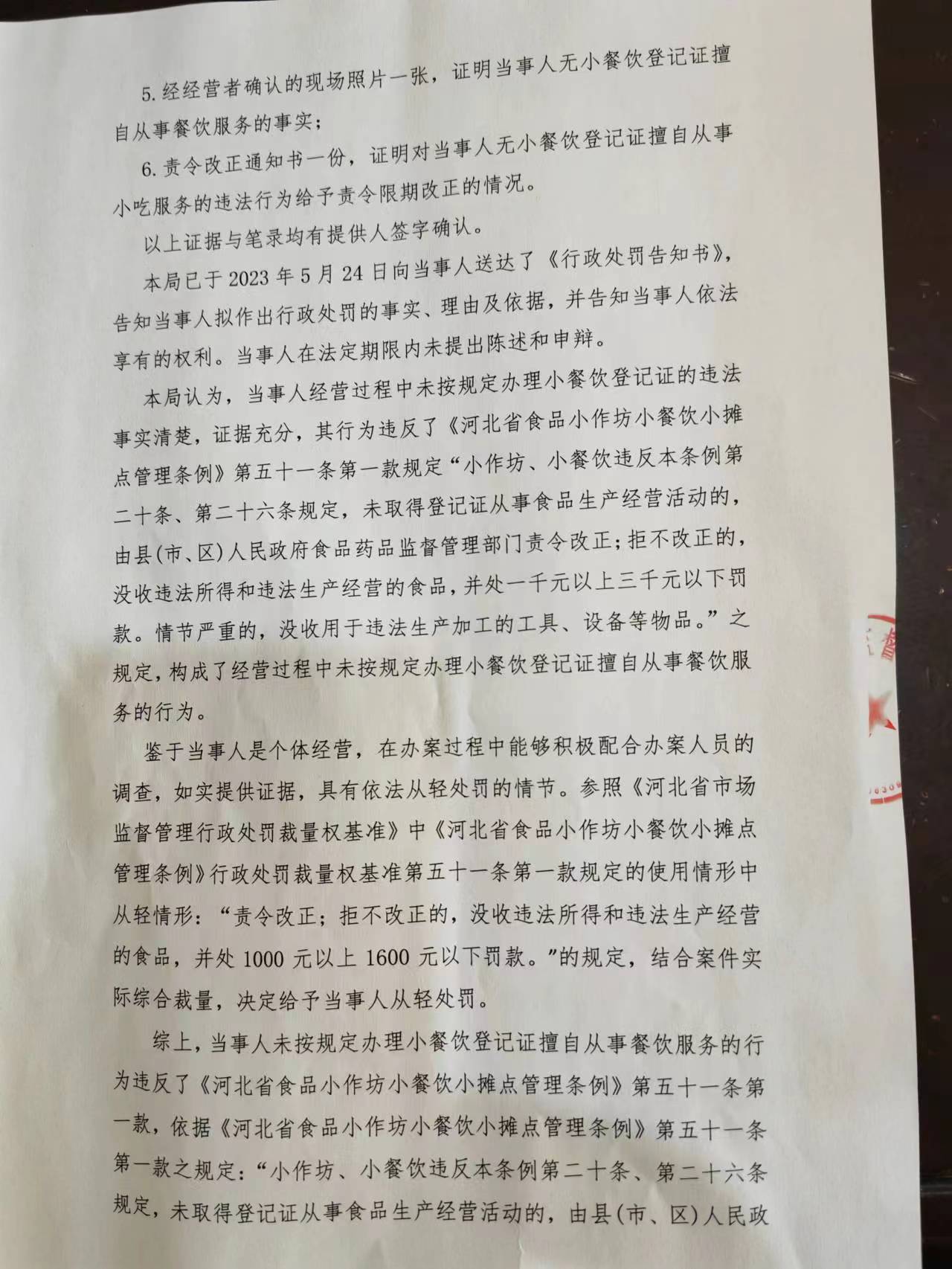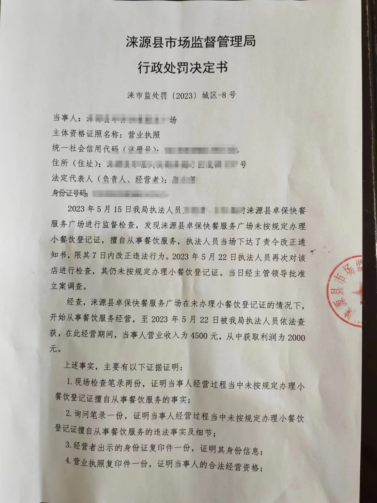 涞市监处罚〔2023〕城区-8号涞源县卓保快餐服务广场未按规定办理小餐饮登记证擅自从事餐饮服务案