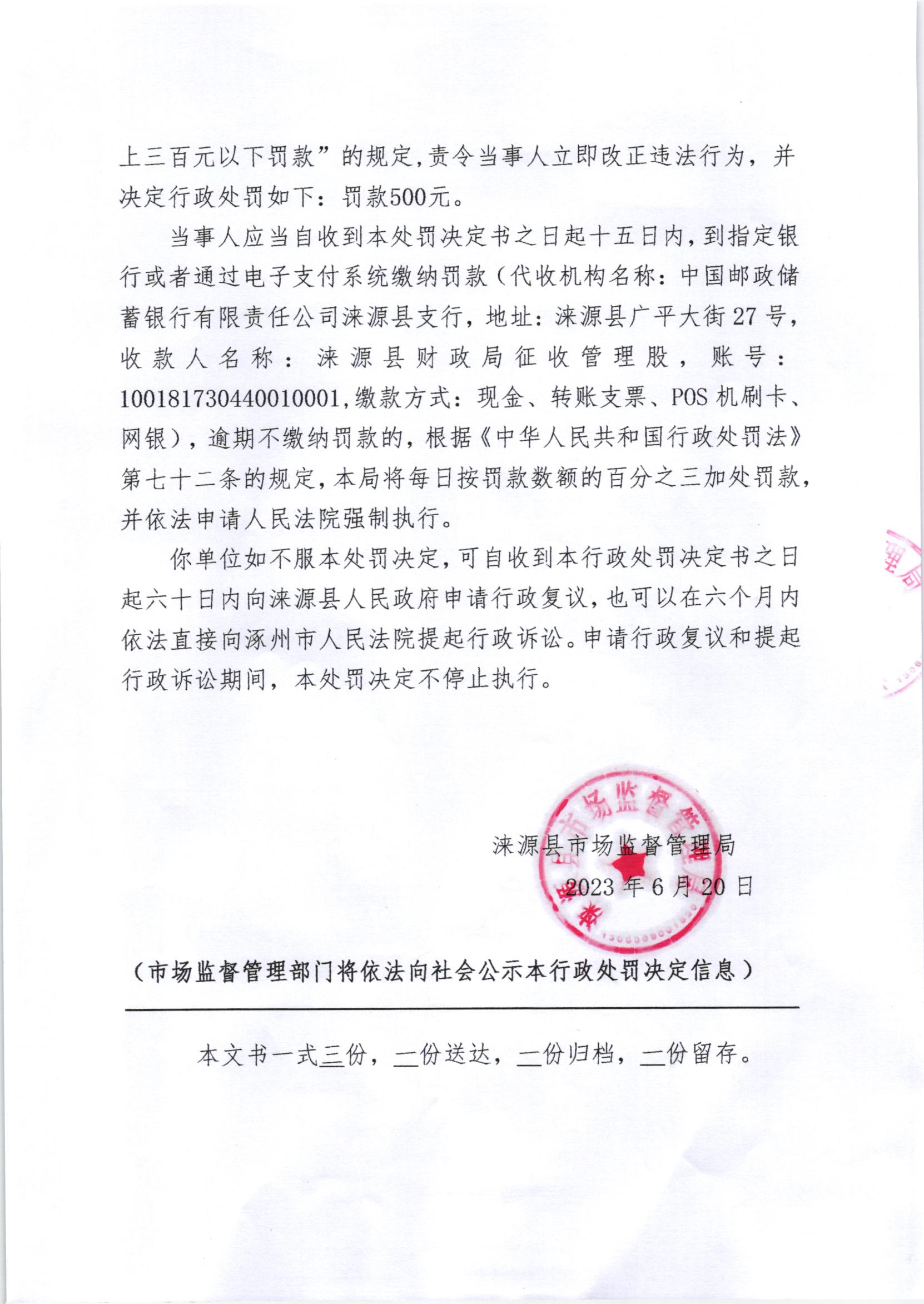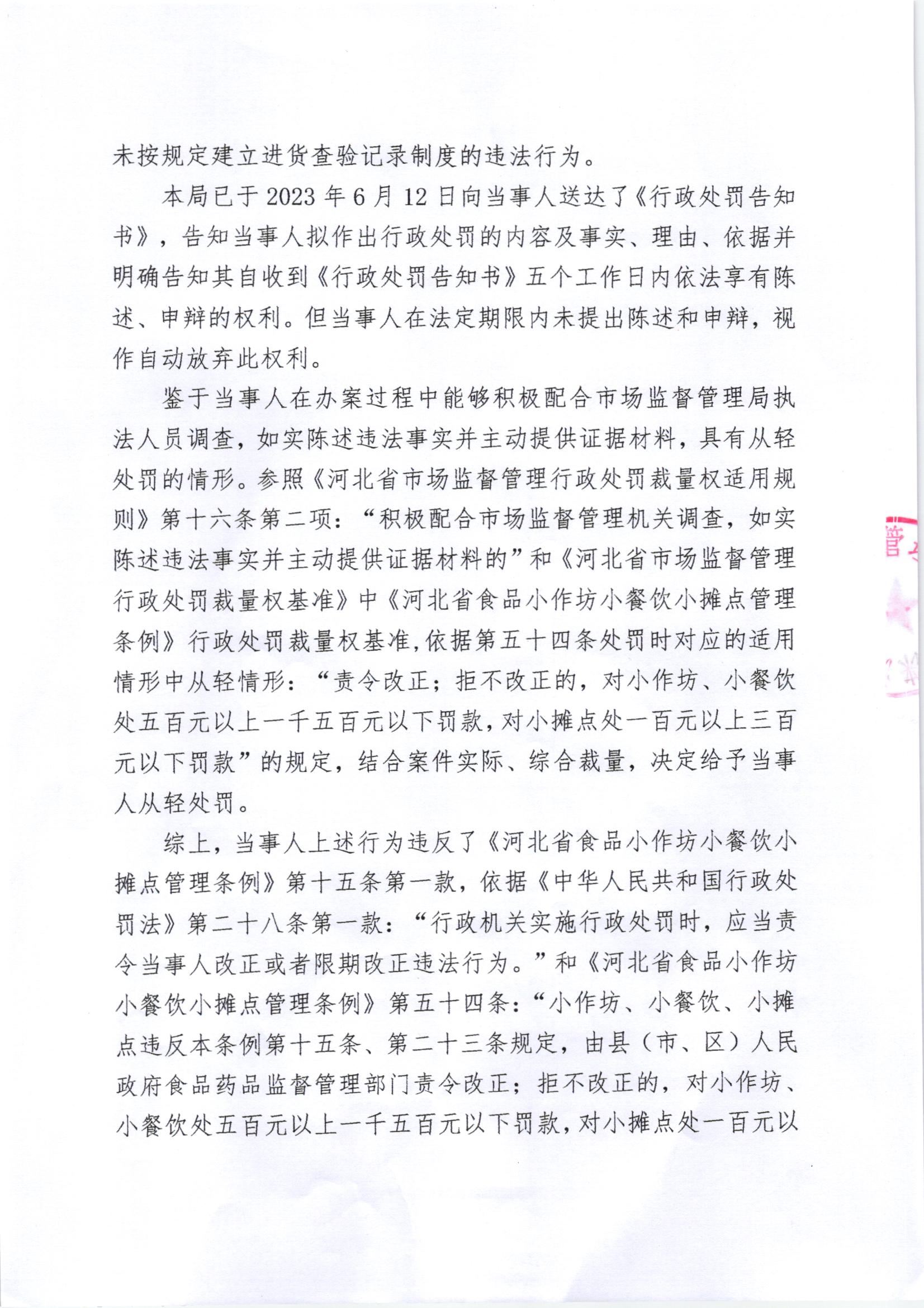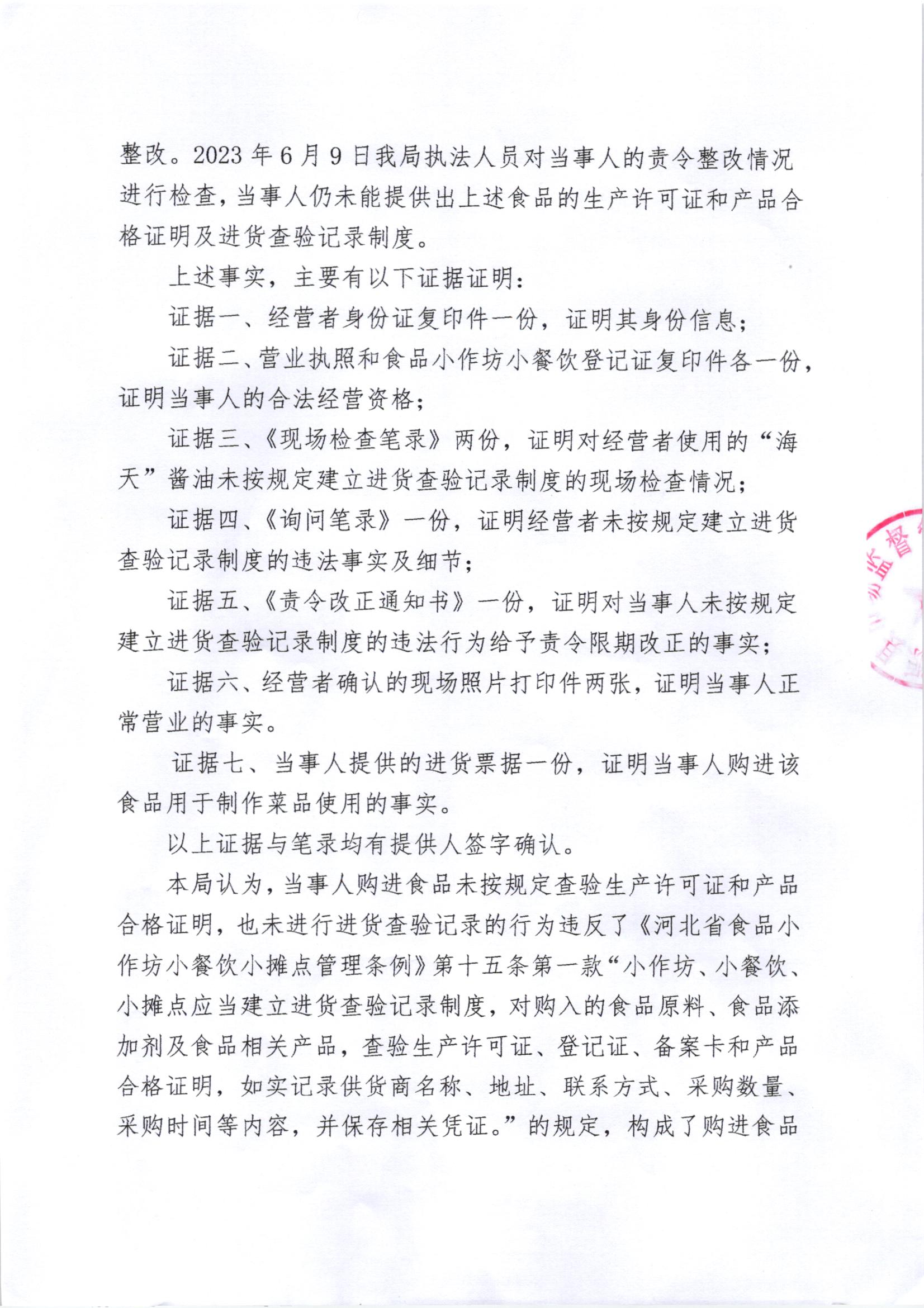 涞市监处罚【2023】41号涞源县王营小吃店购进食品未按规定建立进货查验记录制度案