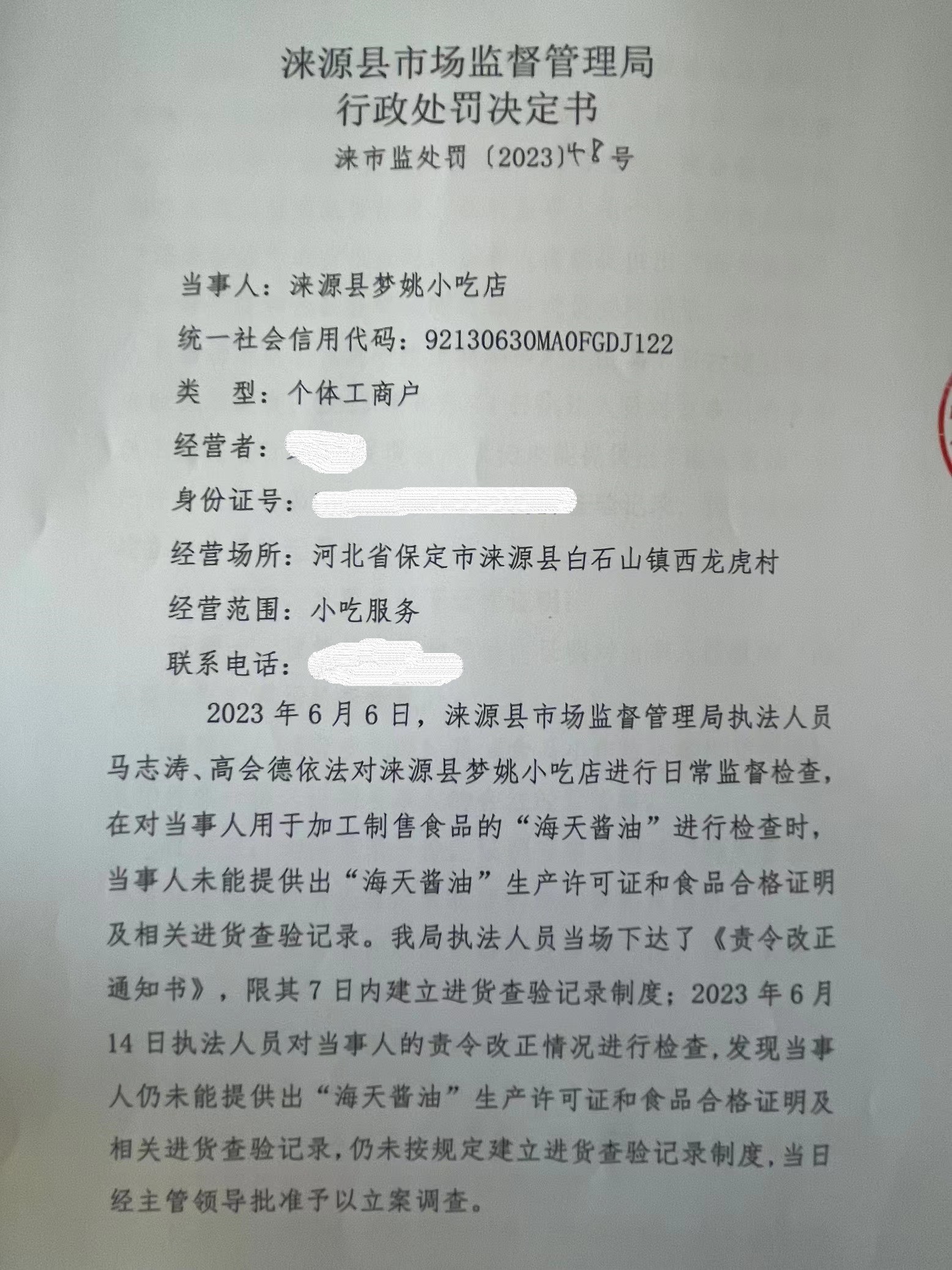 涞市监处罚〔2023〕48号涞源县梦姚小吃店购进食品未按规定建立进货查验记录制度案