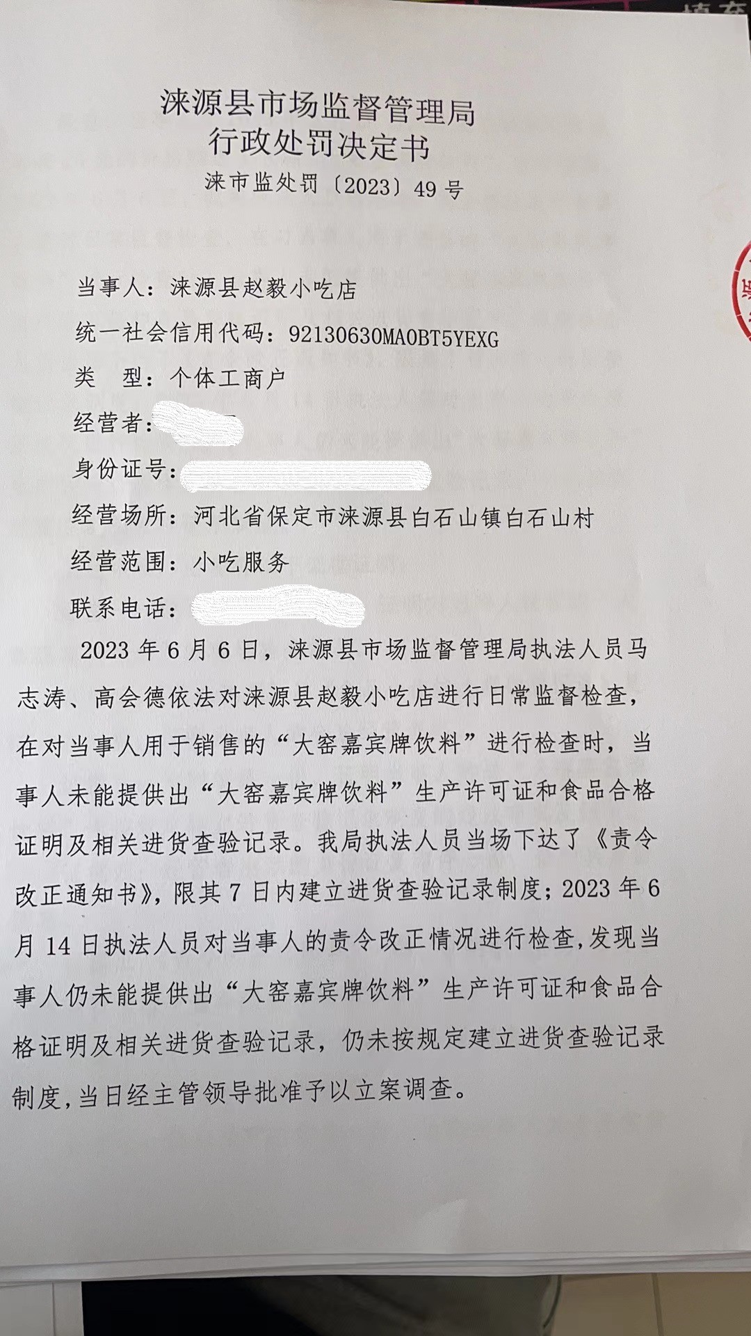 涞市监处罚〔2023〕49号涞源县赵毅小吃店购进食品未按规定建立进货查验记录制度案
