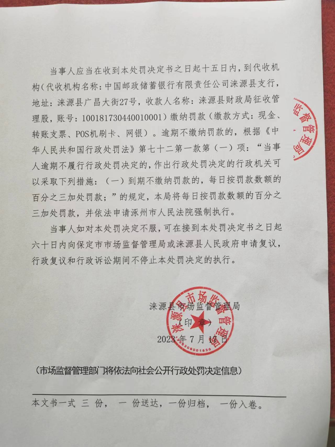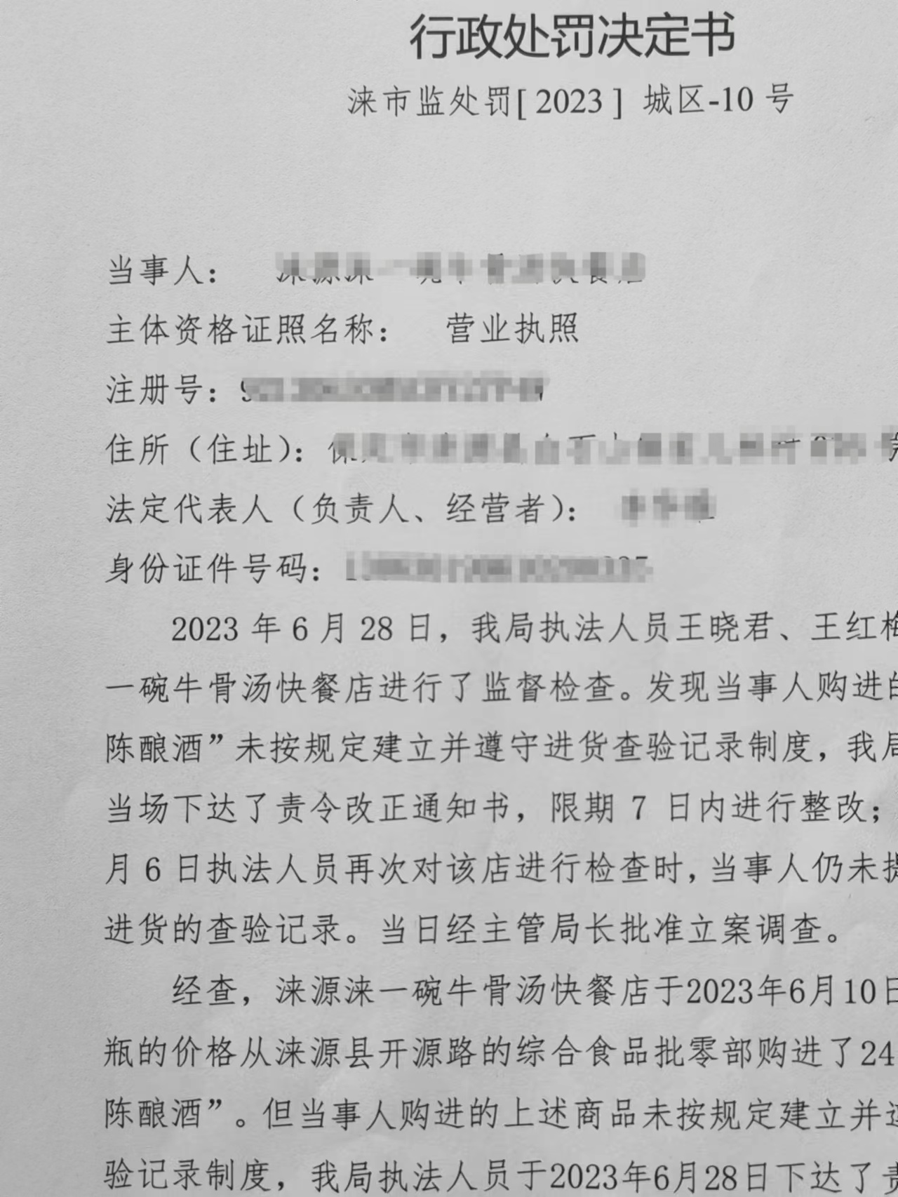 涞市监处罚[ 2023 ] 城区-10号涞源涞一碗牛骨汤快餐店未按规定建立并遵守进货查验记录制度案