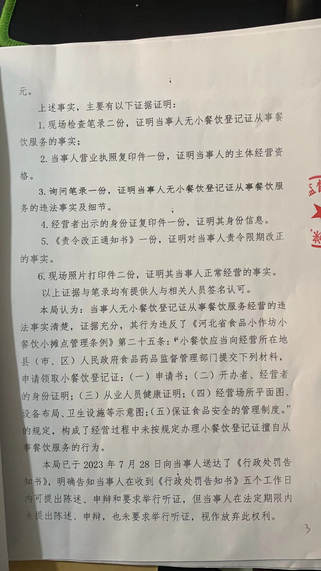 涞市监处罚〔2023〕走马驿1号,涞源县老铁小吃店未按规定办理小餐饮登记证擅自从事餐饮服务案