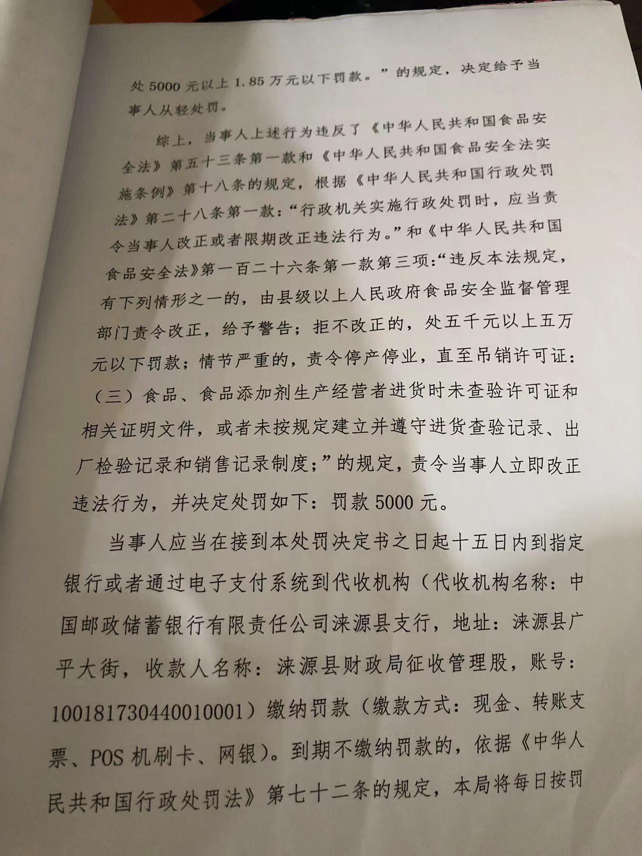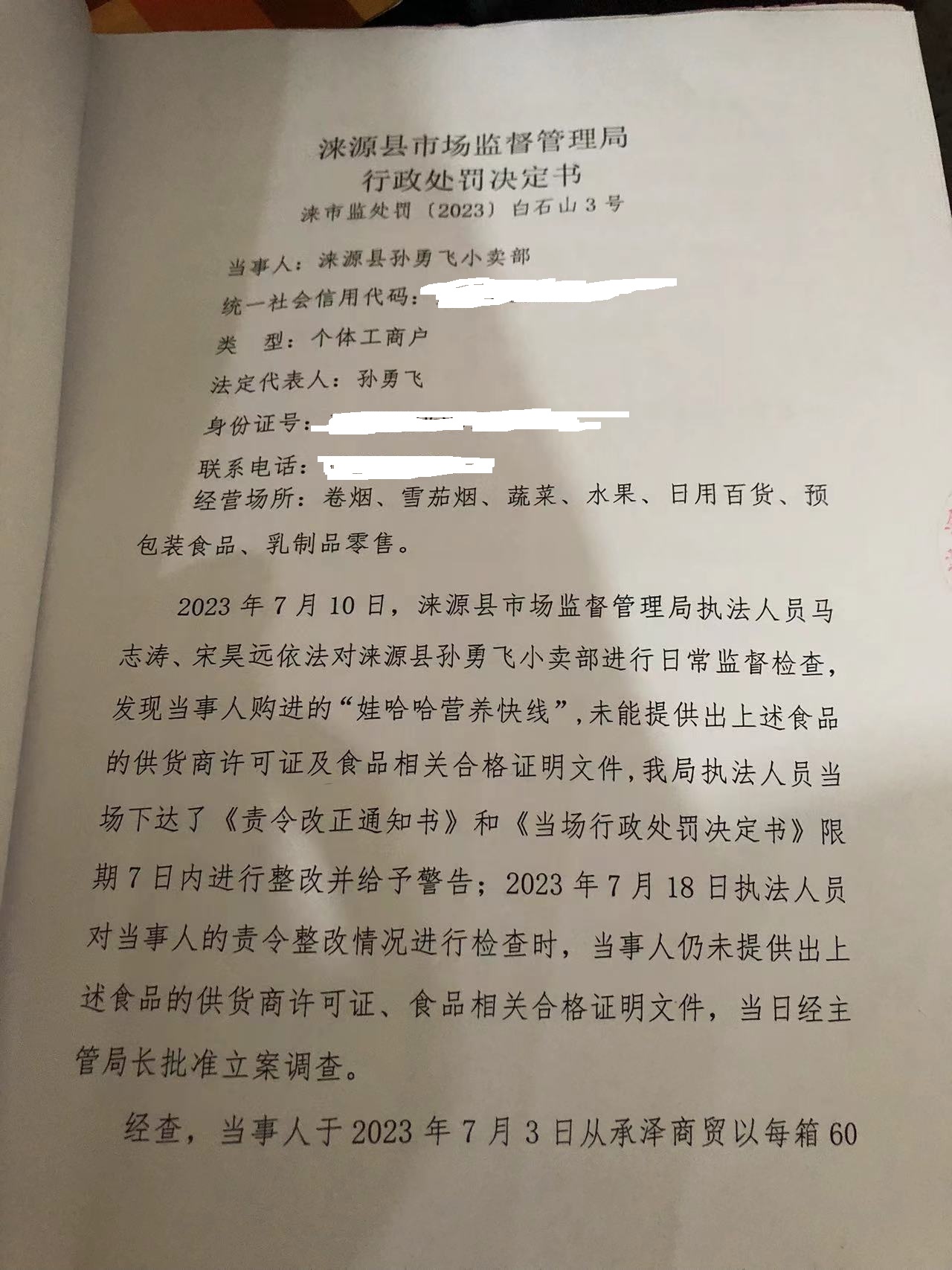 涞市监处罚 〔2023〕白石山3号,涞源县孙勇飞小卖部进货未按规定查验许可证和相关证明文件案
