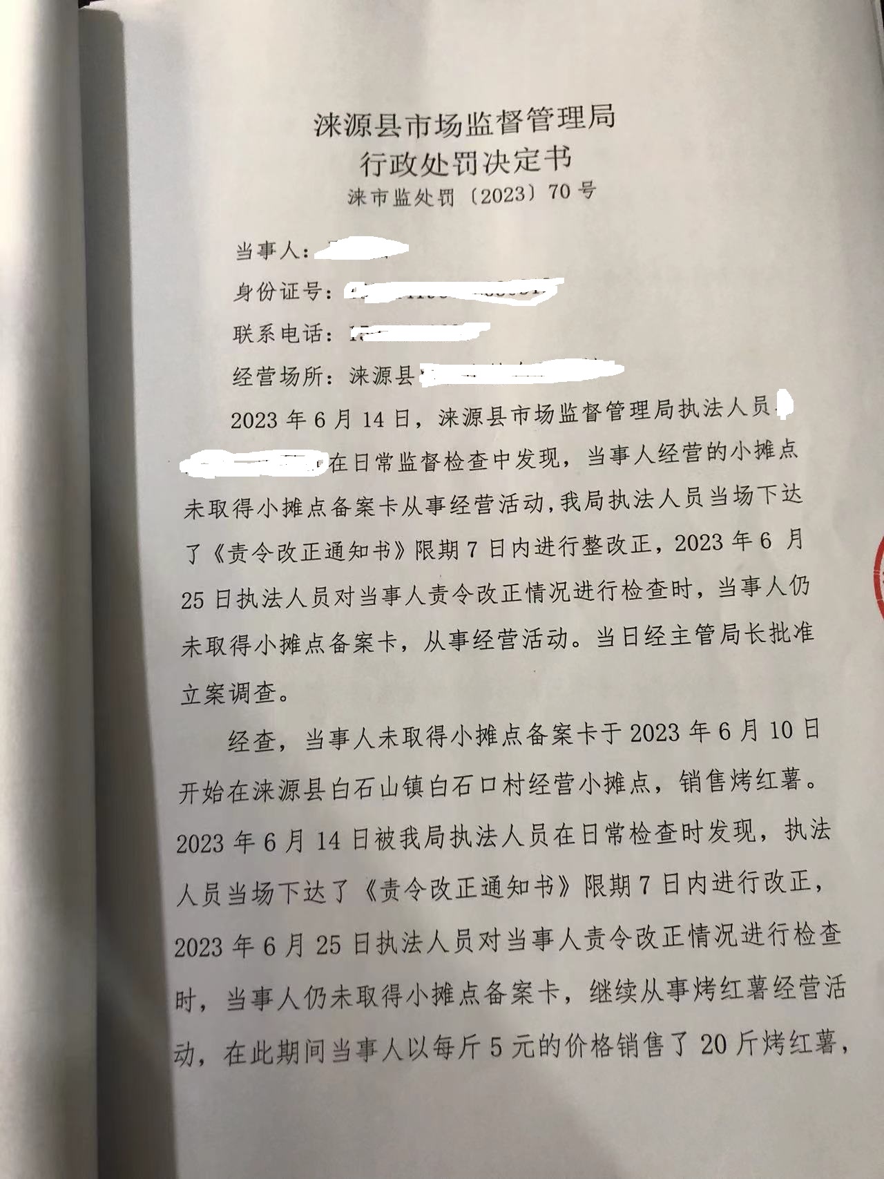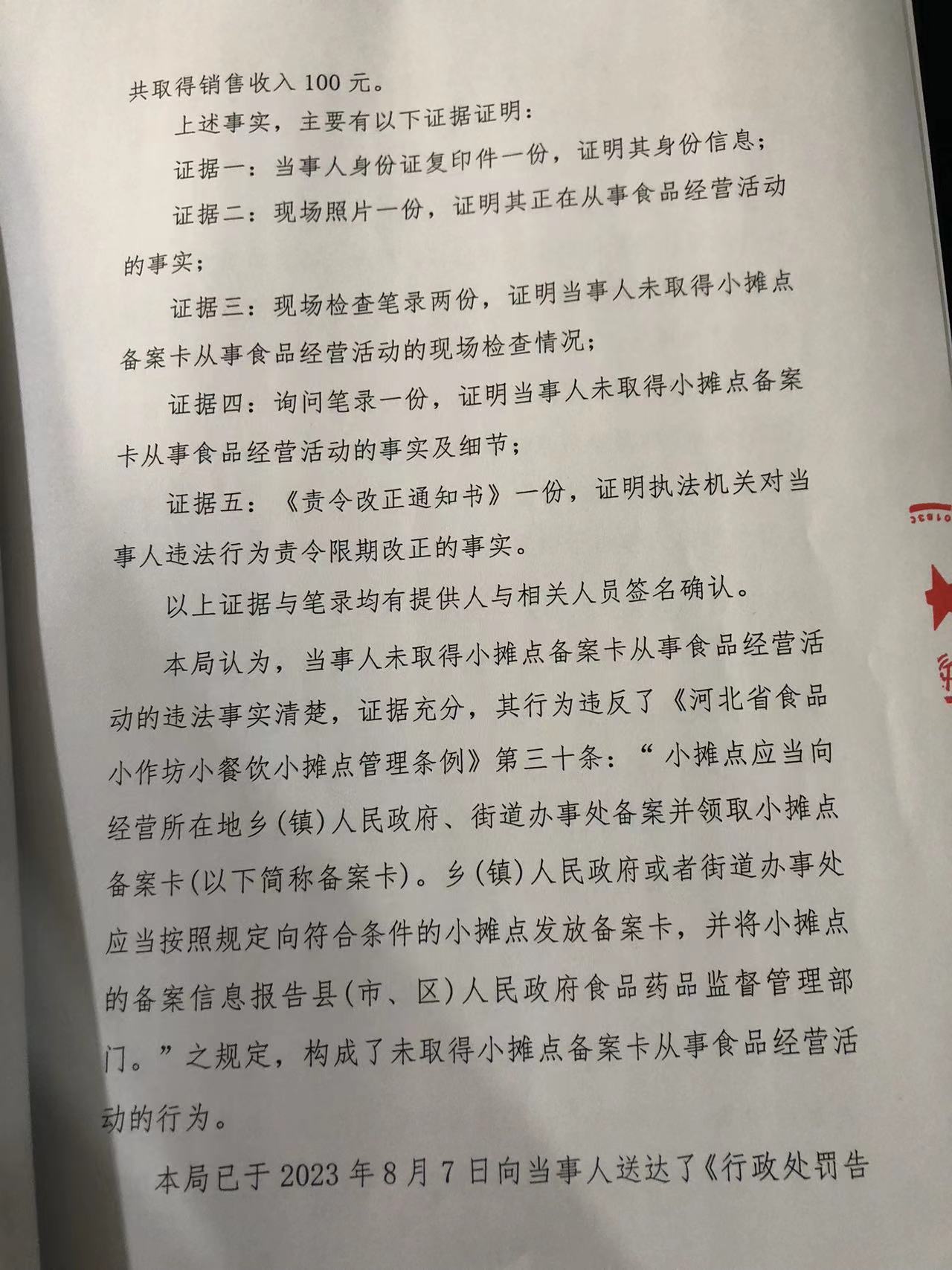 涞市监处罚 〔2023〕白石山70号涞源县王新国未取得小摊点备案卡从事食品经营案