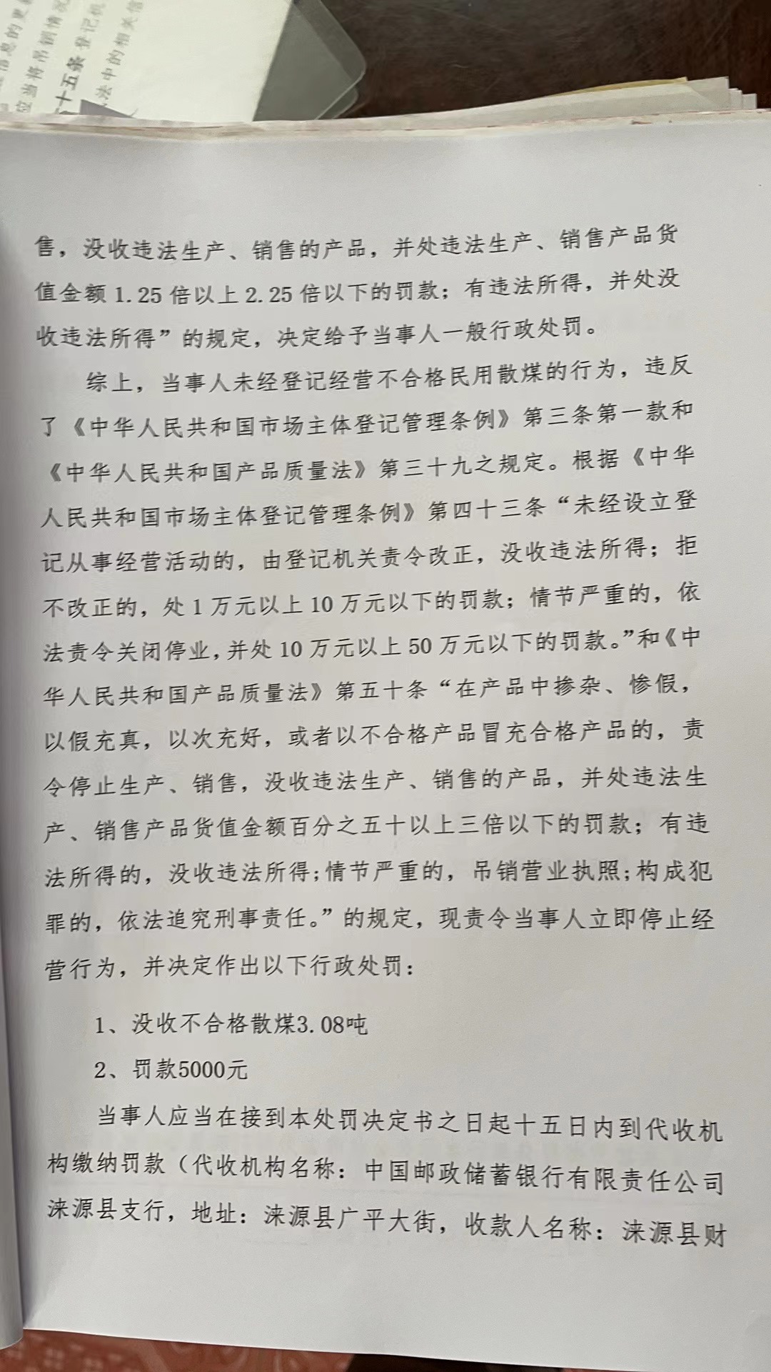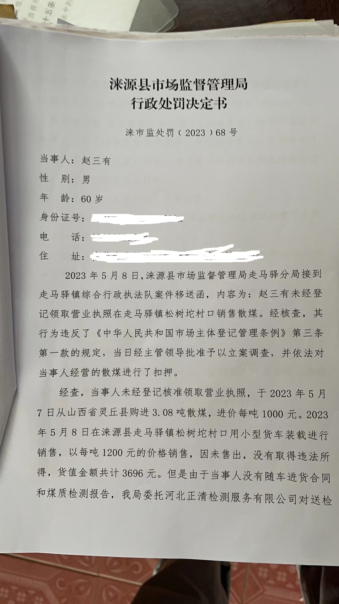 涞市监处罚〔2023〕68号,赵三友未经登记经营不合格民用散煤案