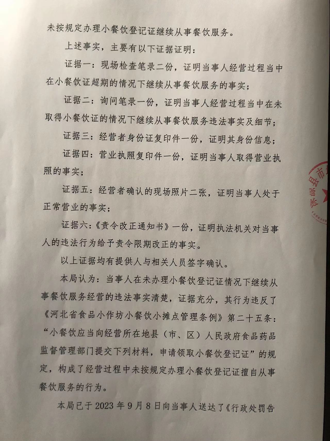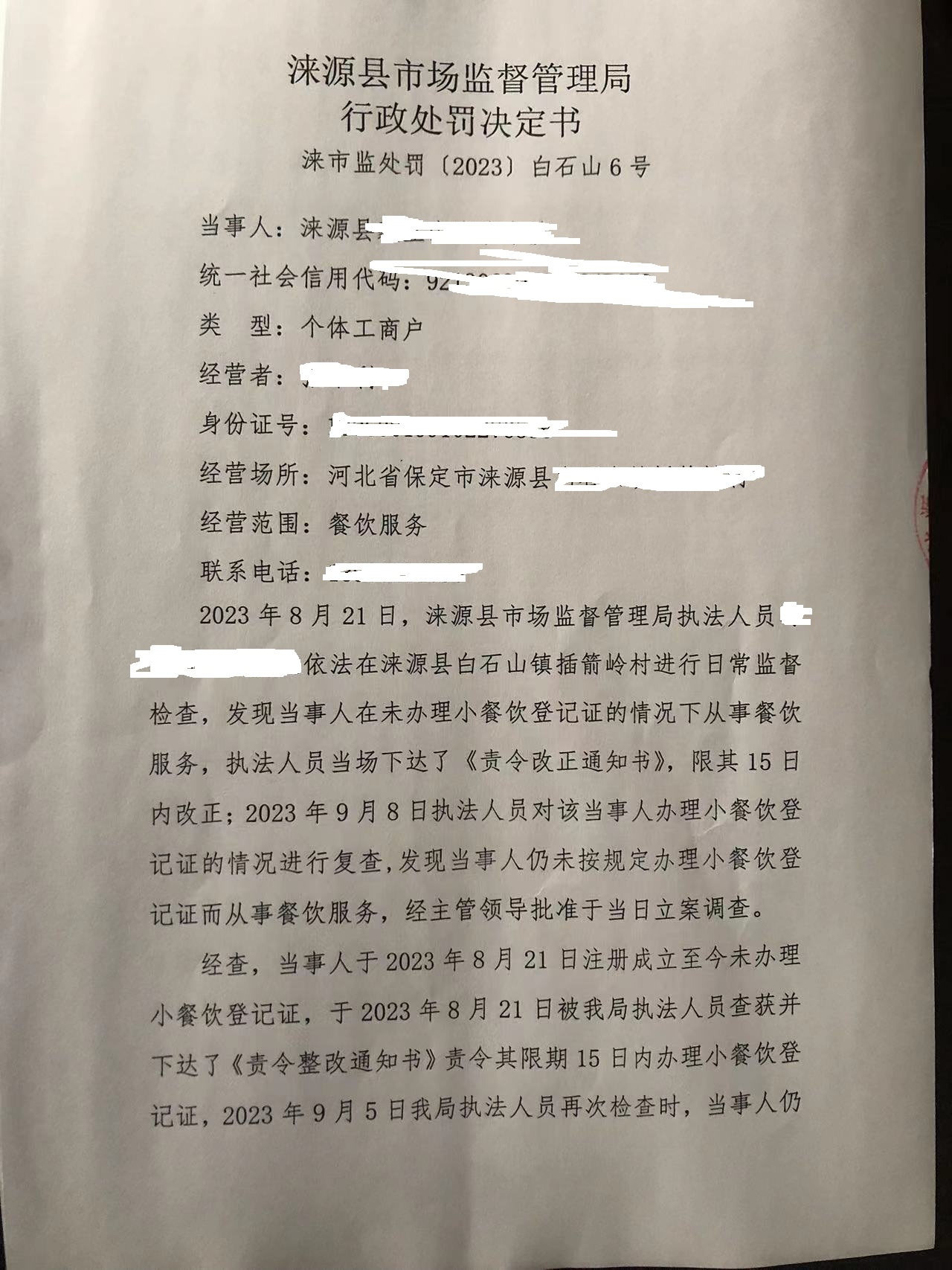 涞市监处罚〔2023〕白石山6号 涞源县毅立山庄农家院未按规定办理小餐饮登记擅自从事餐饮服务案