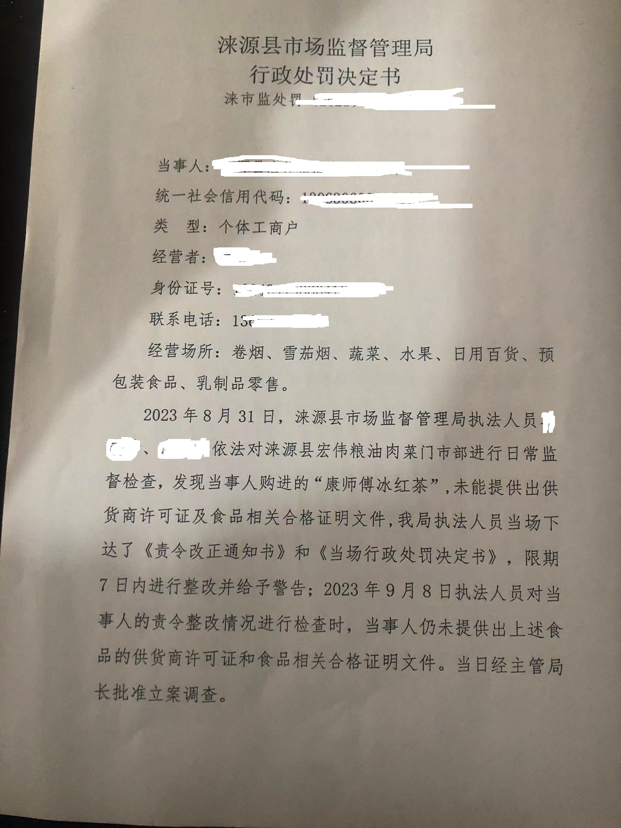 涞市监处罚〔2023〕白石山-7号 涞源县宏伟粮油肉菜门市部购进食品未按规定建立进货查验记录制度案