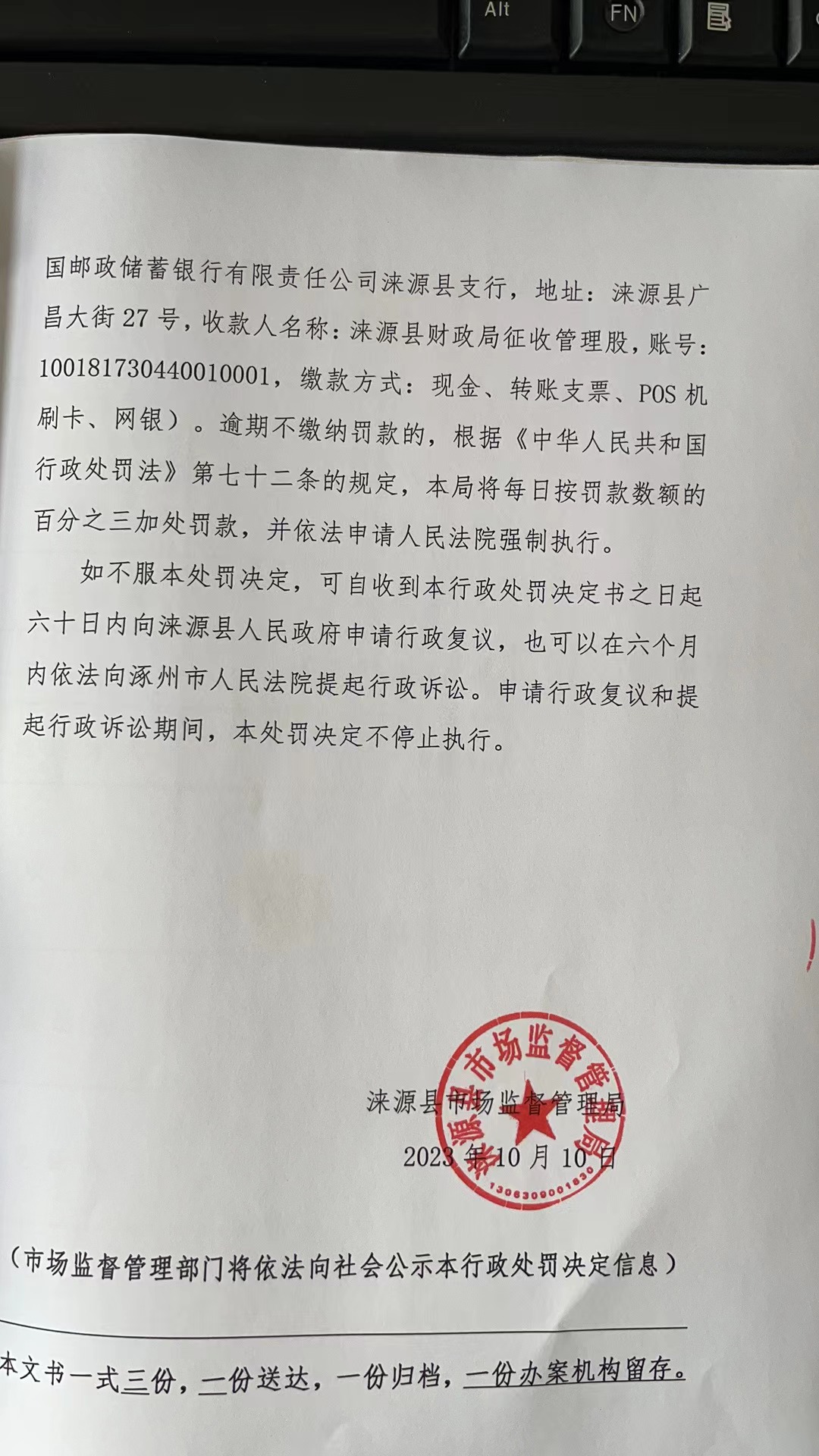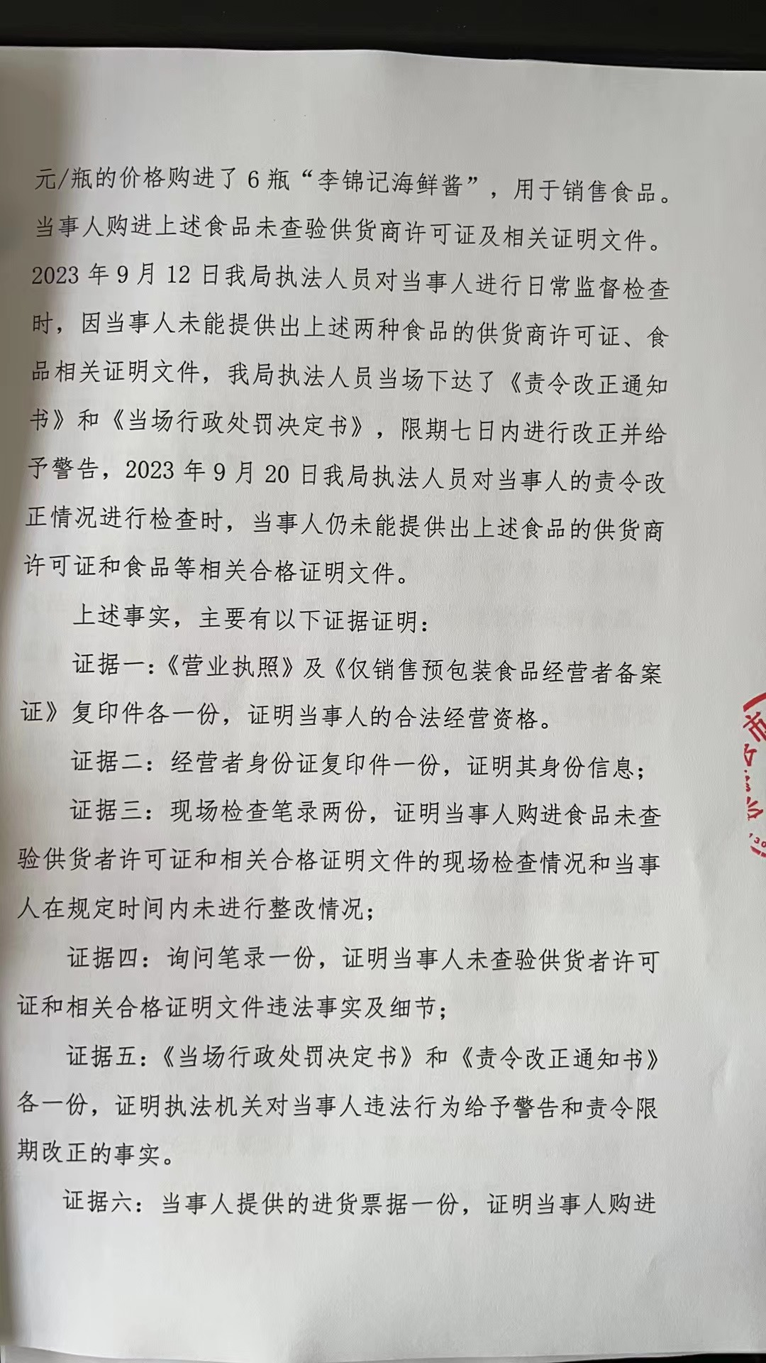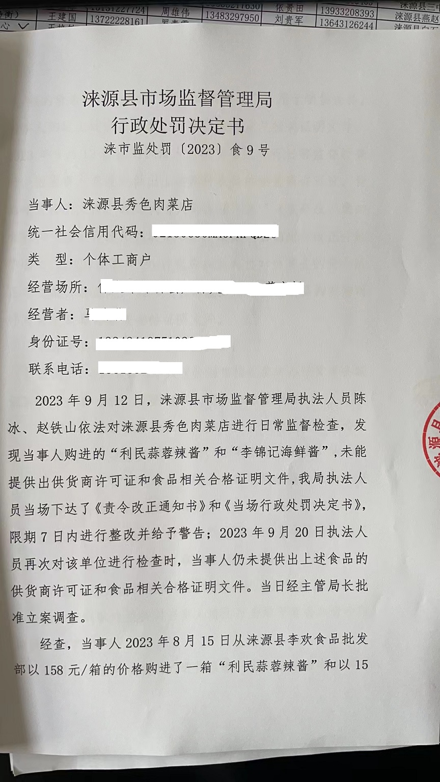 涞市监处罚〔2023〕食9号涞源县秀色肉菜店采购食品未按规定查验供货者许可证和合格证明文件案