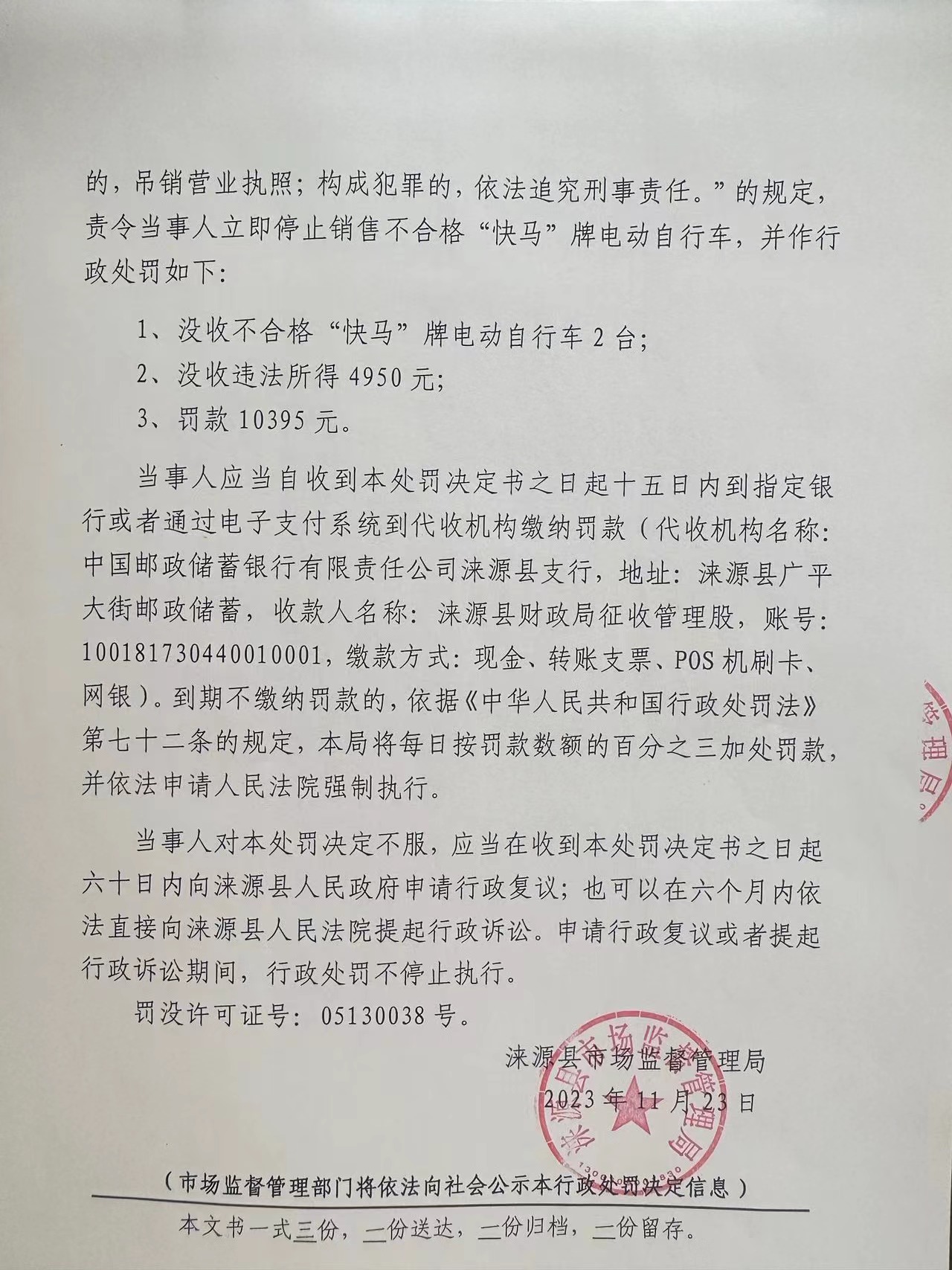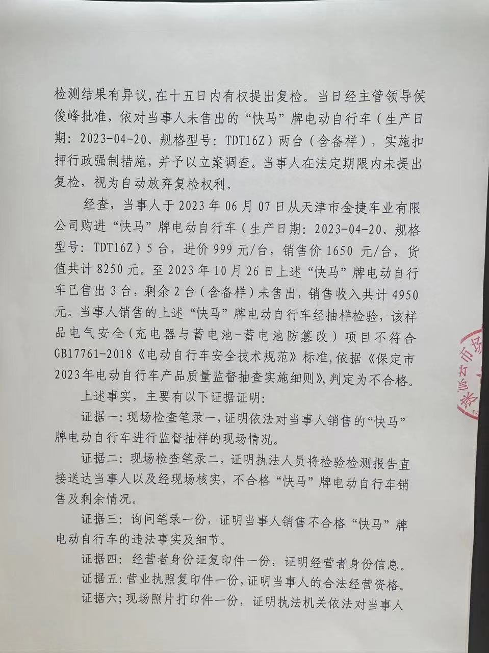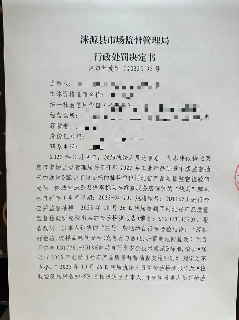 涞市监处罚〔2023〕93号涞源县保军机动车维修服务店 销售不合格电动自行车案