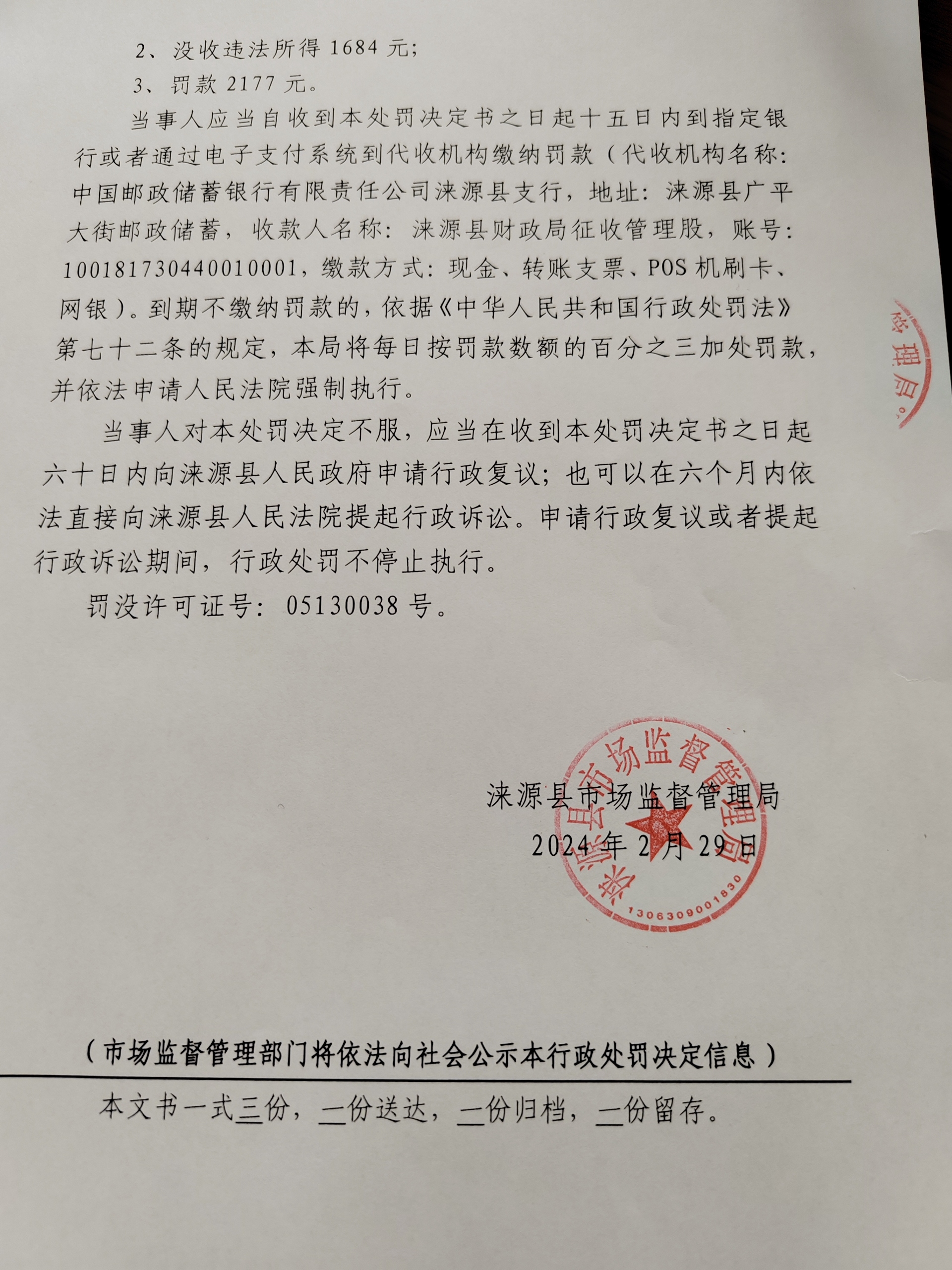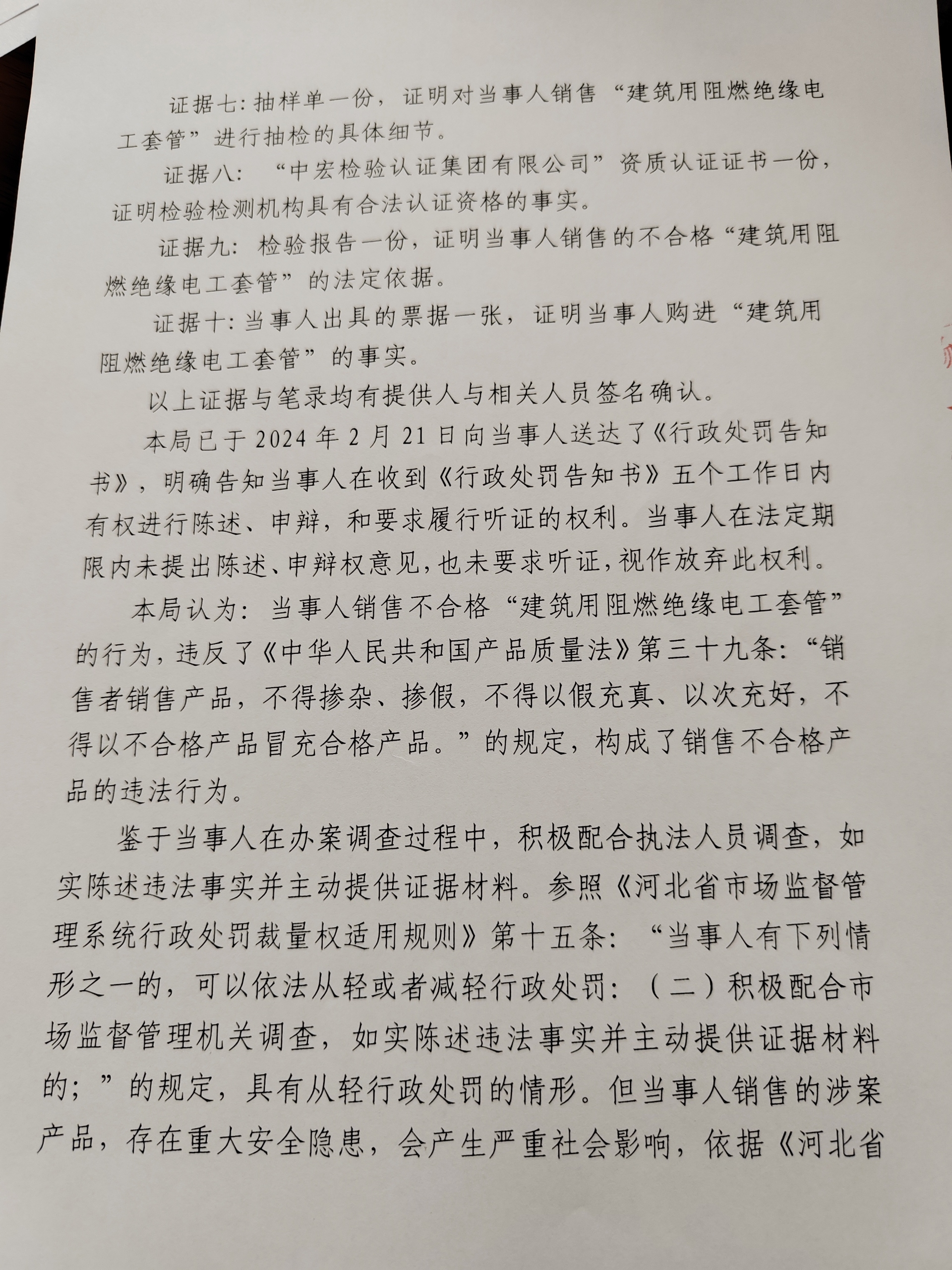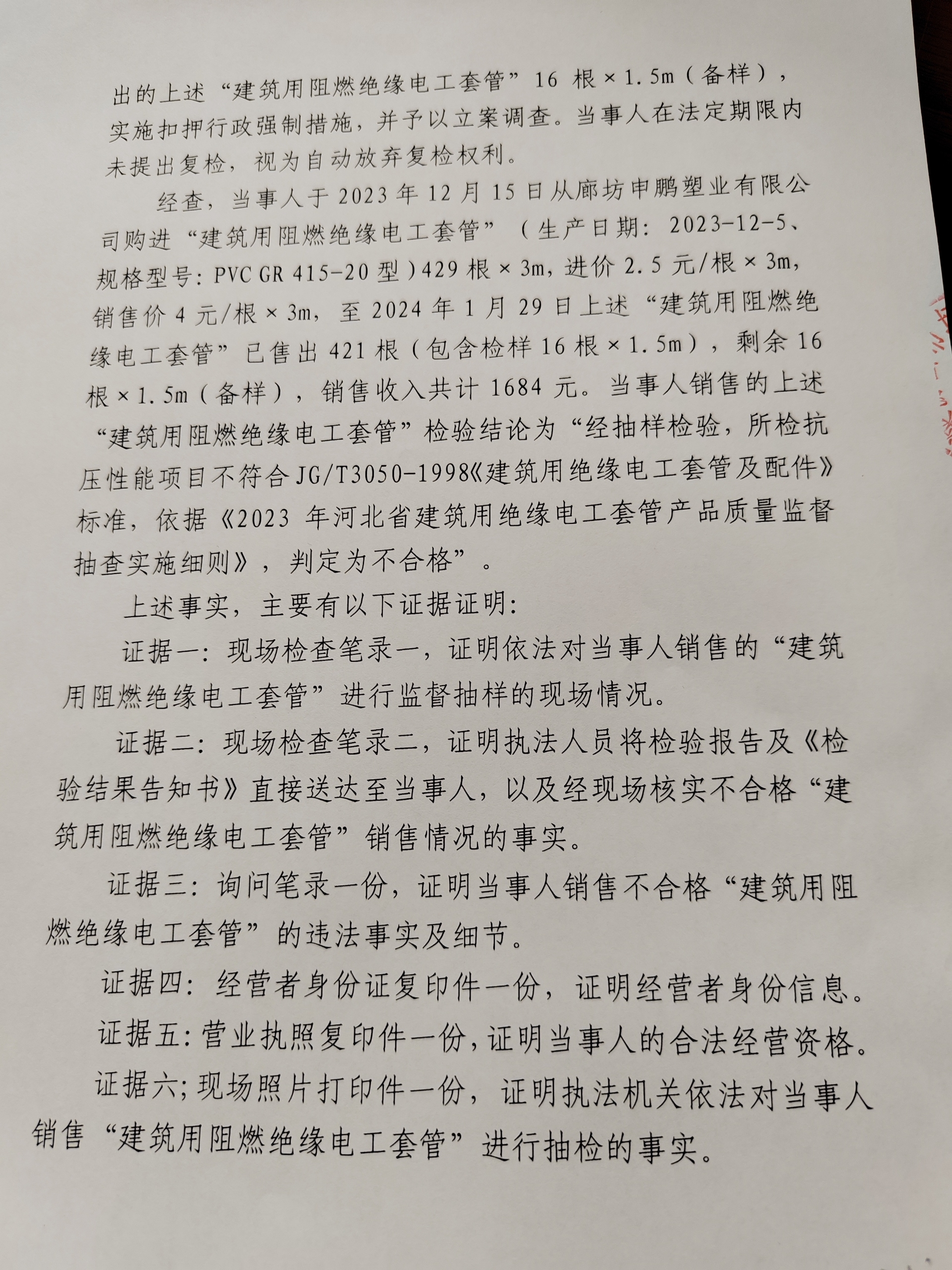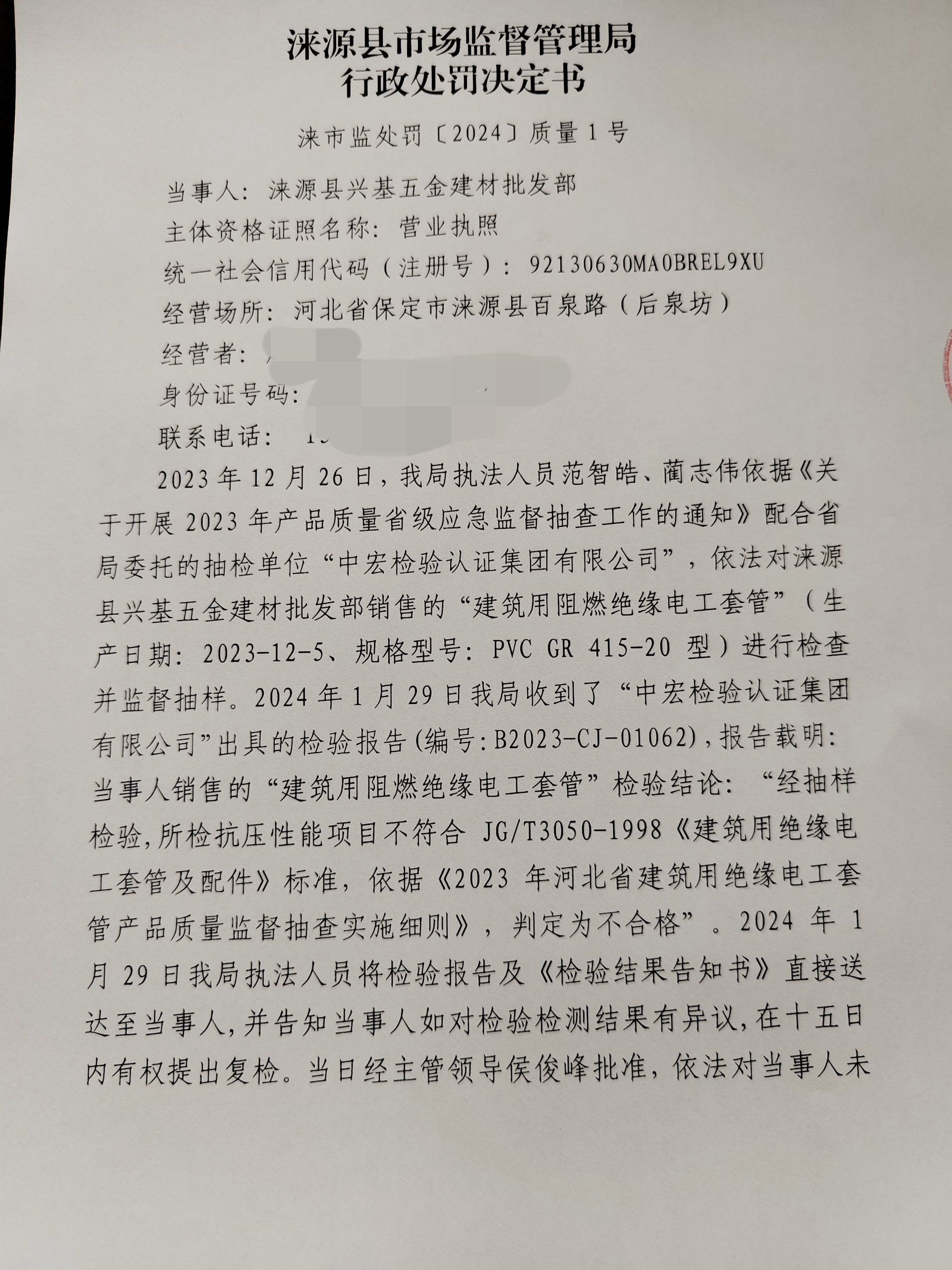 涞市监处罚〔2024〕质量1号,涞源县兴基五金建材批发部销售不合格“建筑用阻燃绝缘电工套管”案