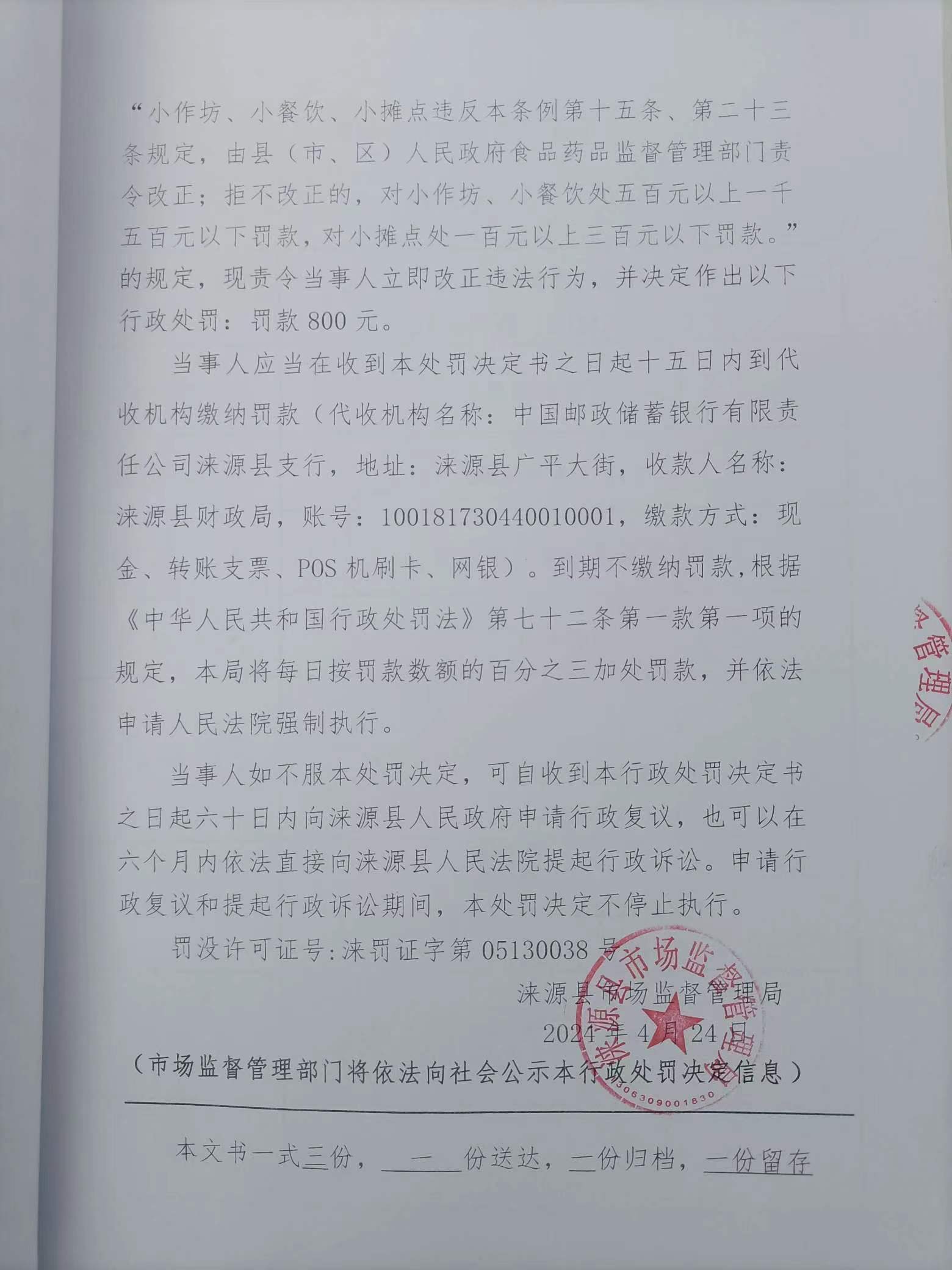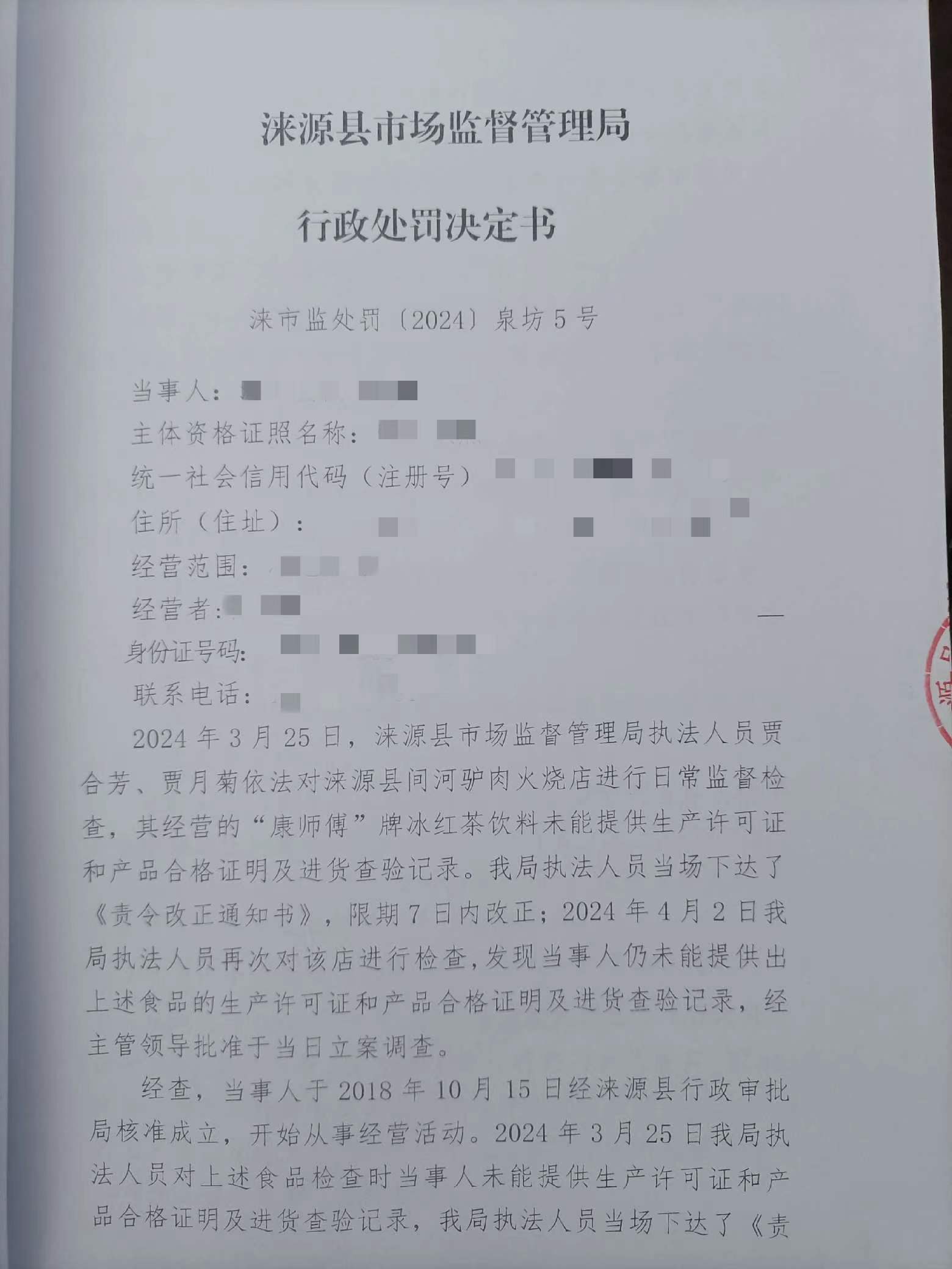 涞市监 〔2024〕泉坊5号涞源县间河驴肉火烧店购进食品未按规定建立进货查验记录制度案