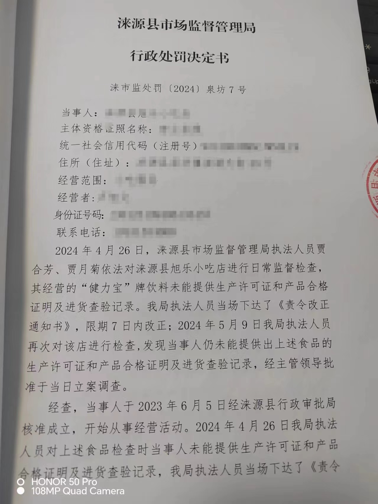 涞市监〔2024〕泉坊7号涞源县旭乐小吃店购进食品未按规定建立进货查验记录制度案