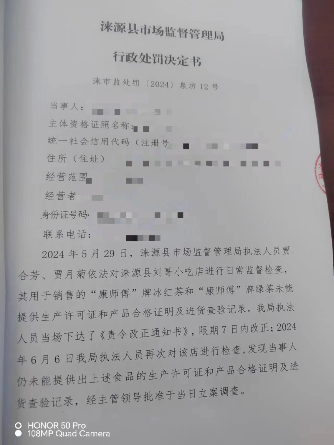 涞市监处罚〔2024〕泉坊12号涞源县刘哥小吃店购进食品未按规定建立进货查验记录制度案