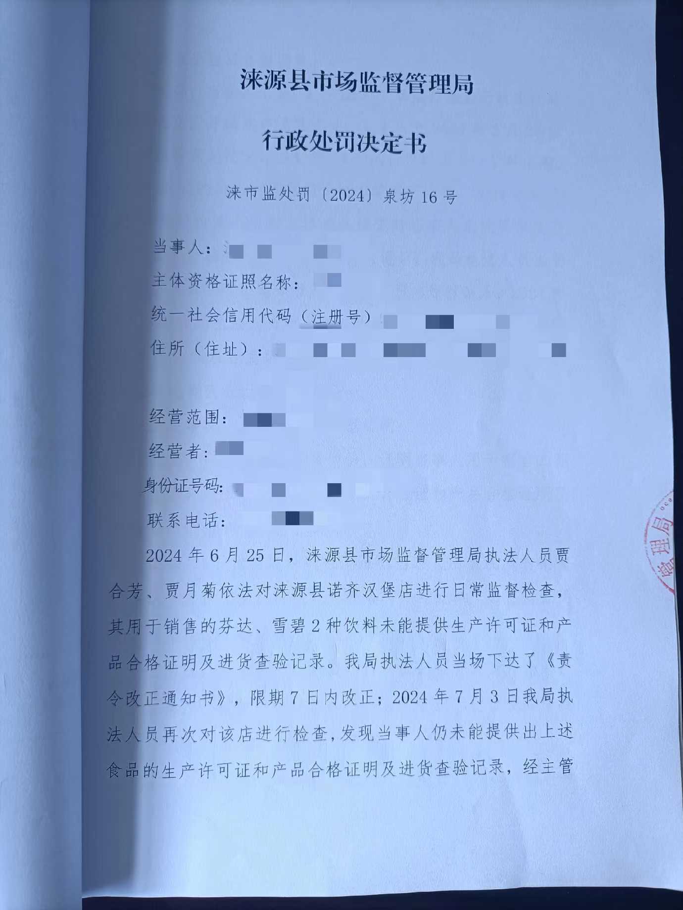涞市监 〔2024〕泉坊16号涞源县诺齐汉堡店购进食品未按规定建立进货查验记录制度案