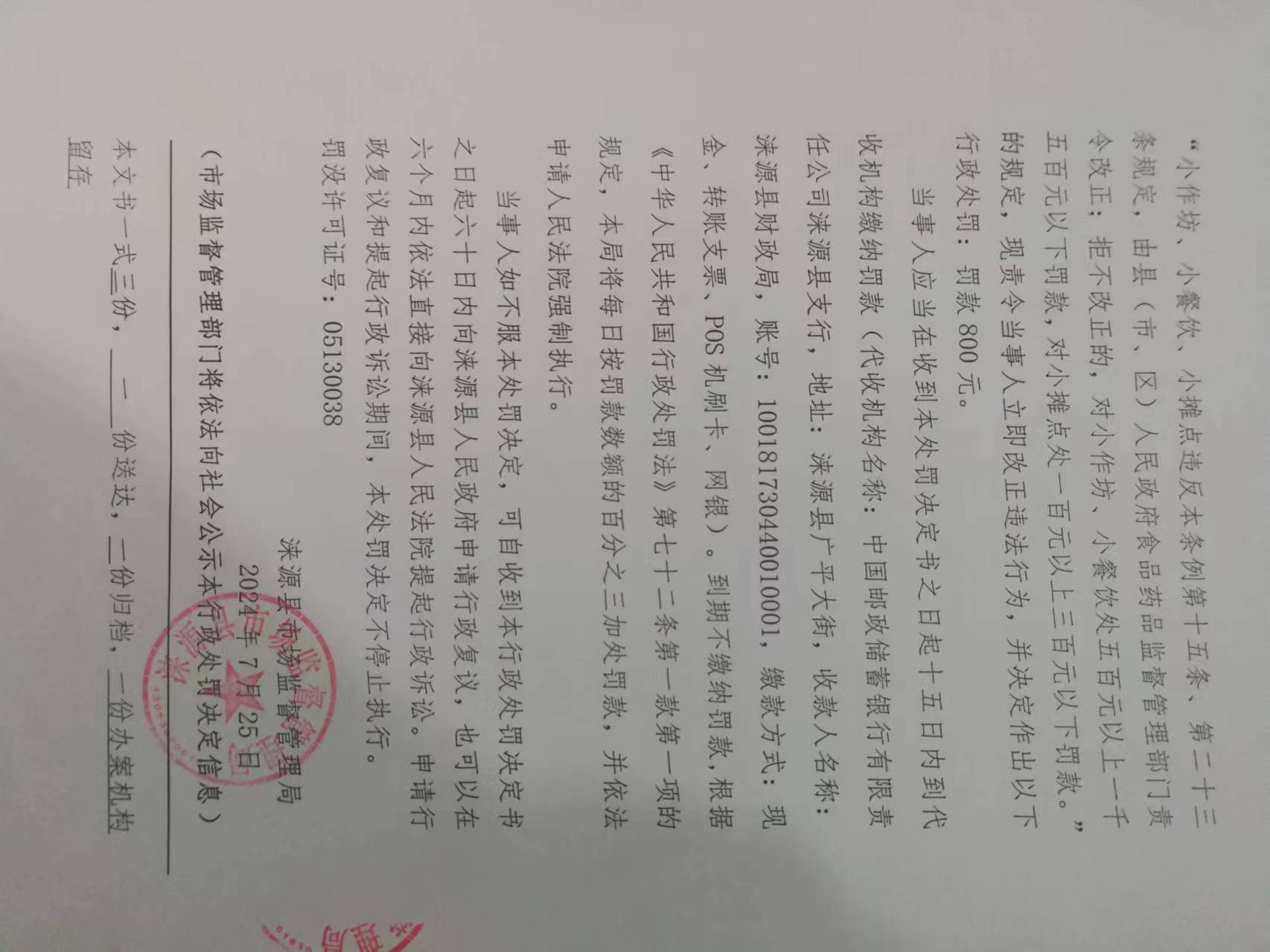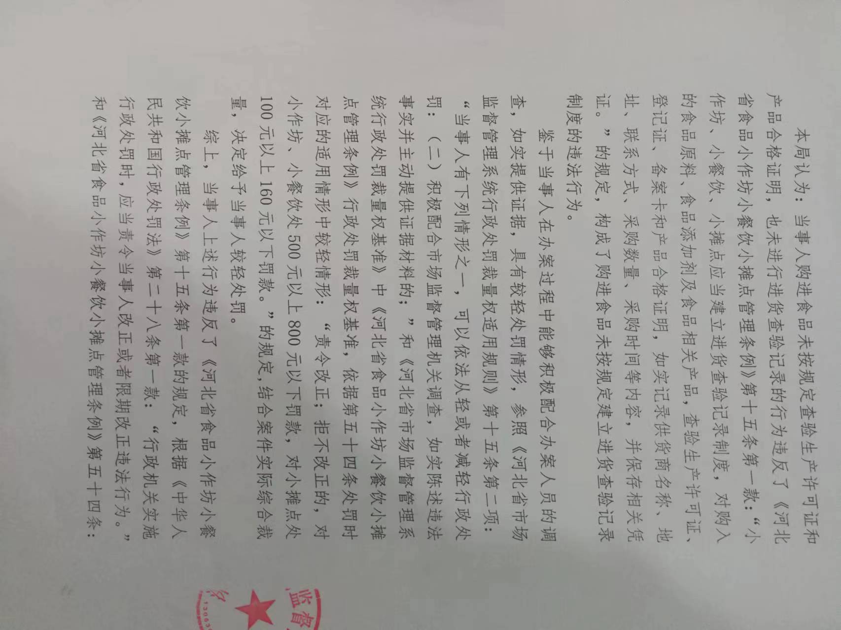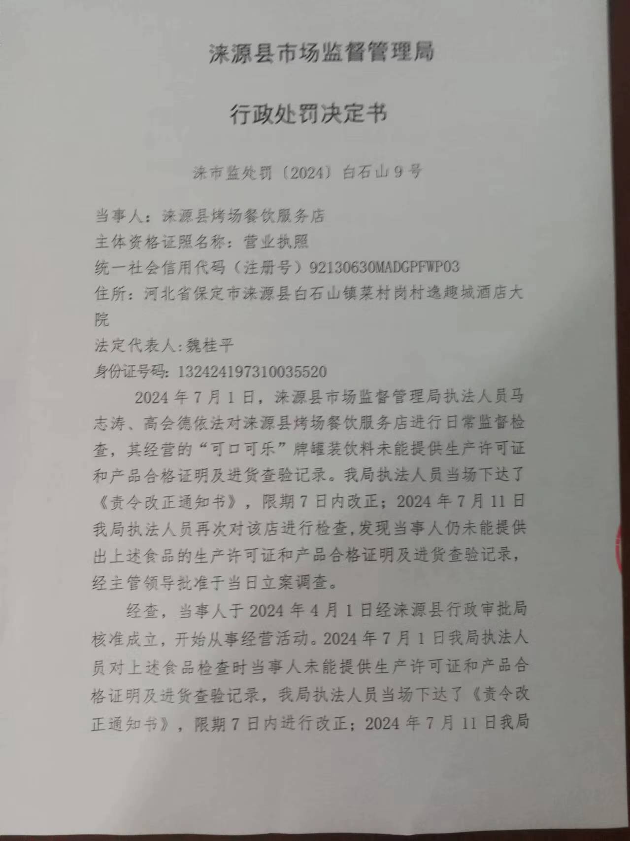 涞市监处罚〔2024〕白石山9号 涞源县烤场餐饮服务店购进食品未按规定建立进货查验记录制度案