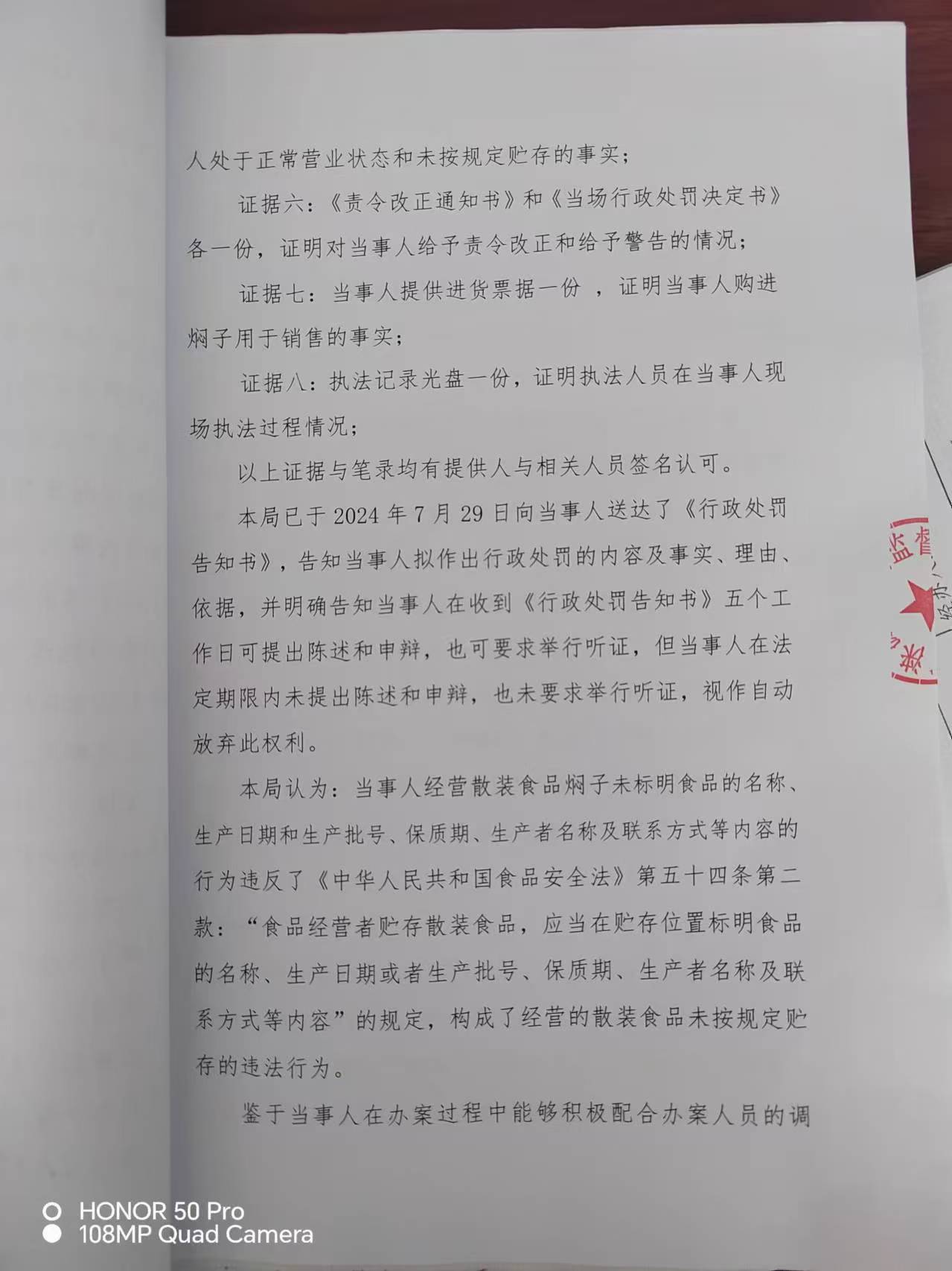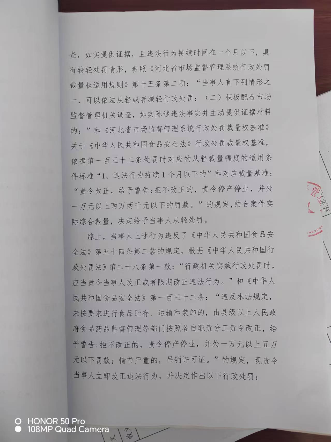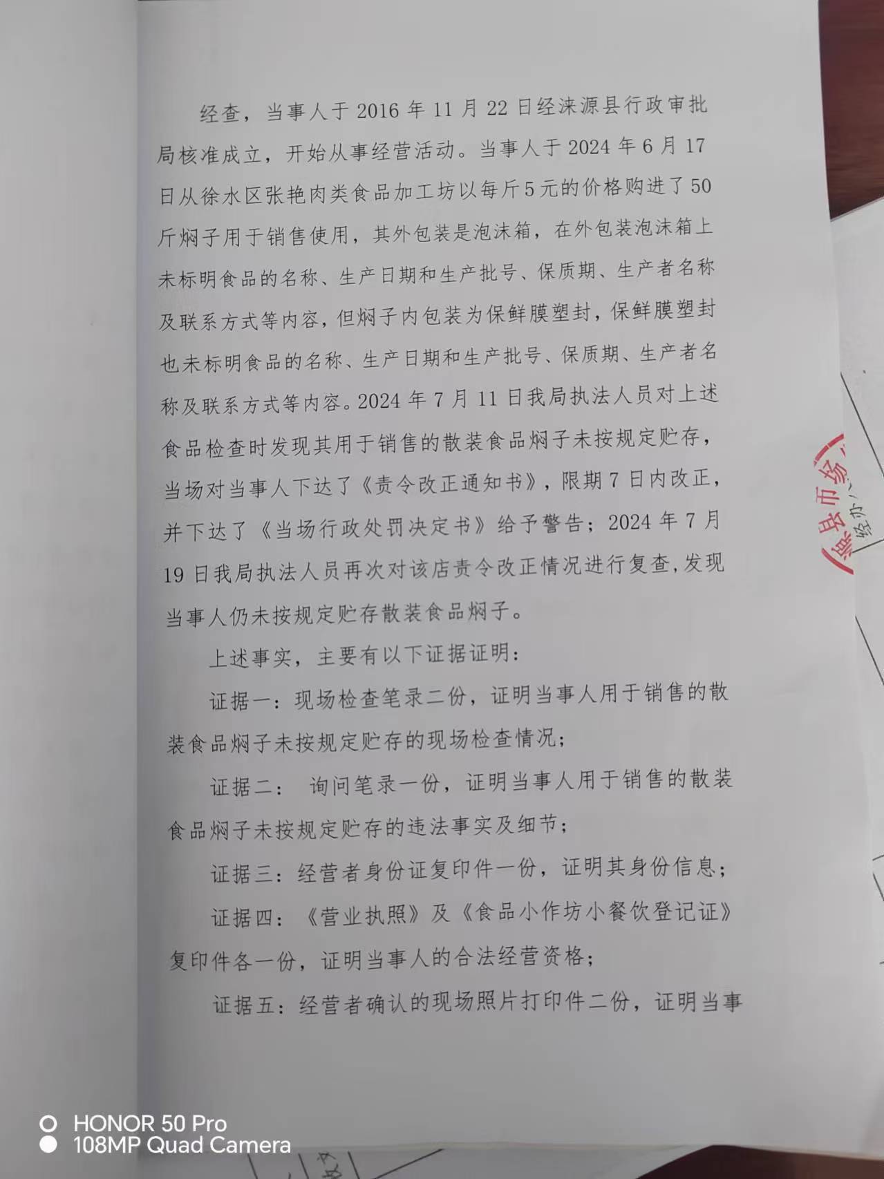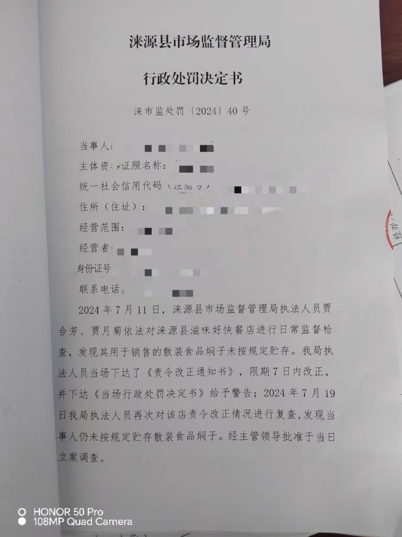 涞市监处罚〔2024〕40号涞源县滋味好快餐店经营的散装食品未按规定贮存案
